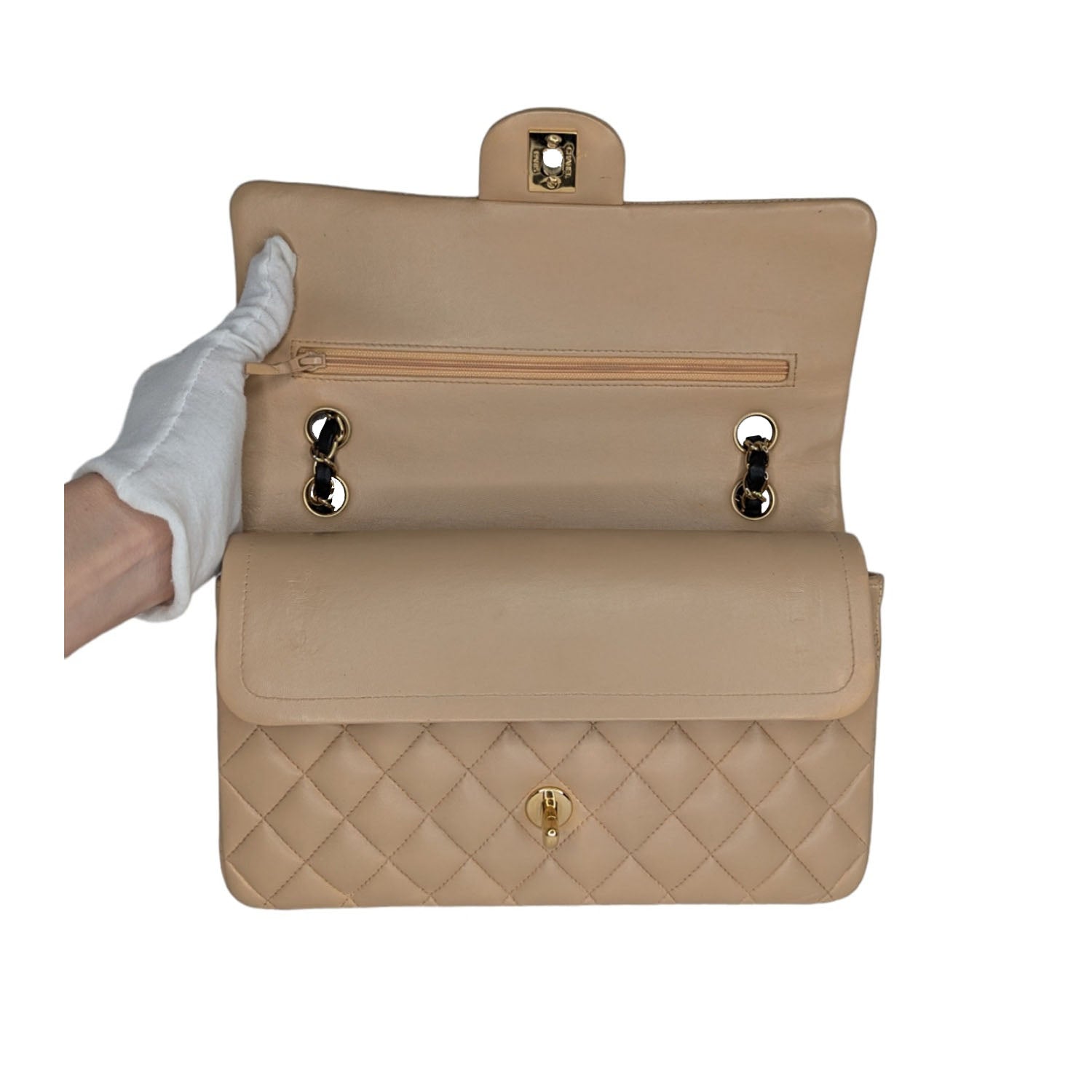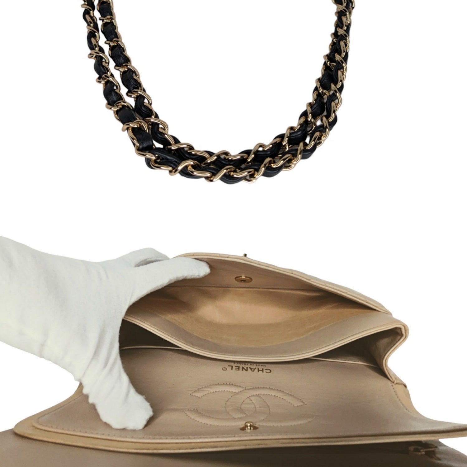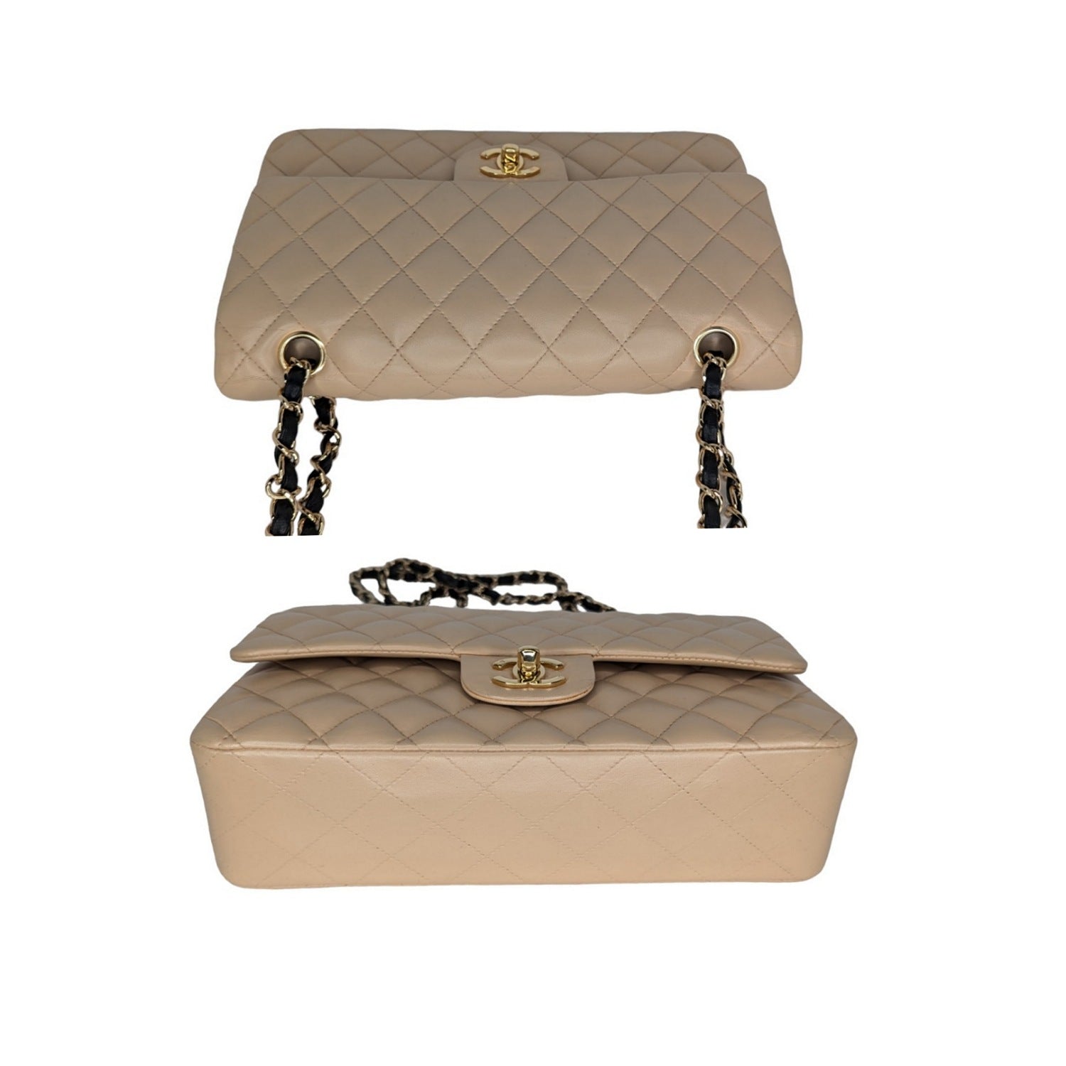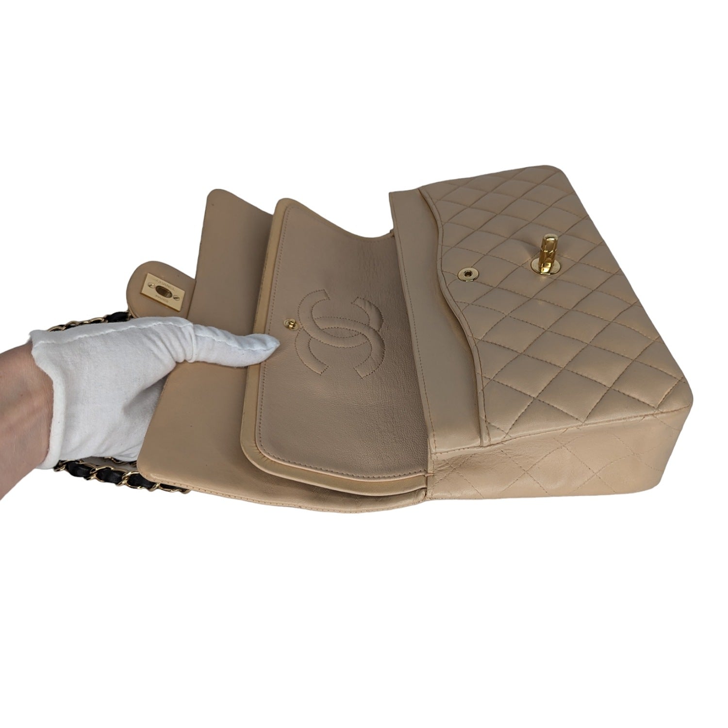 From the 2005 Collection by Karl Lagerfeld; Chanel Classic Lambskin Quilted Medium Double Flap. This stylish vintage flap bag is finely crafted of diamond quilted lambskin leather in beige. The bag features a gold chain and black leather threaded shoulder strap and 24K gold-plated Chanel CC logo turn-lock on the flap. This opens to a spacious matching leather interior with plenty compartments and patch pockets. 10,800.