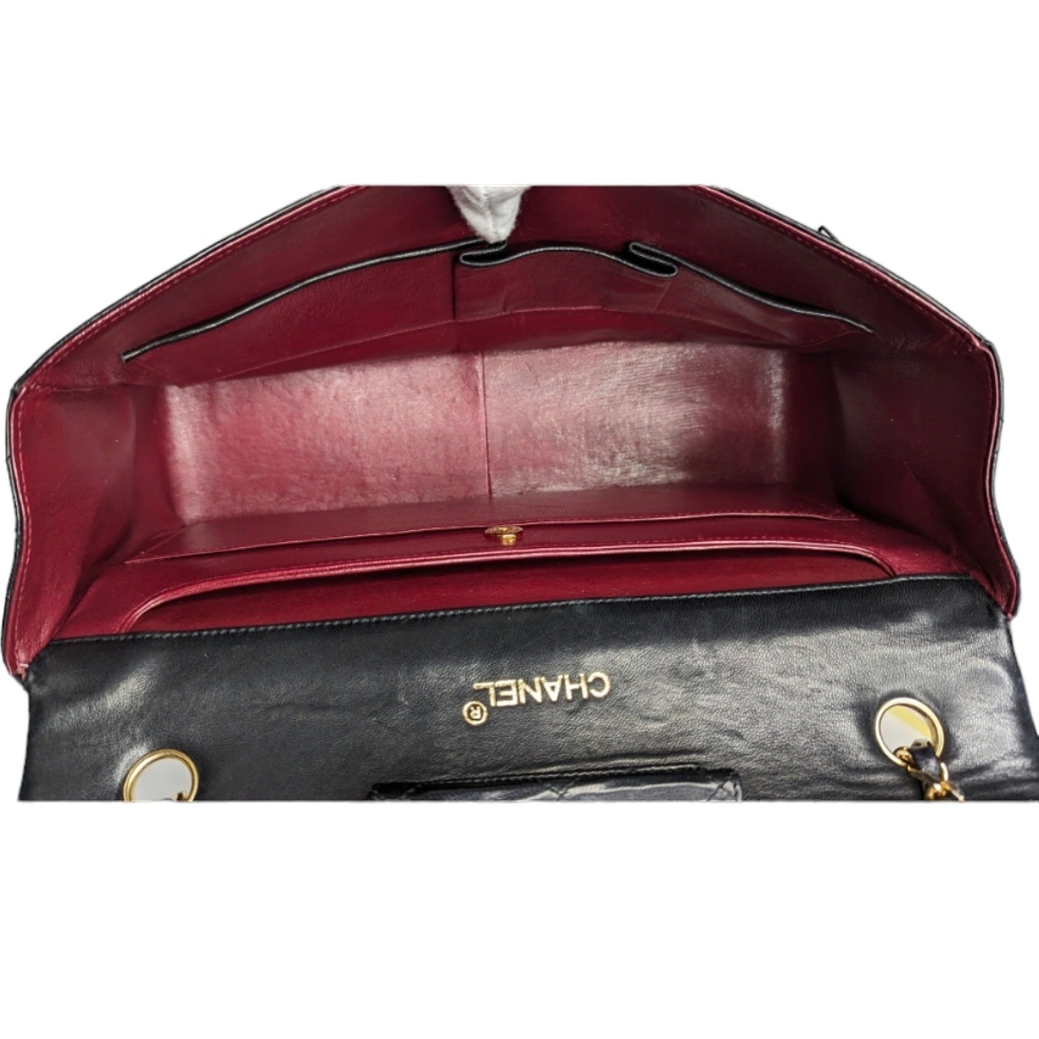 From the 1989-1991 Collection by Karl Lagerfeld; Chanel Lambskin Quilted Medium Single Flap with Wallet. This stylish vintage flap bag is finely crafted of diamond quilted lambskin leather in black. The bag features a gold chain leather threaded shoulder strap and gold plated Chanel CC logo on the flap. This opens to a burgundy leather interior with plenty compartments, patch pockets and a removable insert.