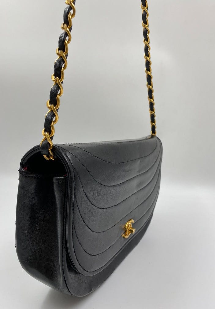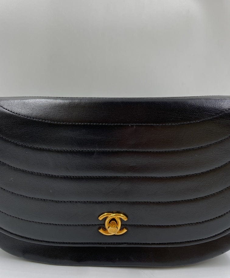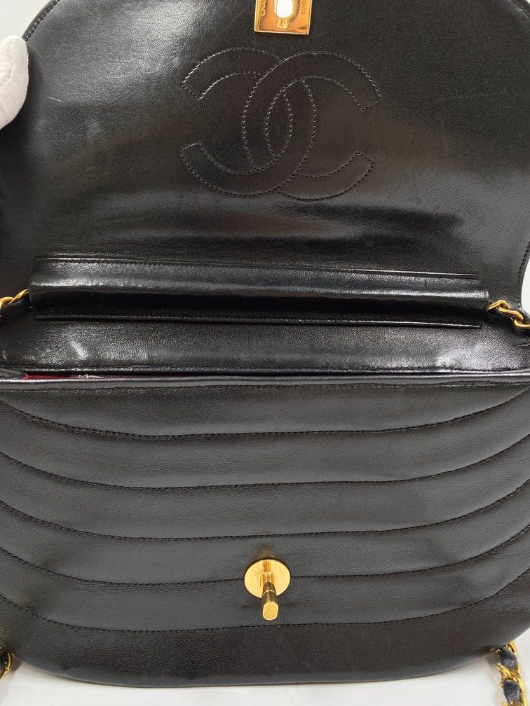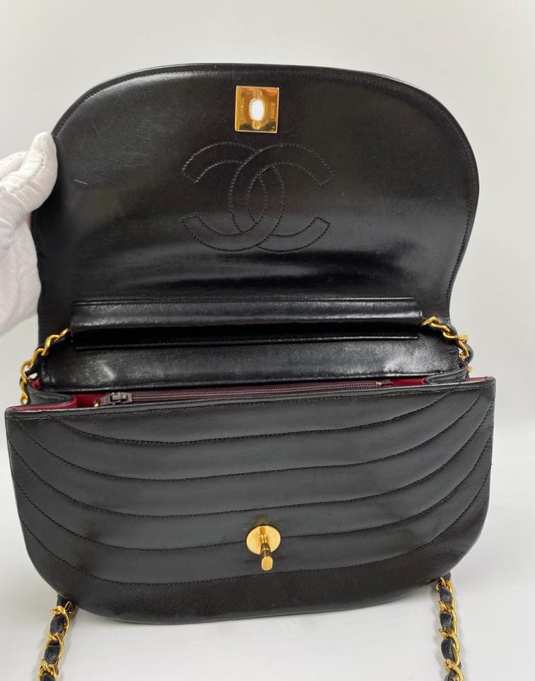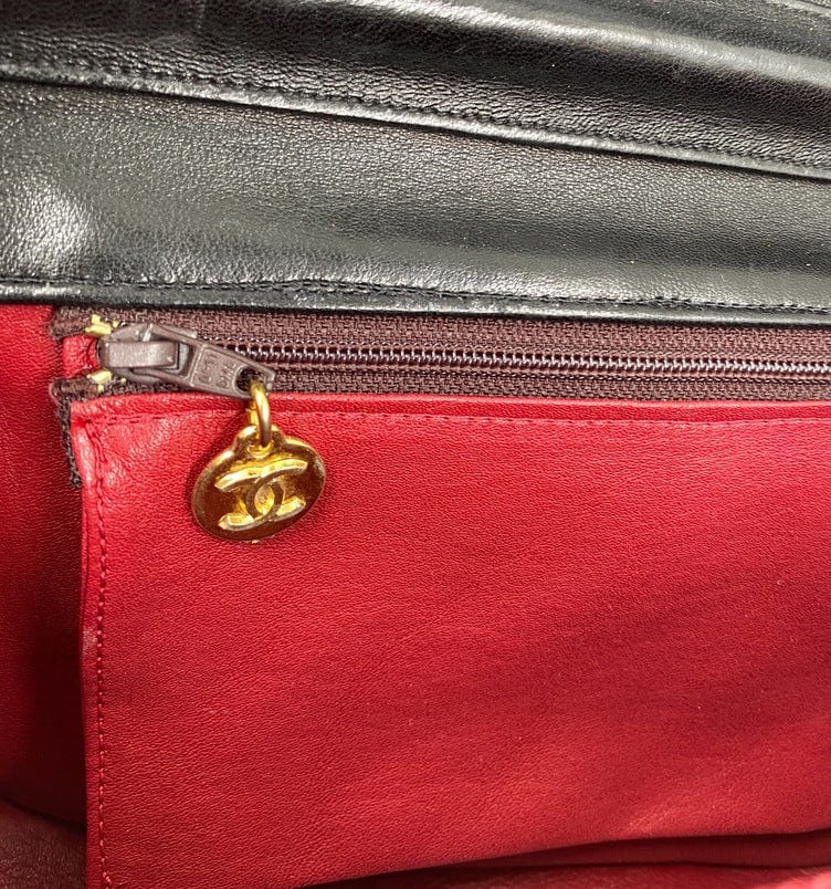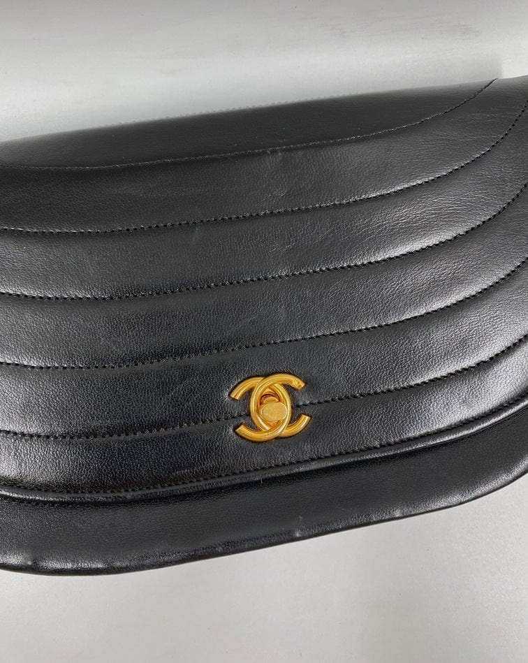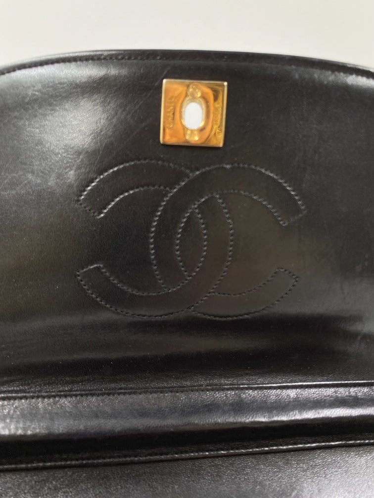 A beautiful vintage black flap Chanel crossbody bag with the iconic CC turn lock. There is a hallmark on the turn lock showing us that the gold hardware is plated in 24k gold. Chanel stopped plating with real gold in late 2008. There are some lovely Chanel branding details on this bag, under the flap the CC is stitched under the flap. Inside the bag the gold CC charm is still intact on the inner zip. From the serial number we know this bag was made between 1986-1988.