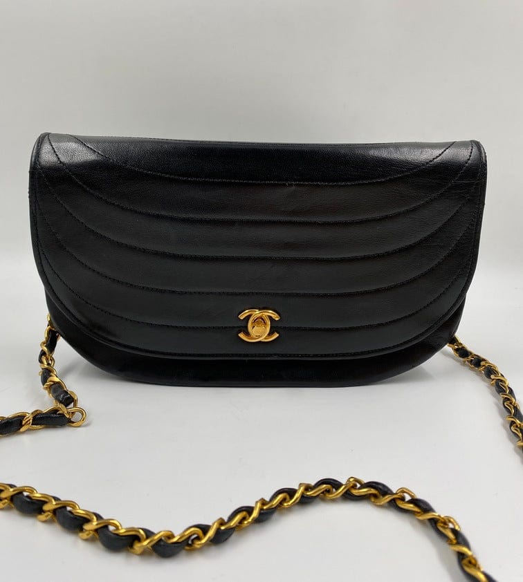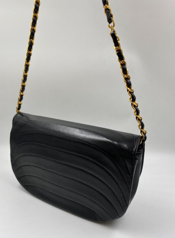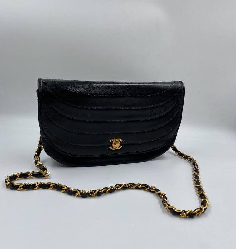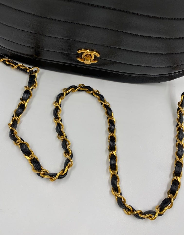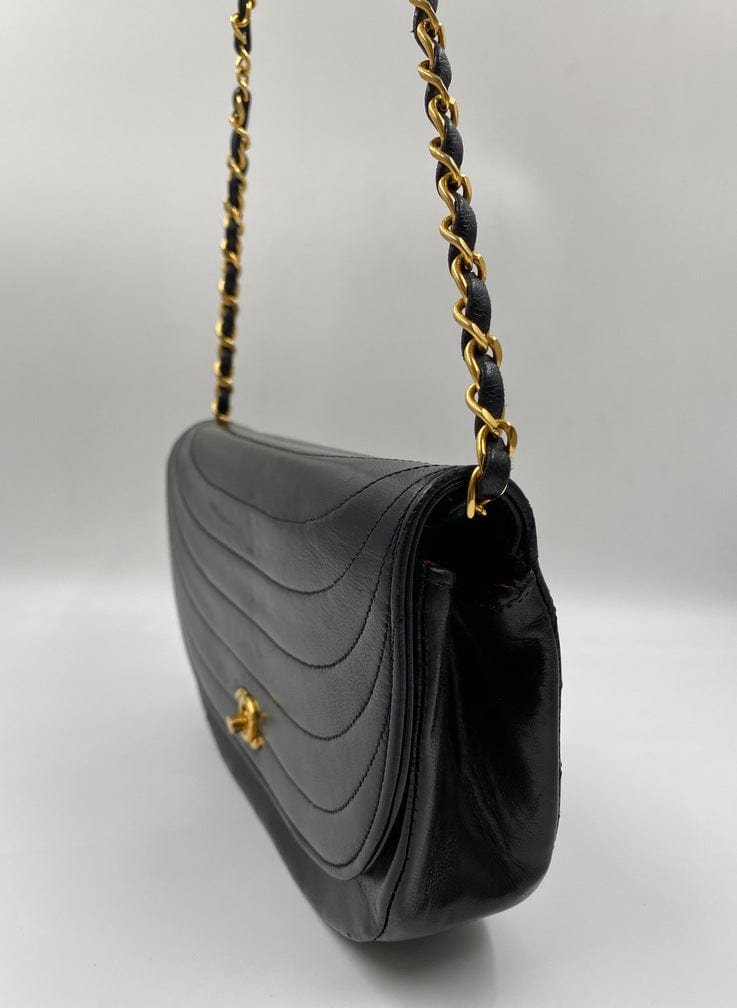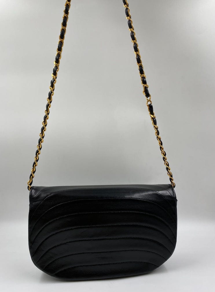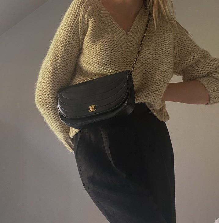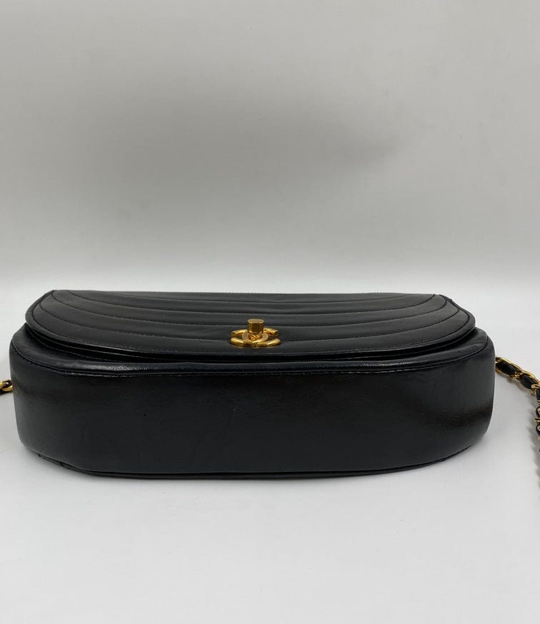 A beautiful vintage black flap Chanel crossbody bag with the iconic CC turn lock. There is a hallmark on the turn lock showing us that the gold hardware is plated in 24k gold. Chanel stopped plating with real gold in late 2008. There are some lovely Chanel branding details on this bag, under the flap the CC is stitched under the flap. Inside the bag the gold CC charm is still intact on the inner zip. From the serial number we know this bag was made between 1986-1988.