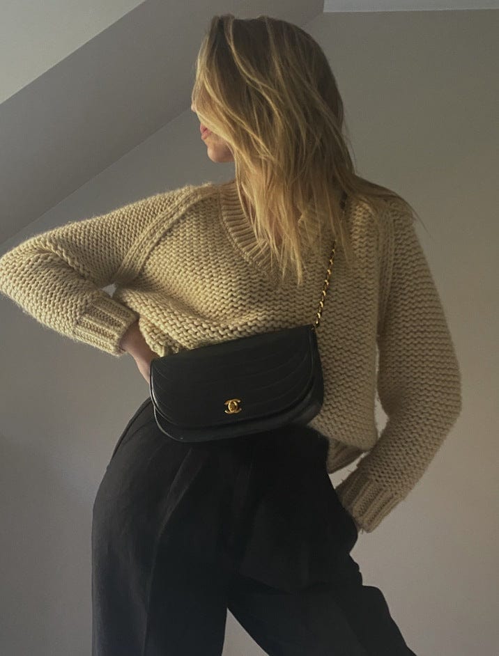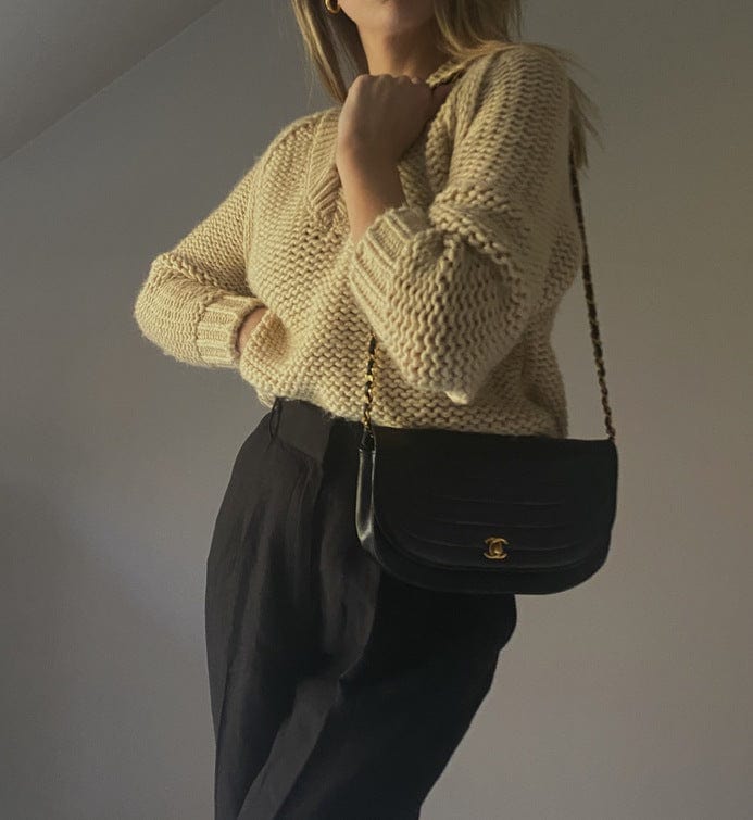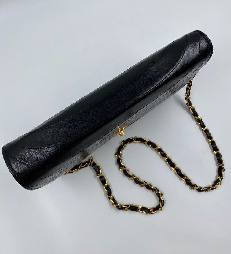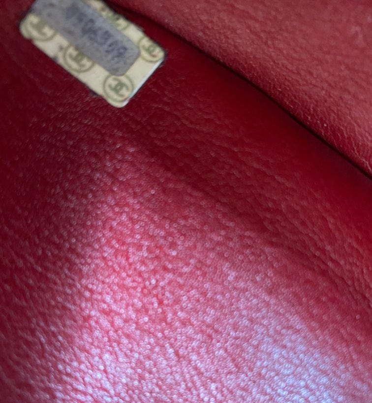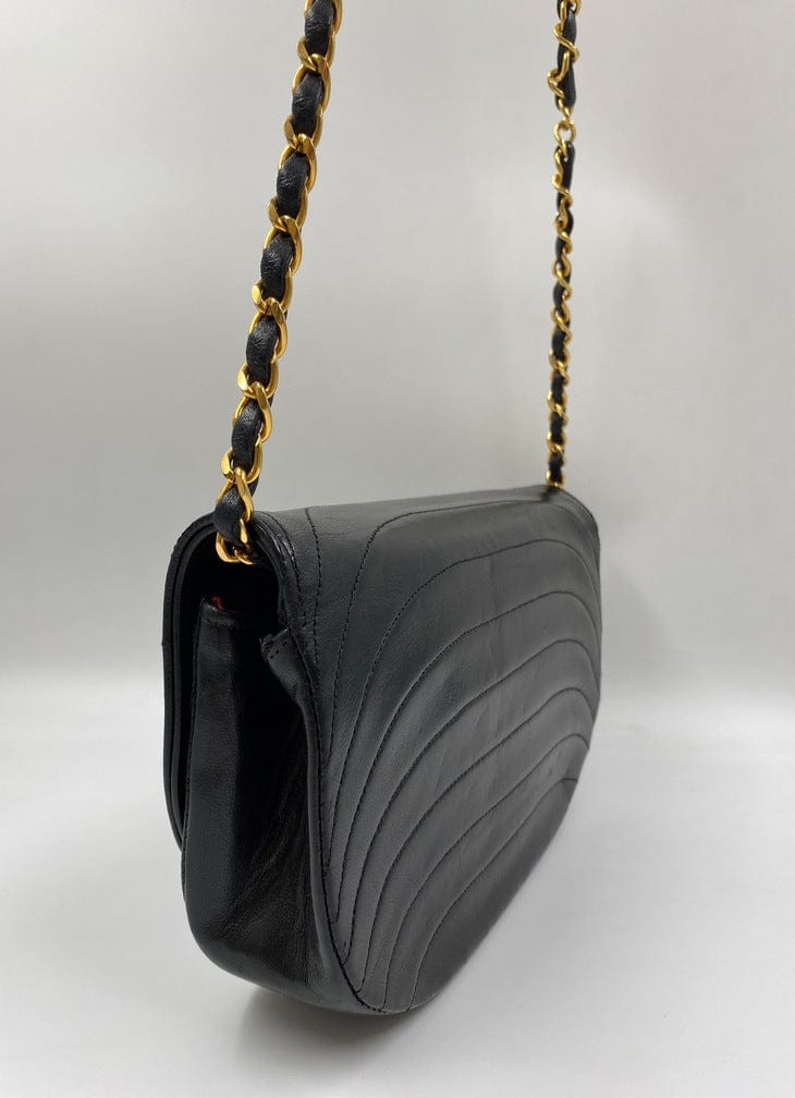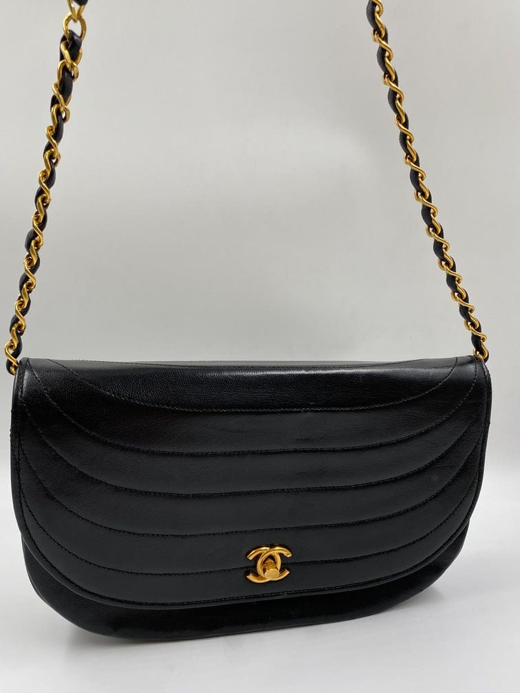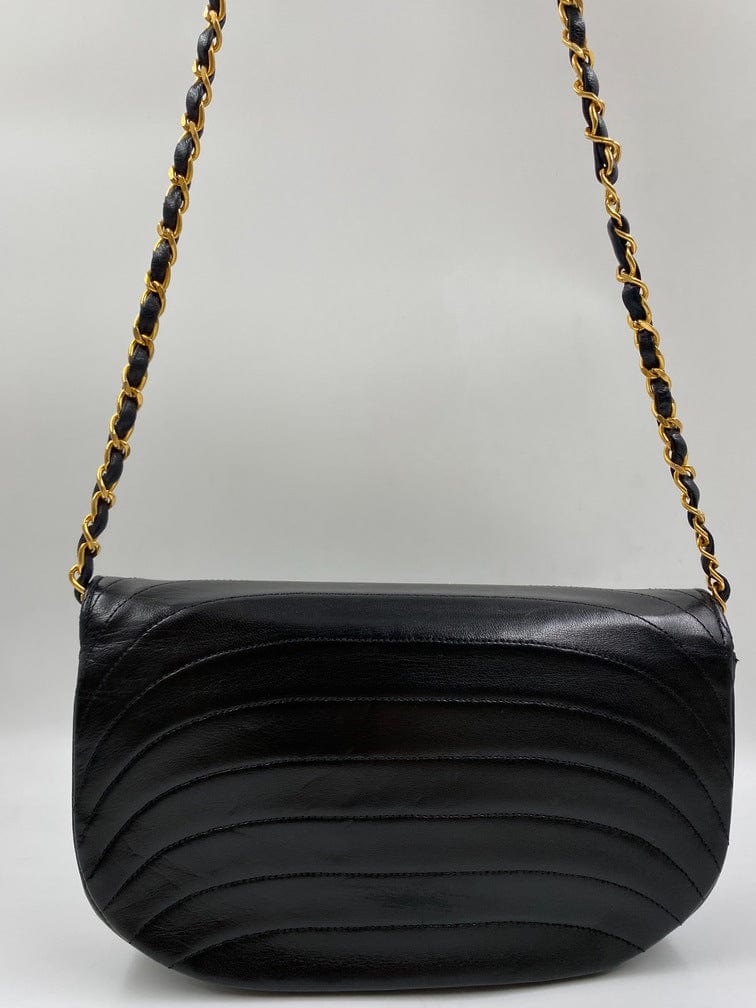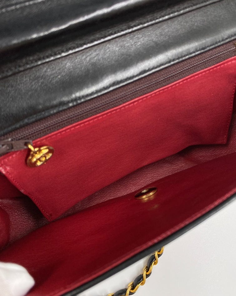 A beautiful vintage black flap Chanel crossbody bag with the iconic CC turn lock. There is a hallmark on the turn lock showing us that the gold hardware is plated in 24k gold. Chanel stopped plating with real gold in late 2008. There are some lovely Chanel branding details on this bag, under the flap the CC is stitched under the flap. Inside the bag the gold CC charm is still intact on the inner zip. From the serial number we know this bag was made between 1986-1988.