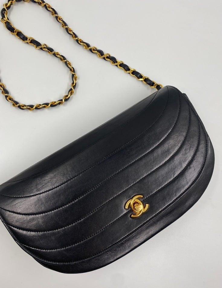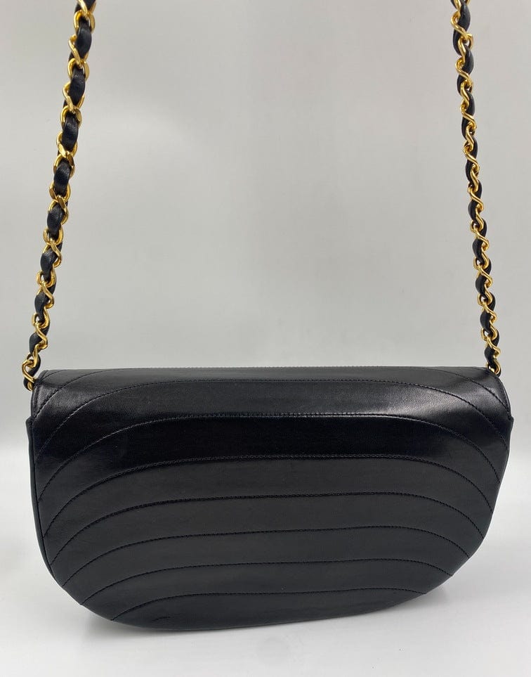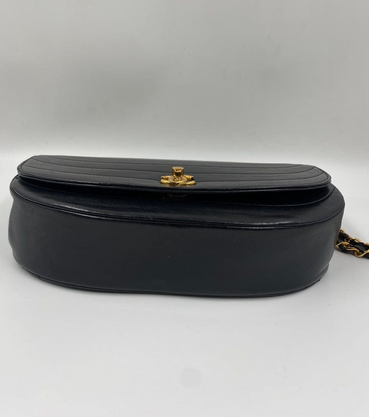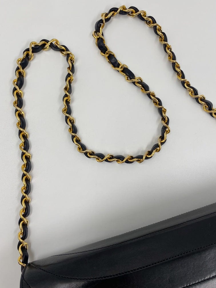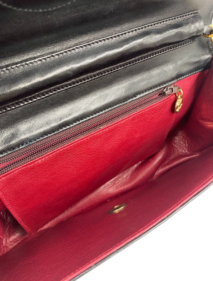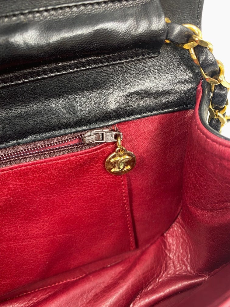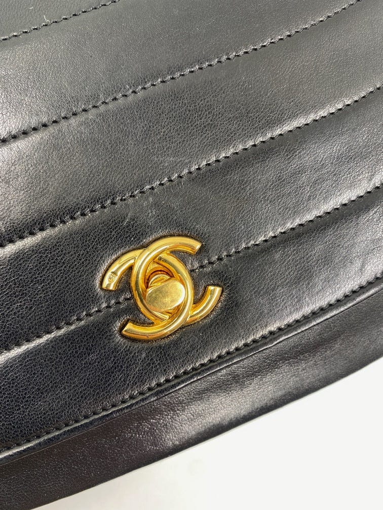 A beautiful vintage black flap Chanel crossbody bag with the iconic CC turn lock. There is a hallmark on the turn lock showing us that the gold hardware is plated in 24k gold. Chanel stopped plating with real gold in late 2008. There are some lovely Chanel branding details on this bag, under the flap the CC is stitched under the flap. Inside the bag the gold CC charm is still intact on the inner zip.