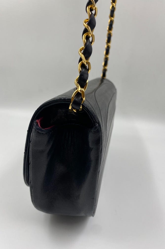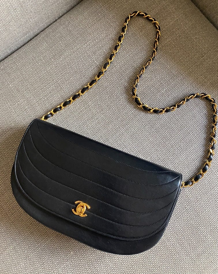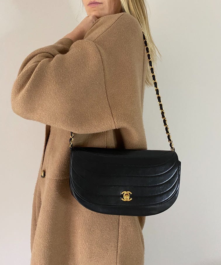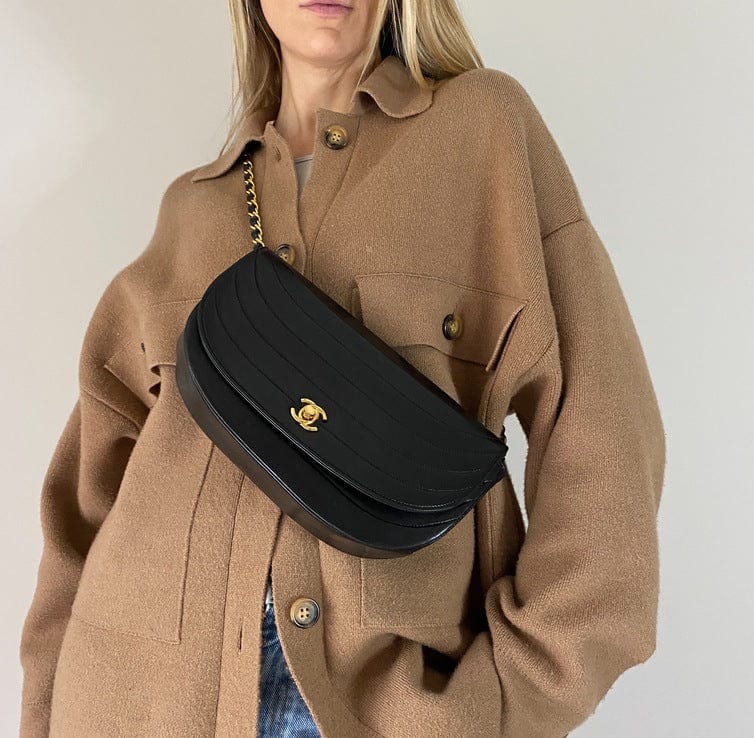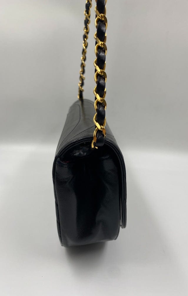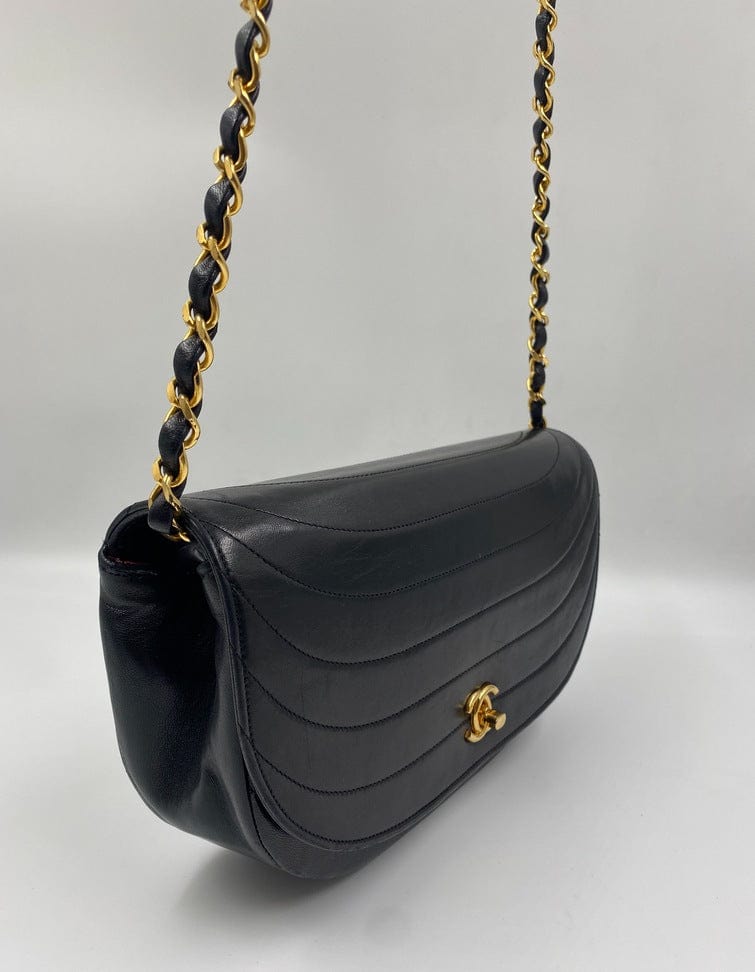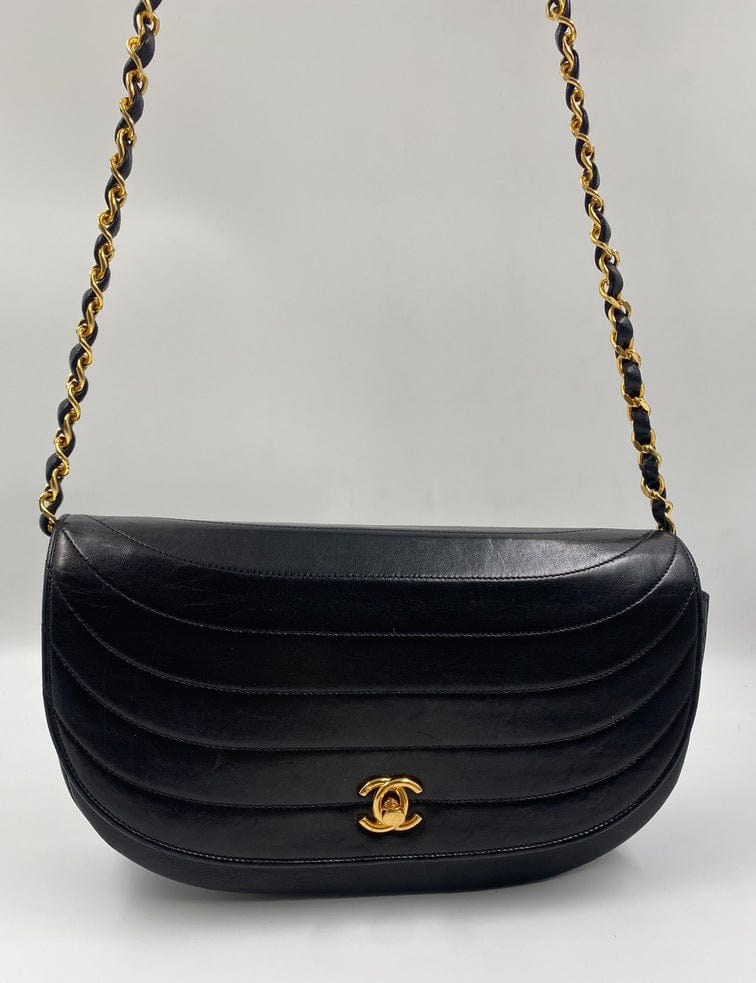 A beautiful vintage black flap Chanel crossbody bag with the iconic CC turn lock. There is a hallmark on the turn lock showing us that the gold hardware is plated in 24k gold. Chanel stopped plating with real gold in late 2008. There are some lovely Chanel branding details on this bag, under the flap the CC is stitched under the flap. Inside the bag the gold CC charm is still intact on the inner zip.