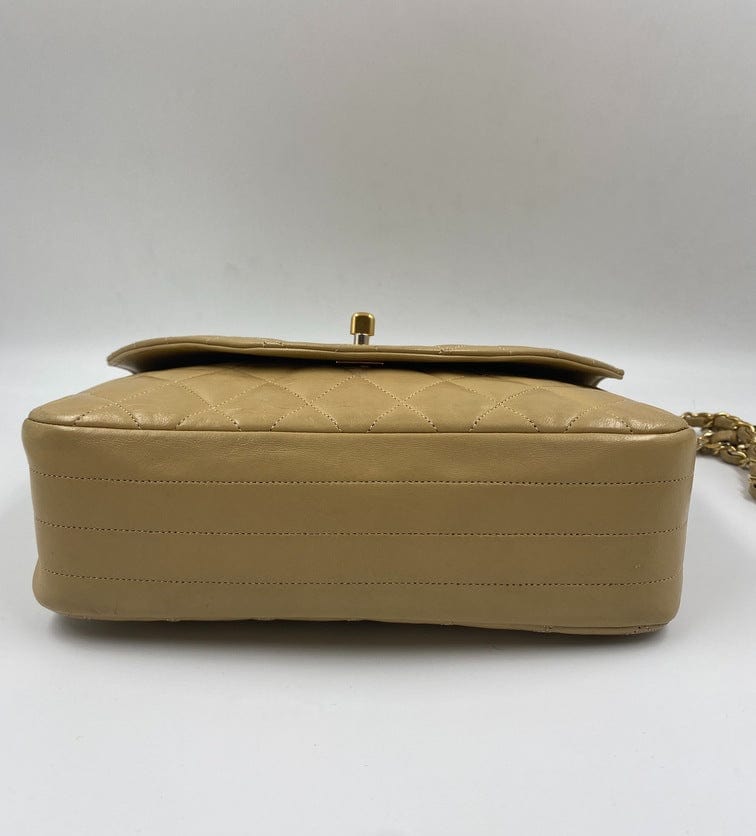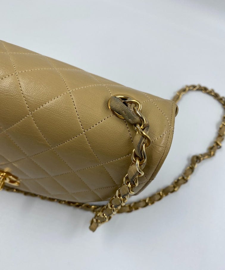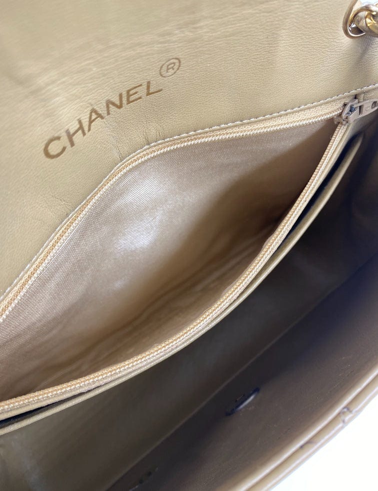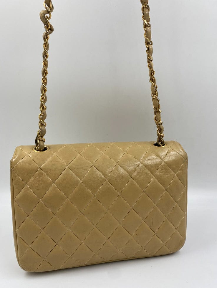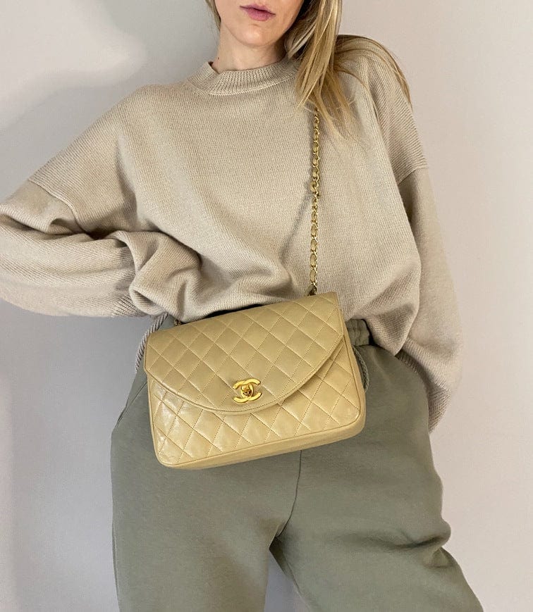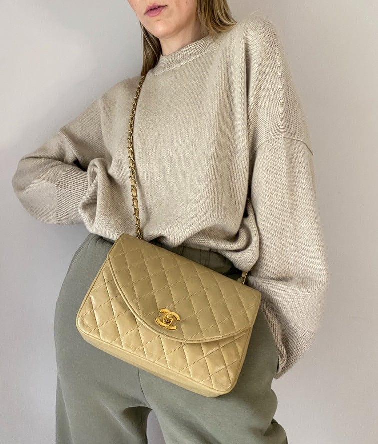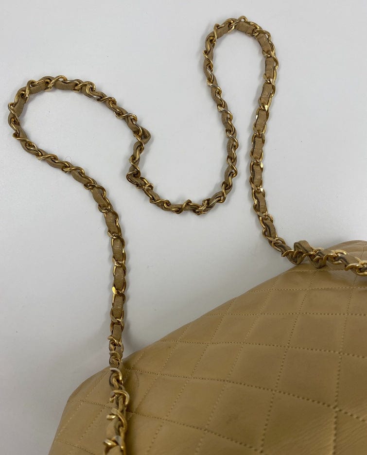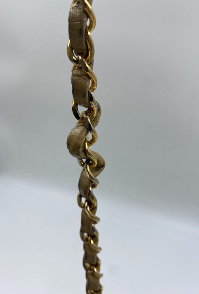 A beautiful vintage Chanel Flap bag crafted using beige leather with 24k gold plated hardware. The chain drop is 52cm so can be worn on both the shoulder and across the body.