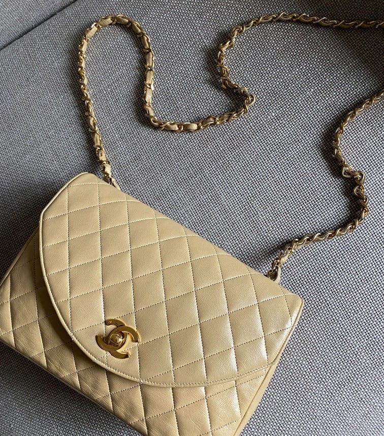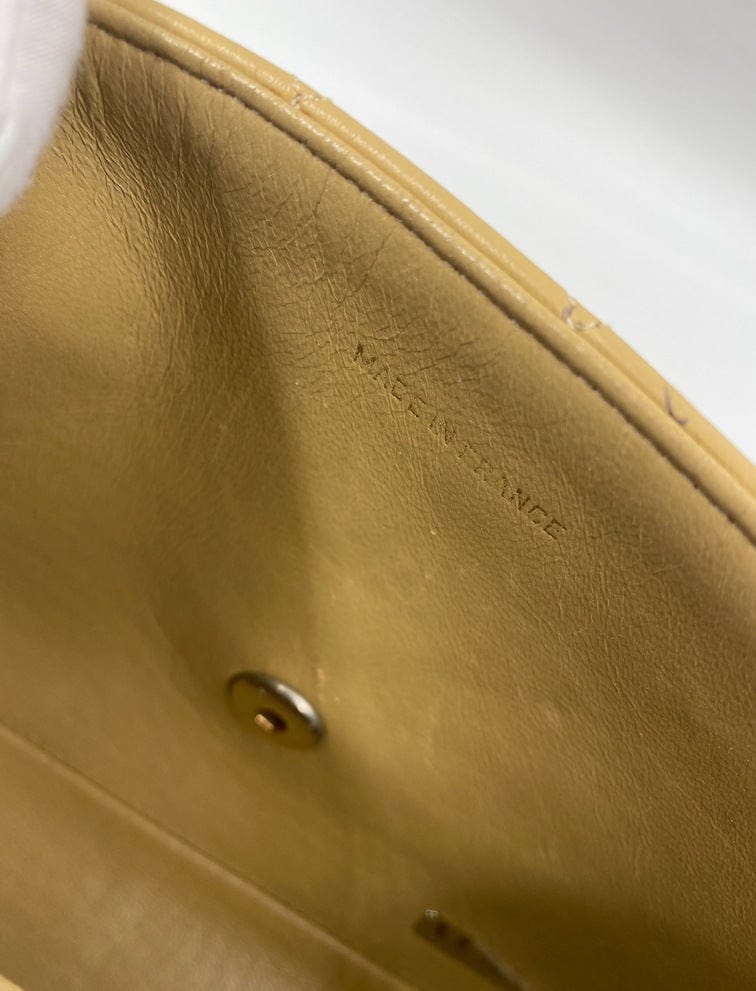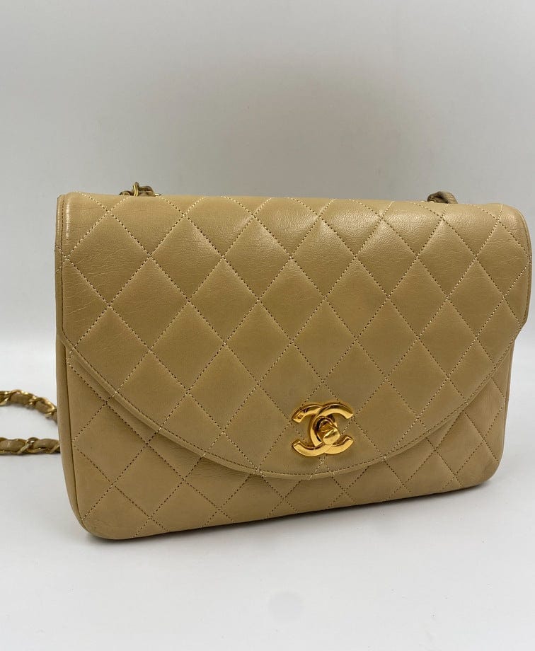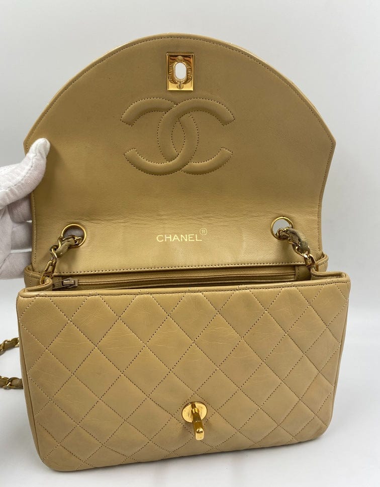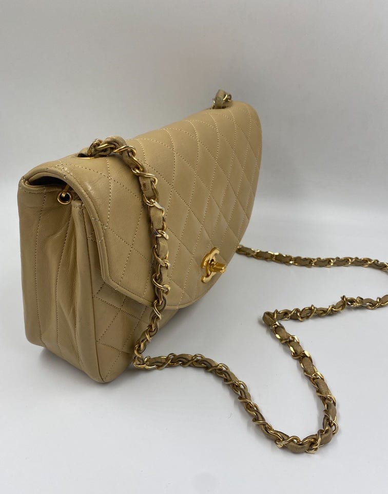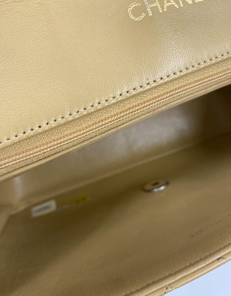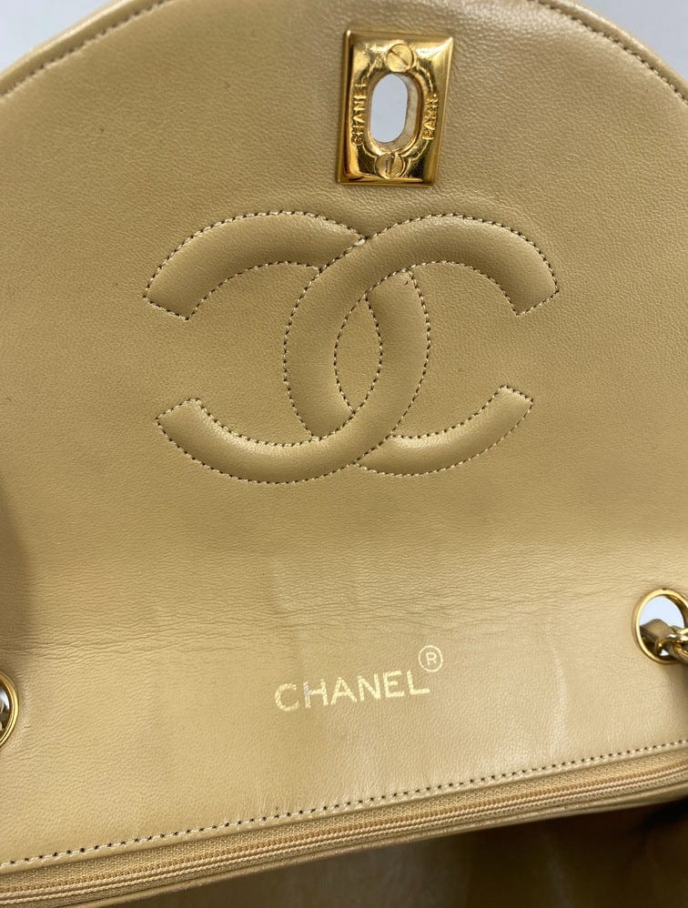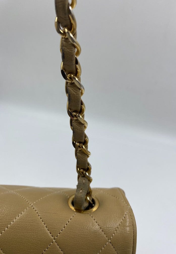 A beautiful vintage Chanel Flap bag crafted using beige leather with 24k gold plated hardware. The chain drop is 52cm so can be worn on both the shoulder and across the body.