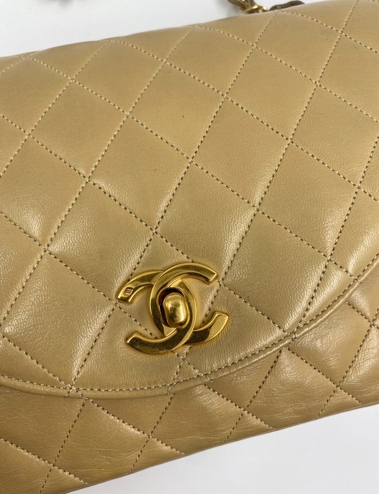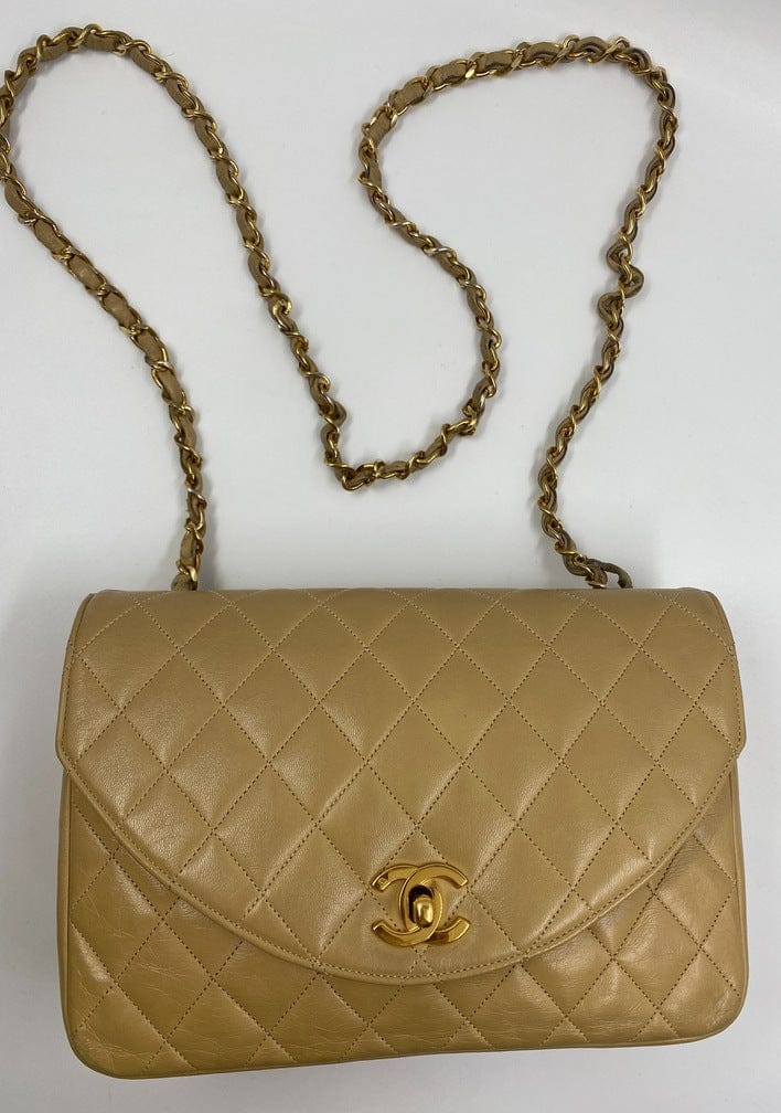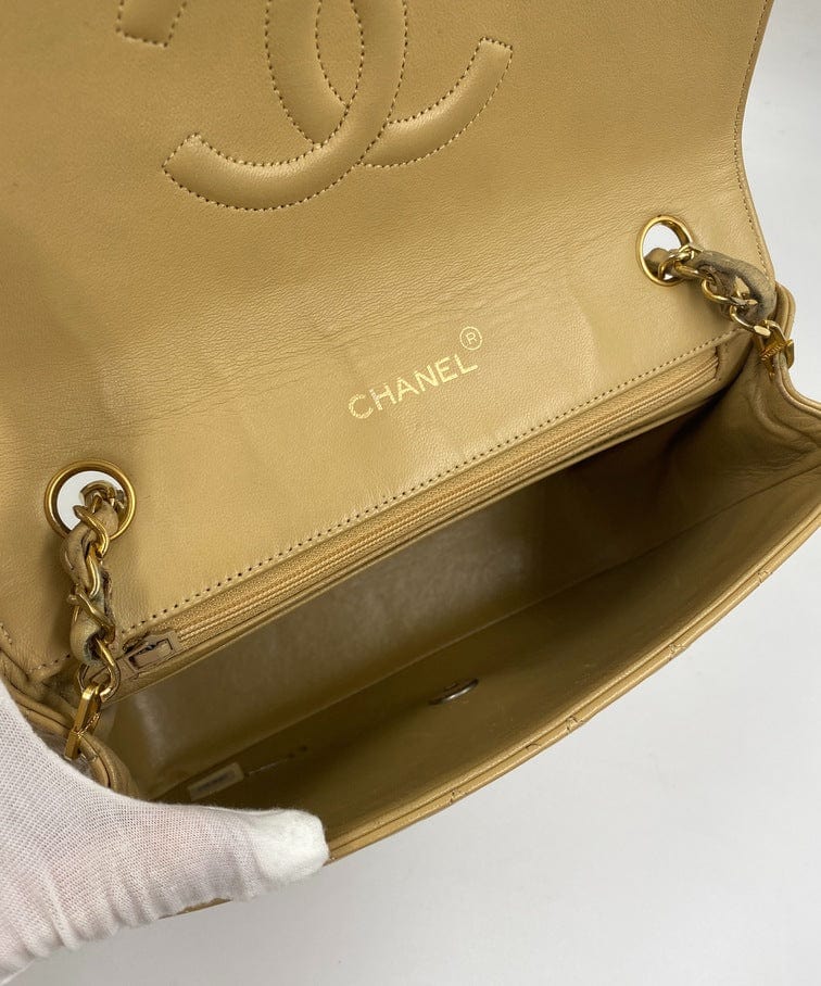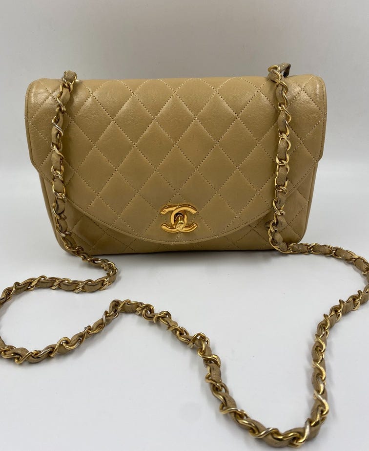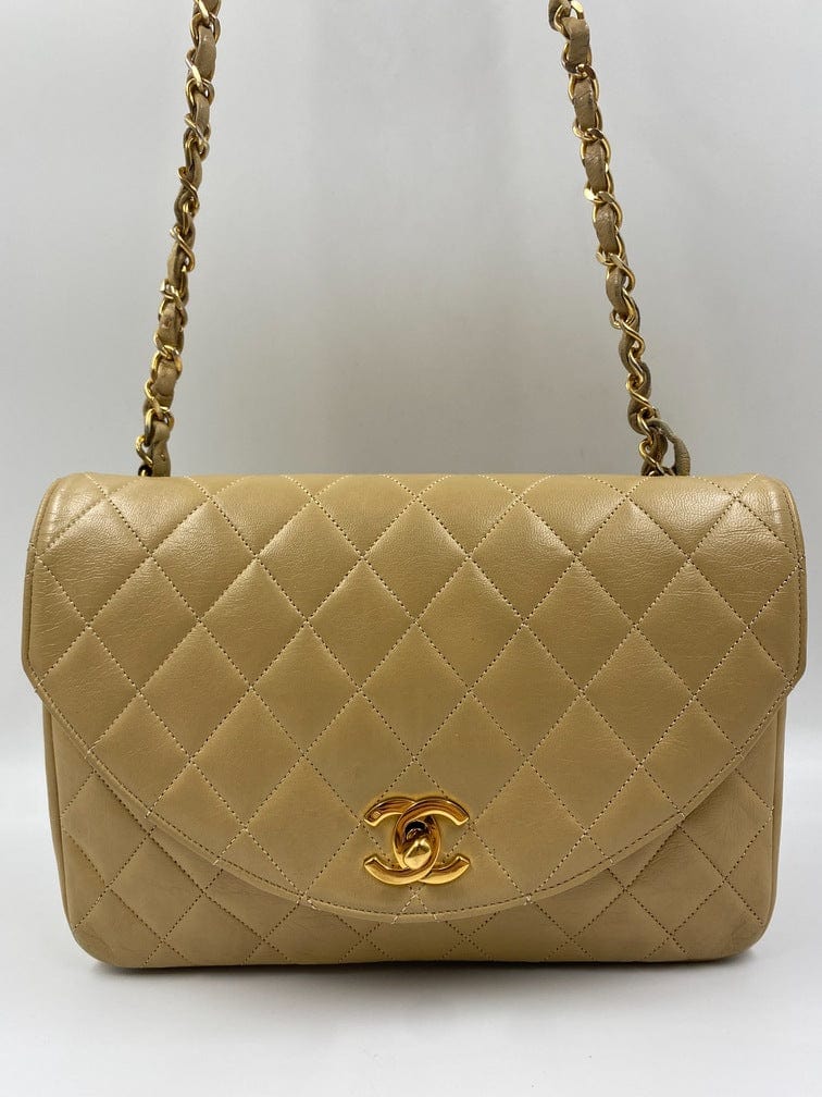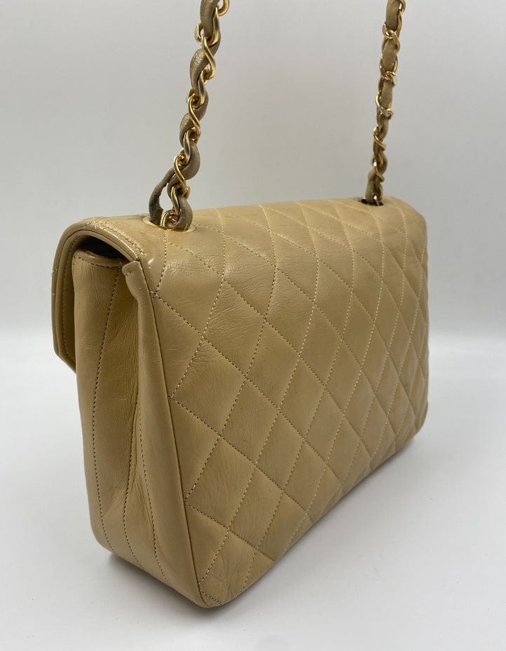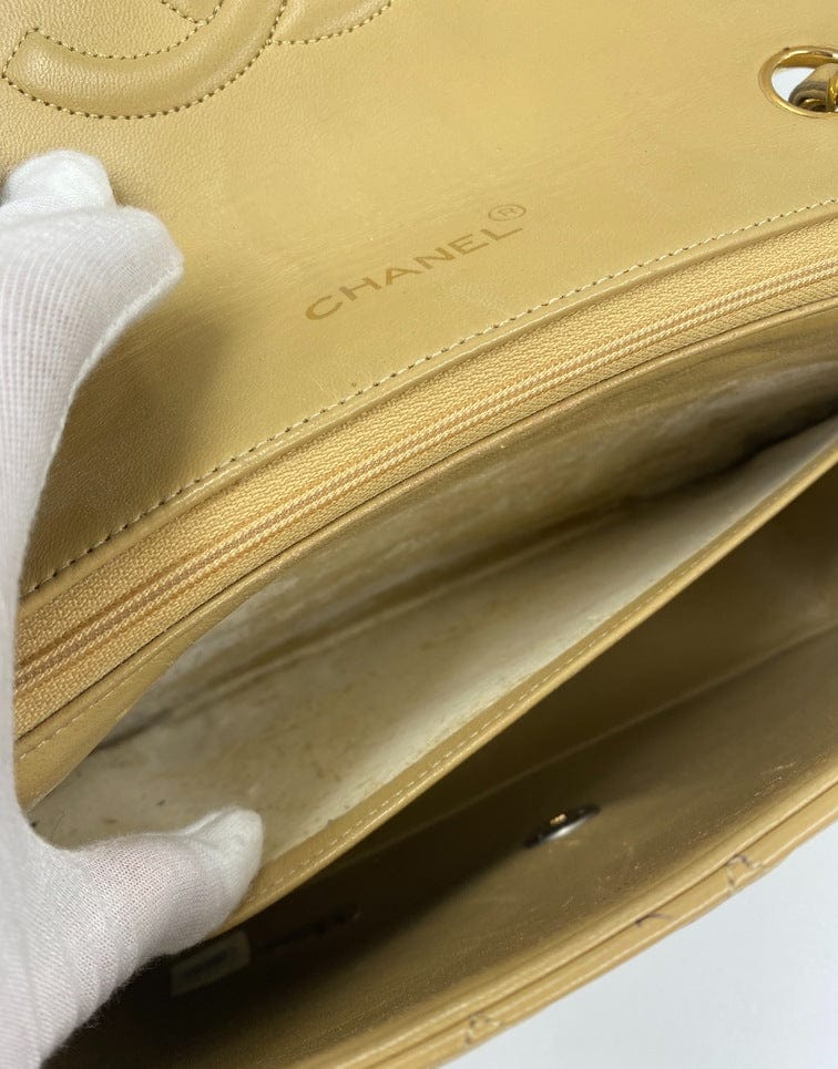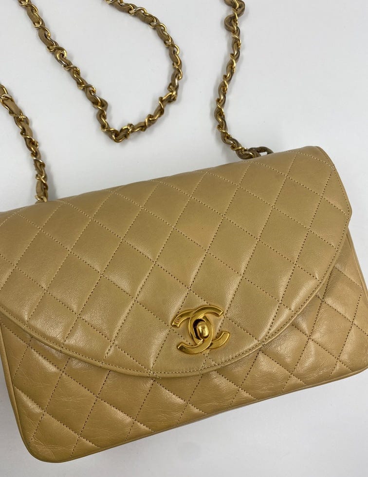 A beautiful vintage Chanel Flap bag crafted using beige leather with 24k gold plated hardware. The chain drop is 52cm so can be worn on both the shoulder and across the body.