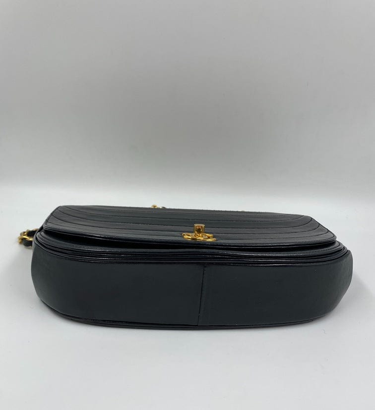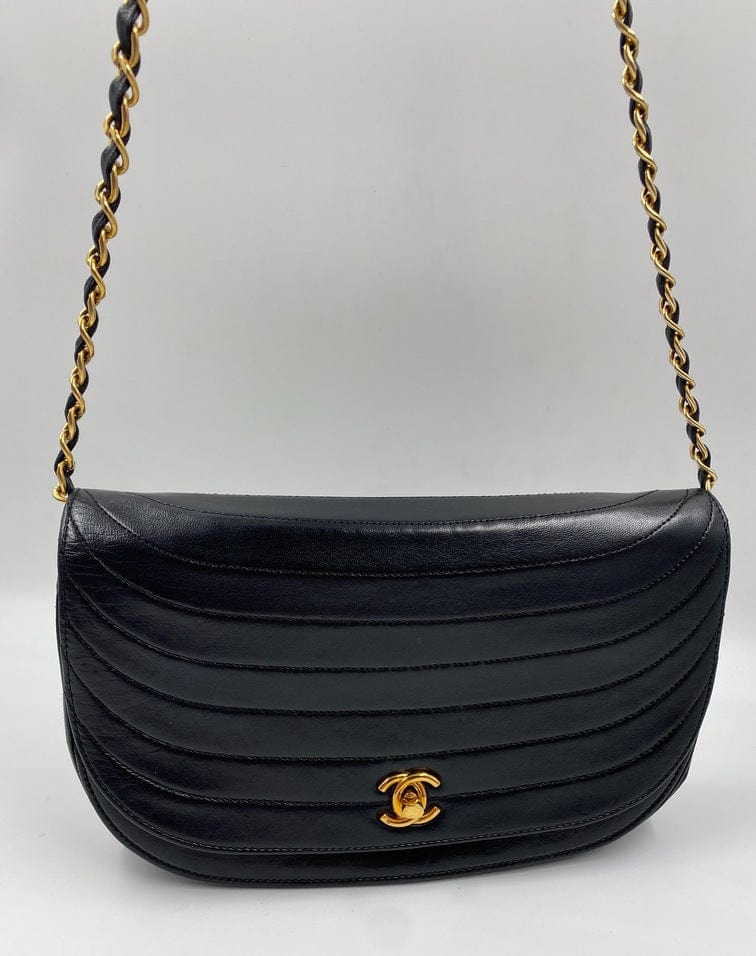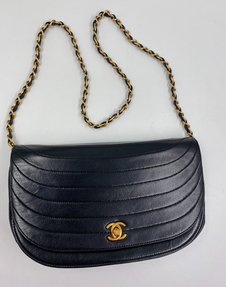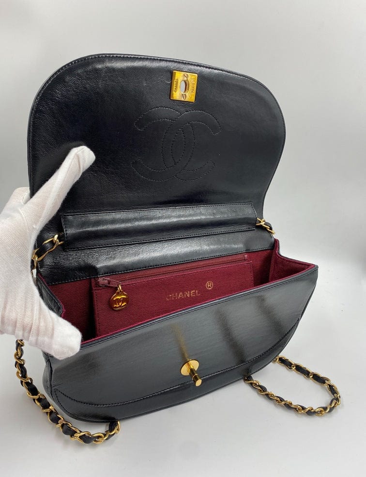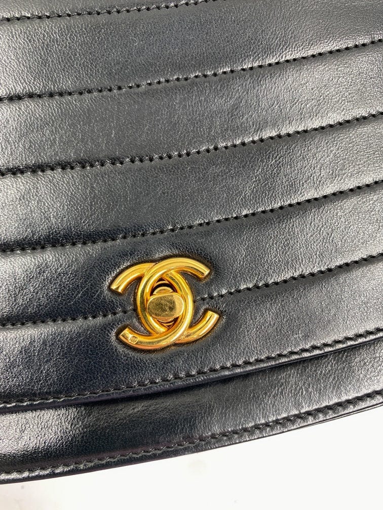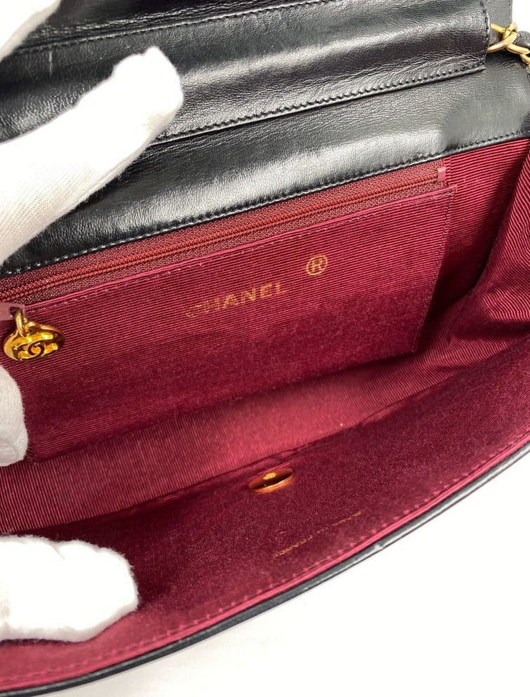 A beautiful vintage black flap Chanel crossbody bag with the iconic CC turn lock. There is a hallmark on the turn lock showing us that the gold hardware is plated in 24k gold. Chanel stopped plating with real gold in late 2008. There are some lovely Chanel branding details on this bag, under the flap the CC is stitched under the flap. Inside the bag the gold CC charm is still intact on the inner zip.
