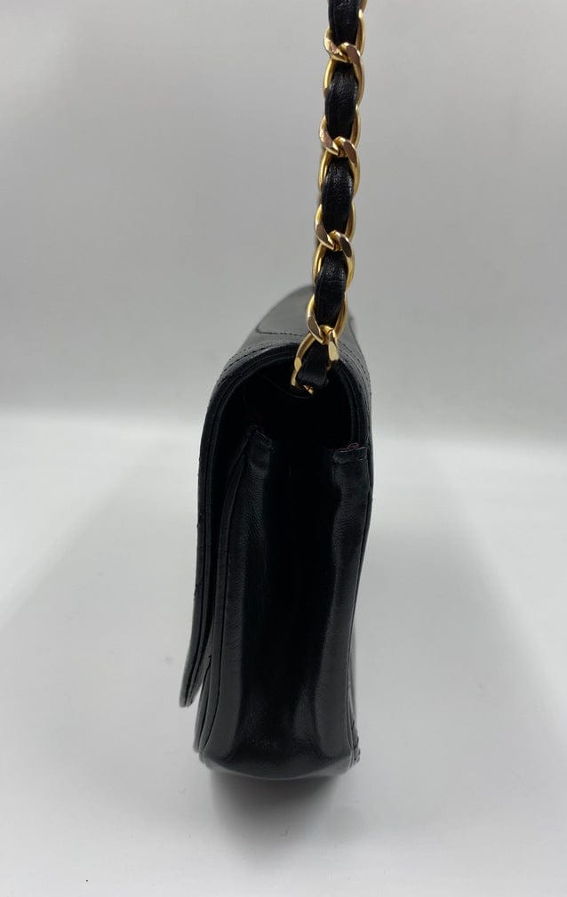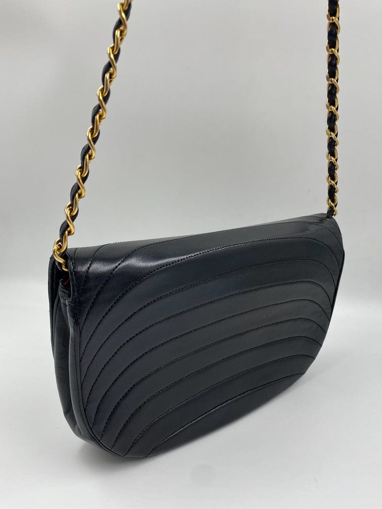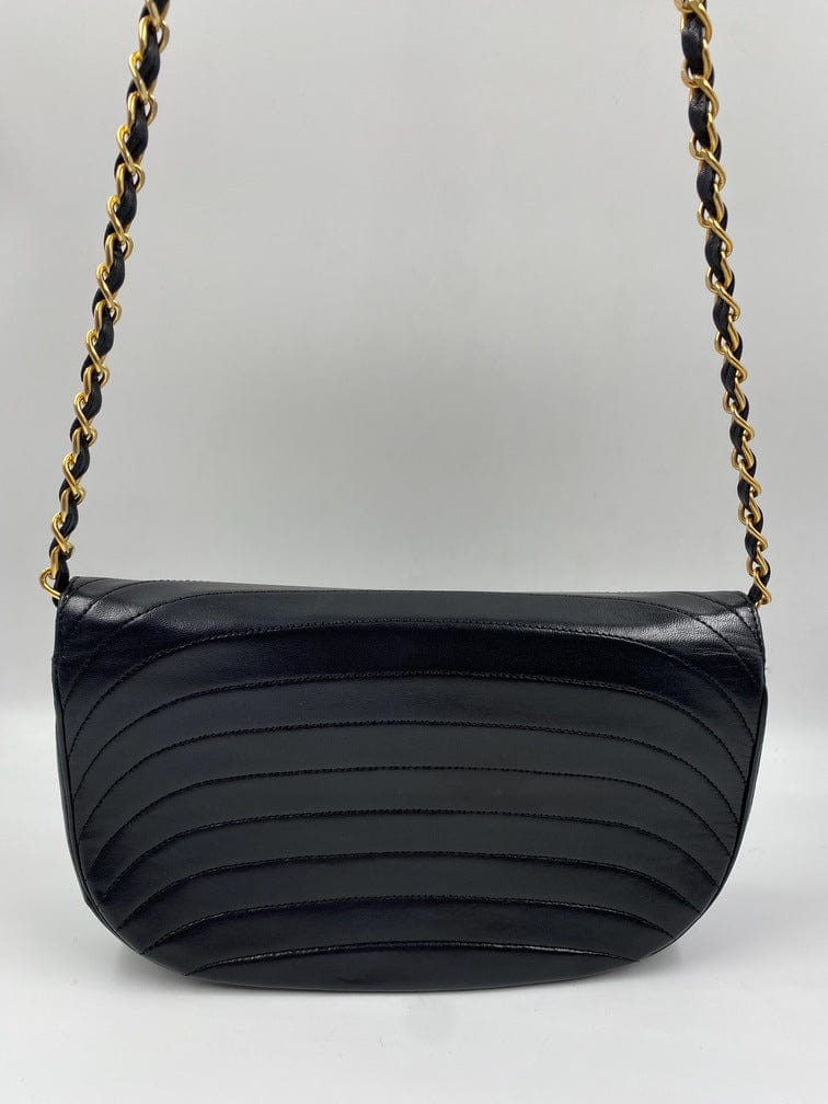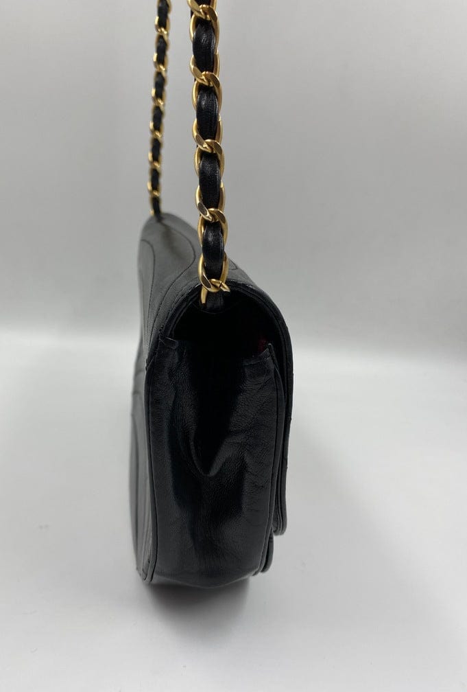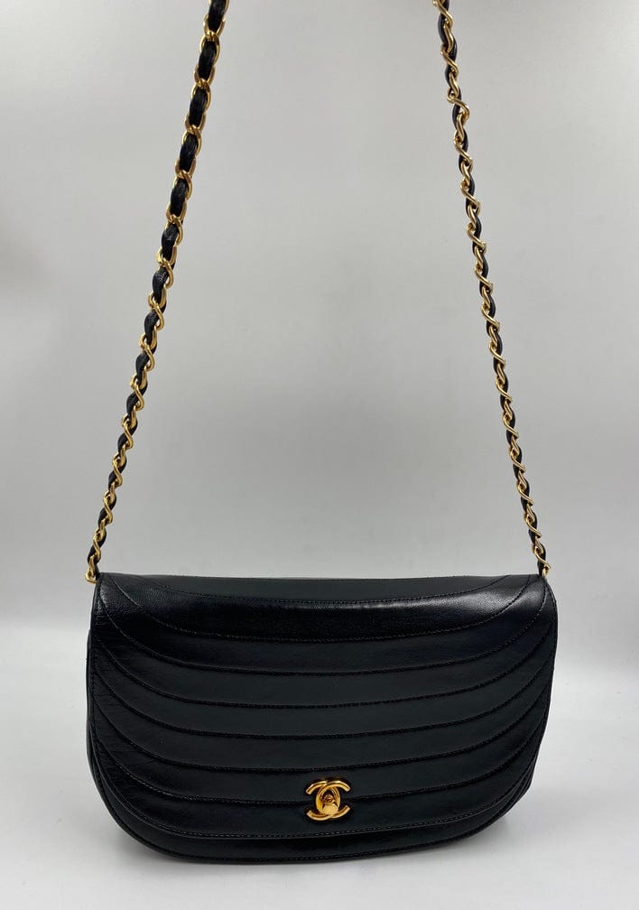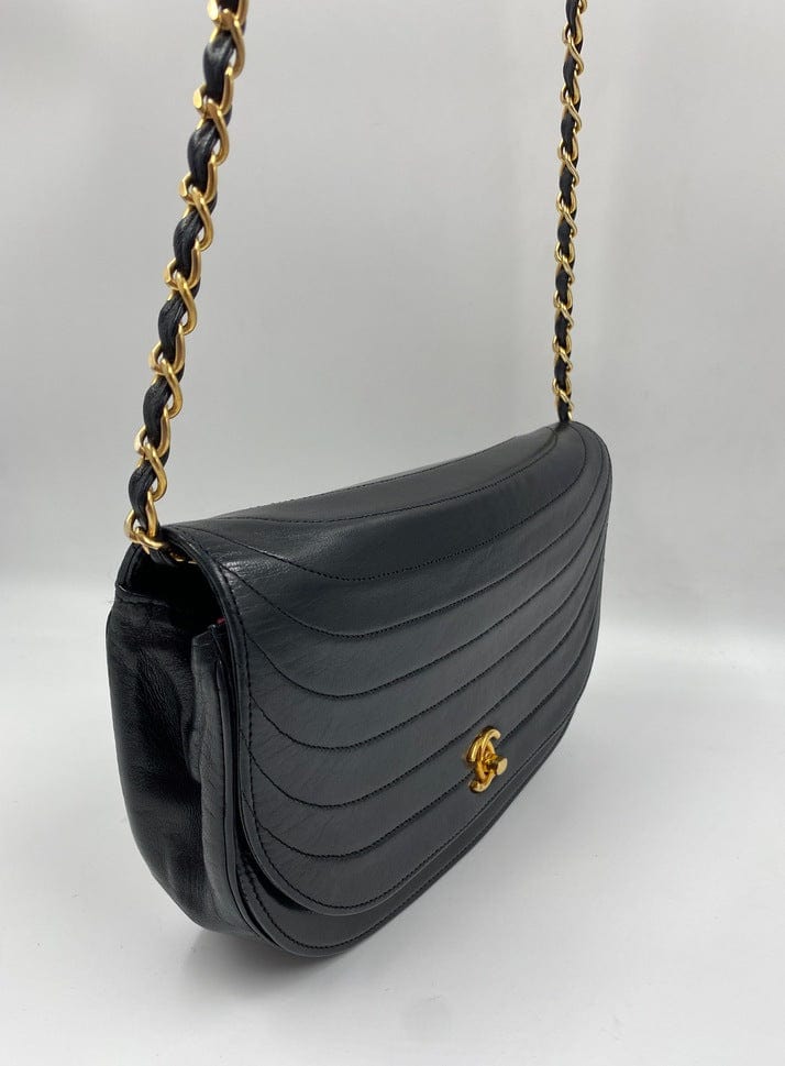 A beautiful vintage black flap Chanel crossbody bag with the iconic CC turn lock. There is a hallmark on the turn lock showing us that the gold hardware is plated in 24k gold. Chanel stopped plating with real gold in late 2008. There are some lovely Chanel branding details on this bag, under the flap the CC is stitched under the flap. Inside the bag the gold CC charm is still intact on the inner zip.