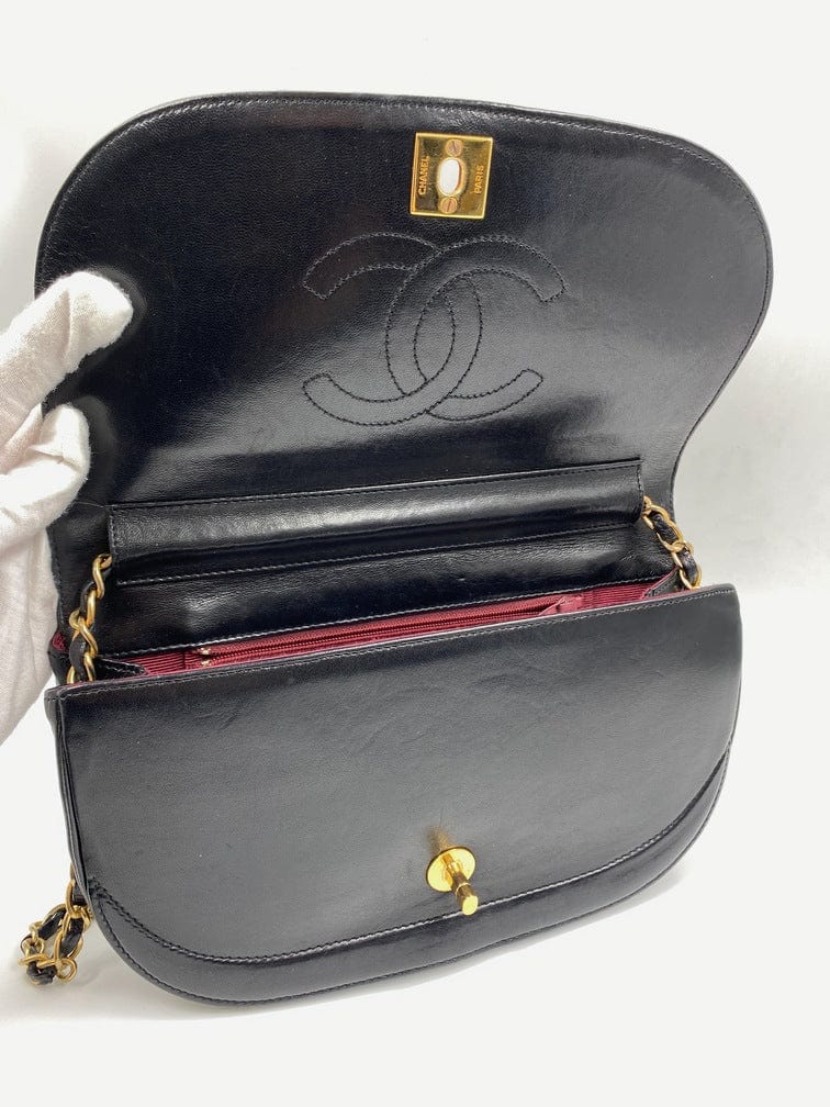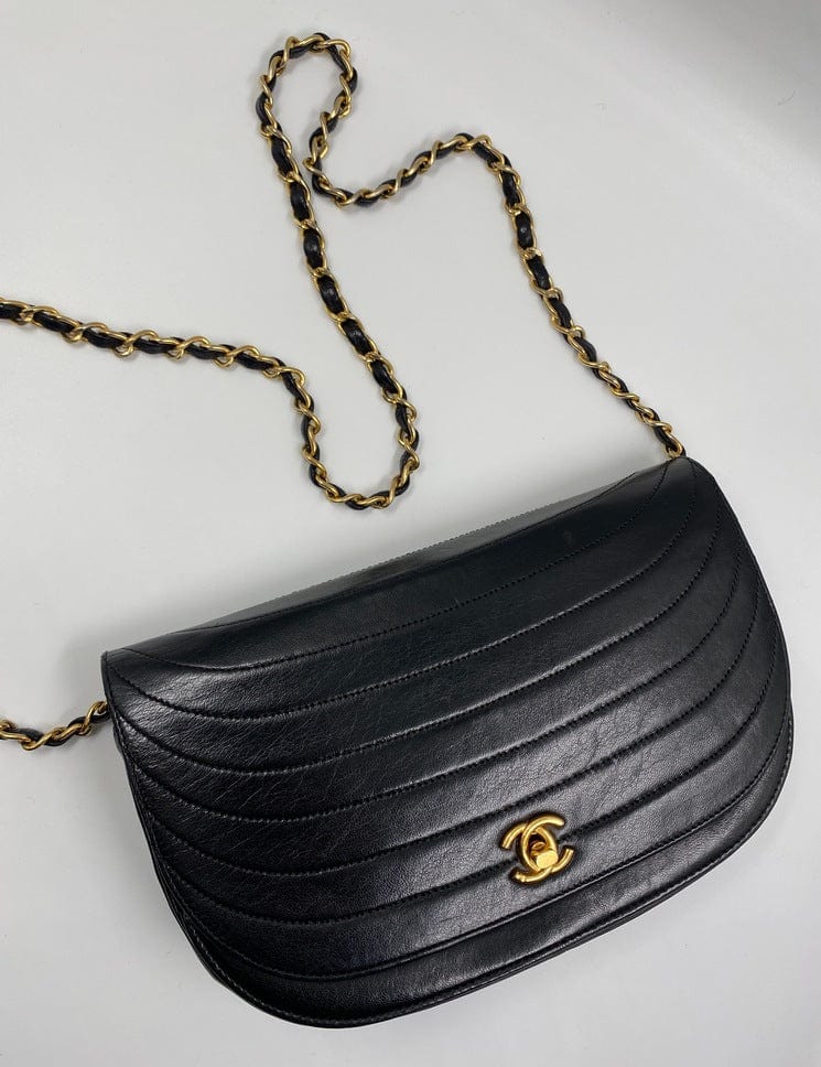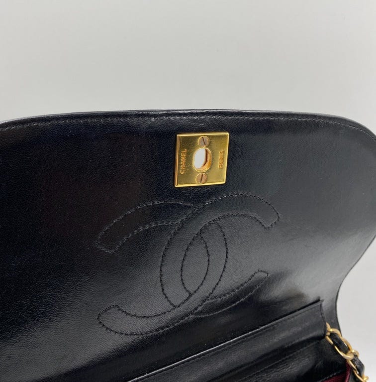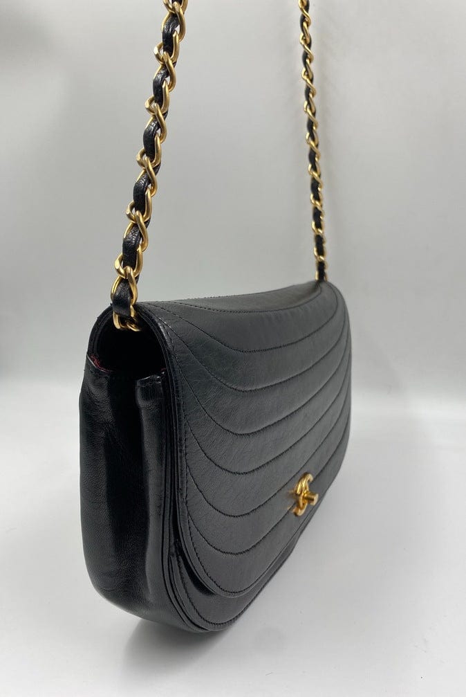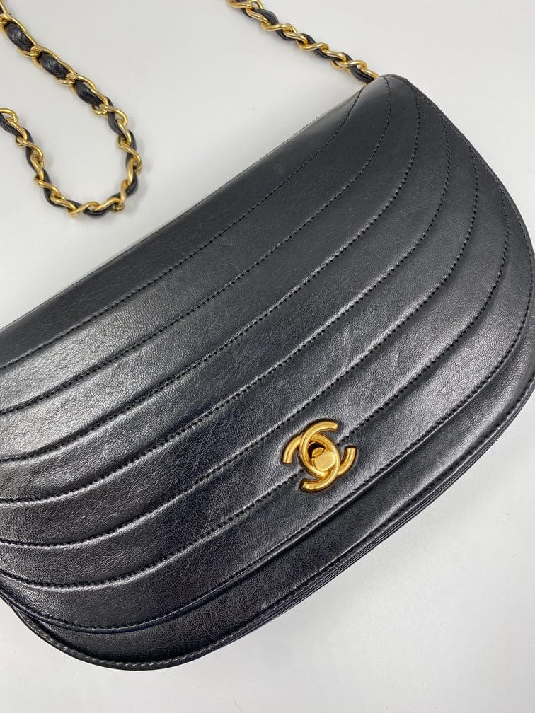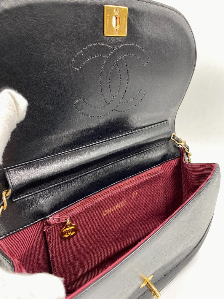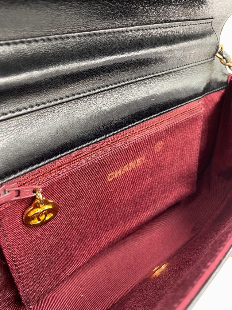A beautiful vintage black flap Chanel crossbody bag with the iconic CC turn lock. There is a hallmark on the turn lock showing us that the gold hardware is plated in 24k gold. Chanel stopped plating with real gold in late 2008. There are some lovely Chanel branding details on this bag, under the flap the CC is stitched under the flap. Inside the bag the gold CC charm is still intact on the inner zip.