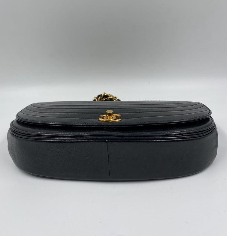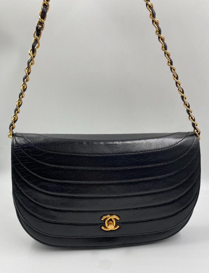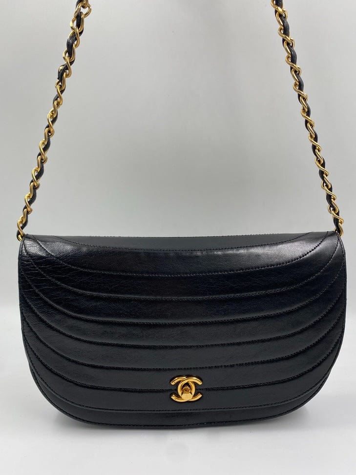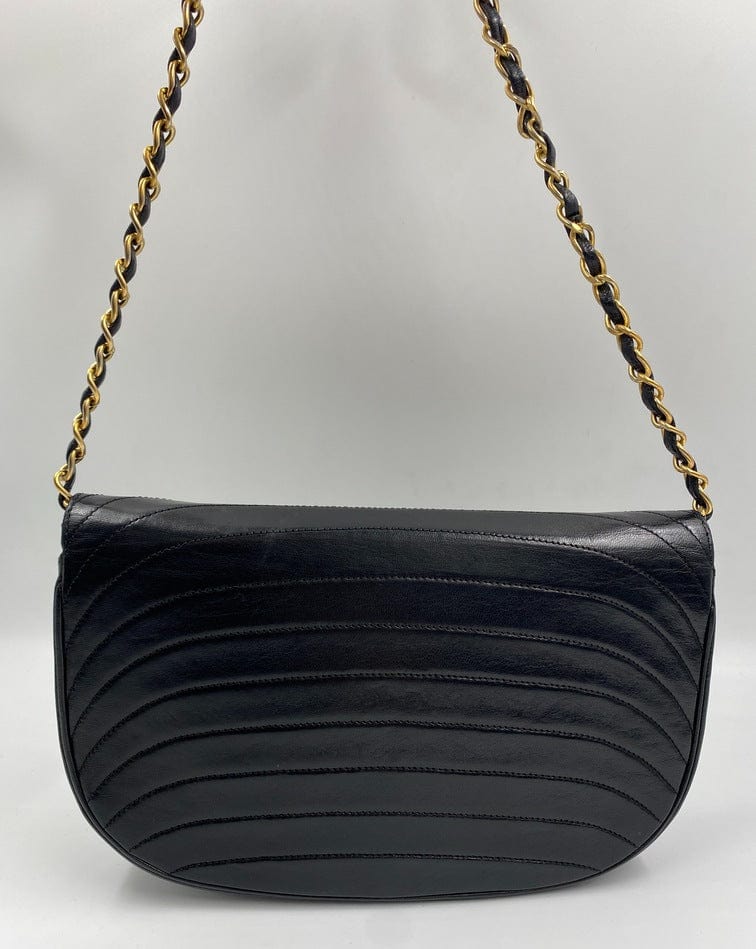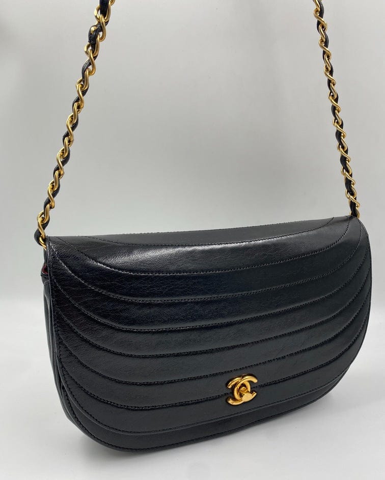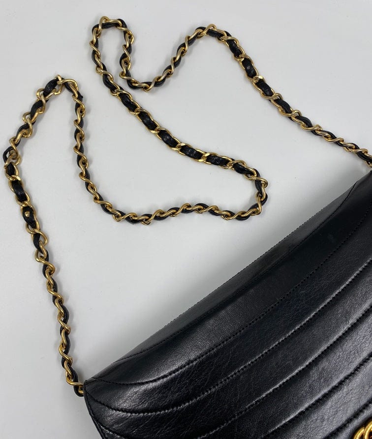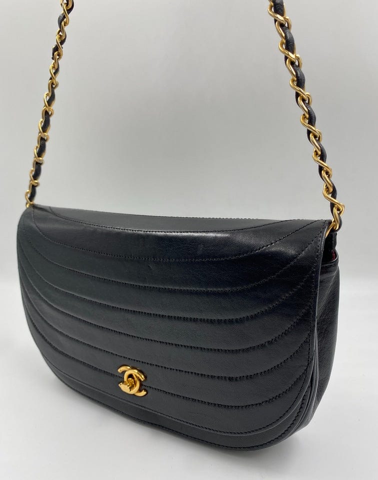 A beautiful vintage black flap Chanel crossbody bag with the iconic CC turn lock. There is a hallmark on the turn lock showing us that the gold hardware is plated in 24k gold. Chanel stopped plating with real gold in late 2008. There are some lovely Chanel branding details on this bag, under the flap the CC is stitched under the flap. Inside the bag the gold CC charm is still intact on the inner zip.