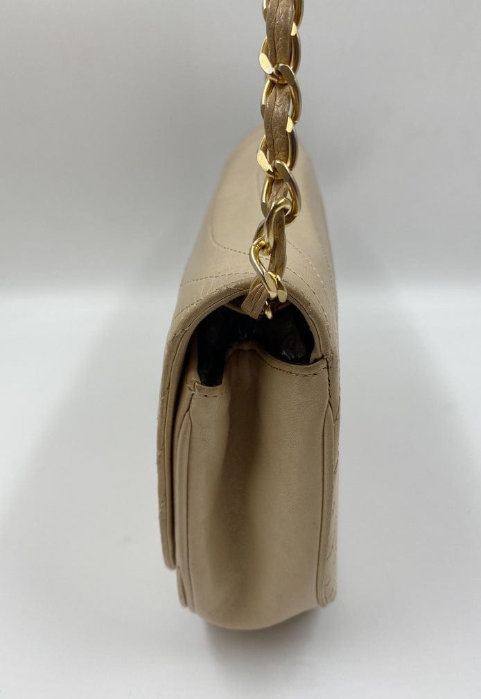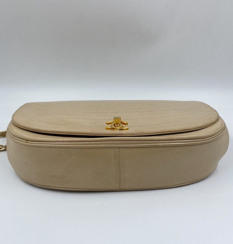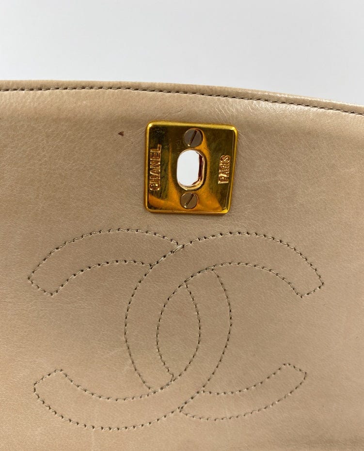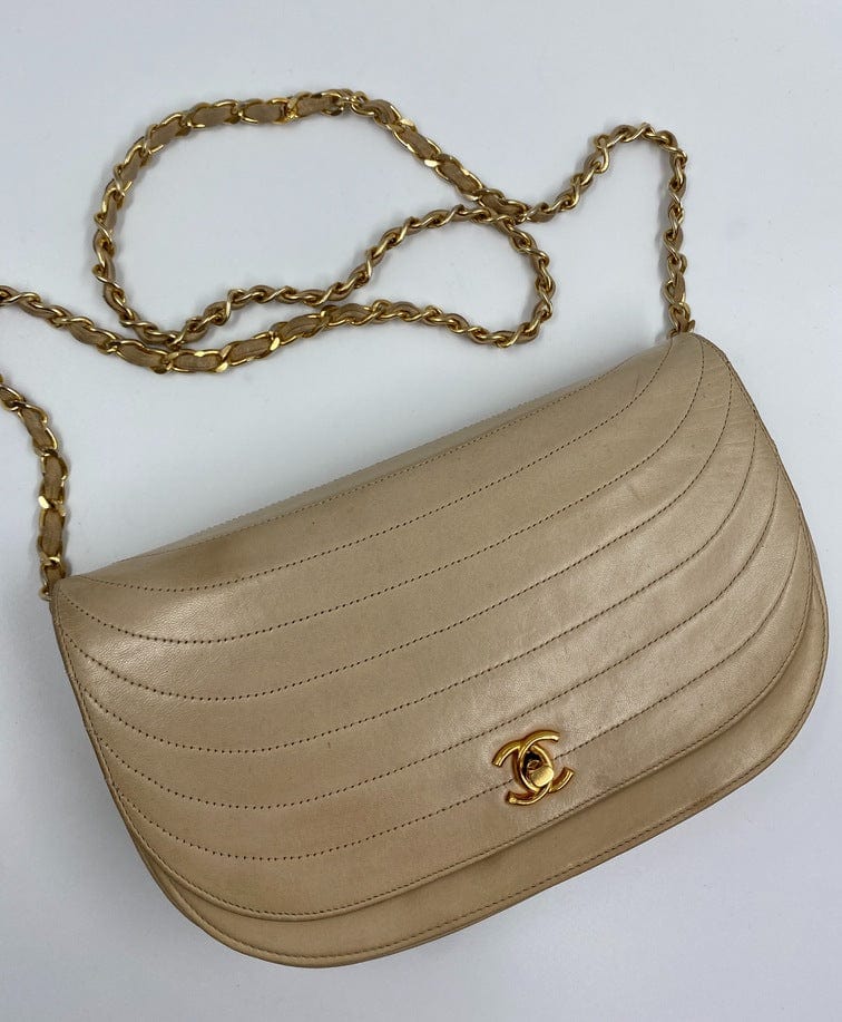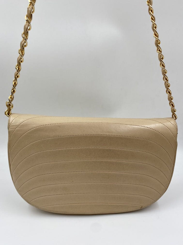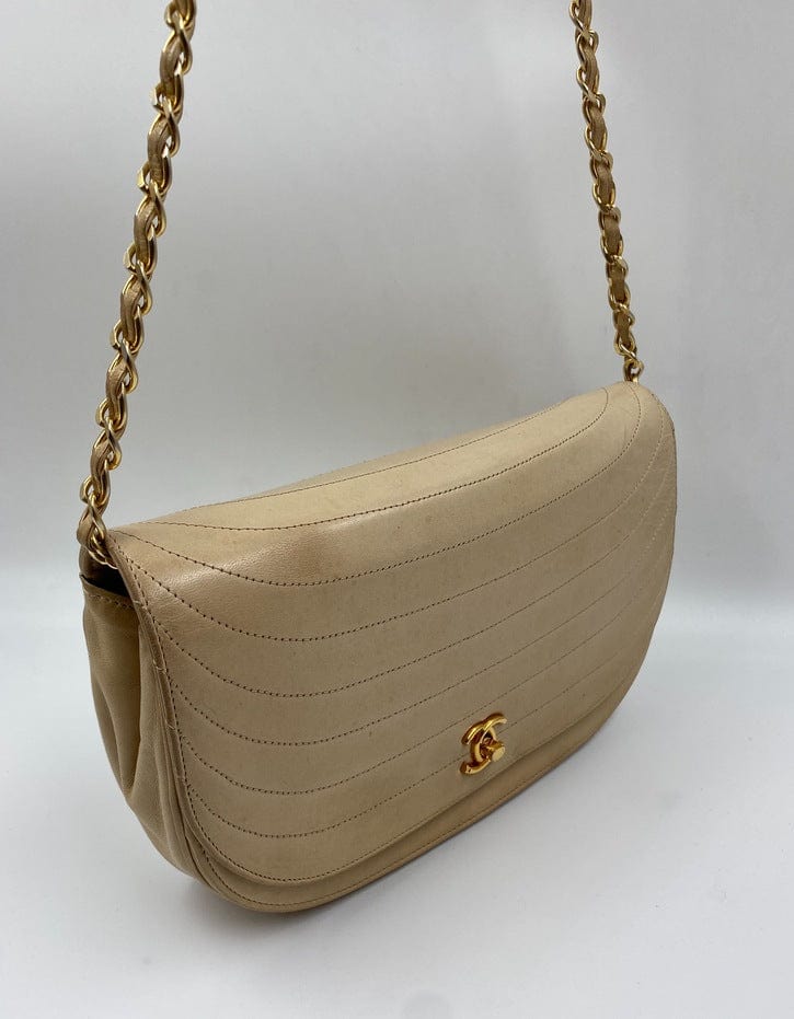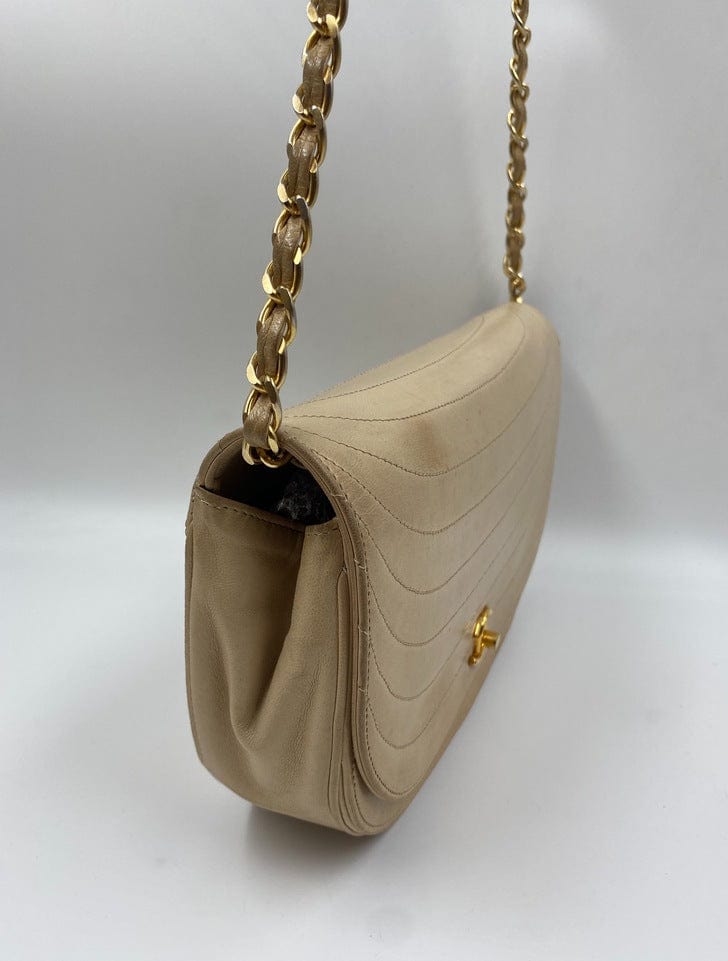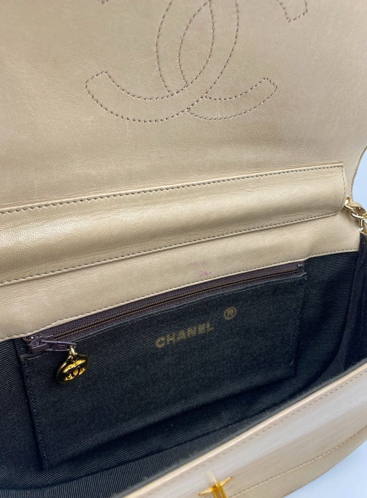 A beautiful vintage beige flap Chanel crossbody bag with the iconic CC turn lock. There is a hallmark on the turn lock showing us that the gold hardware is plated in 24k gold. Chanel stopped plating with real gold in late 2008. There are some lovely Chanel branding details on this bag, under the flap the CC is stitched under the flap. Inside the bag the gold CC charm is still intact on the inner zip.
