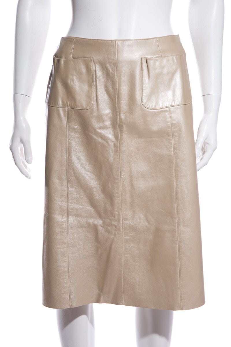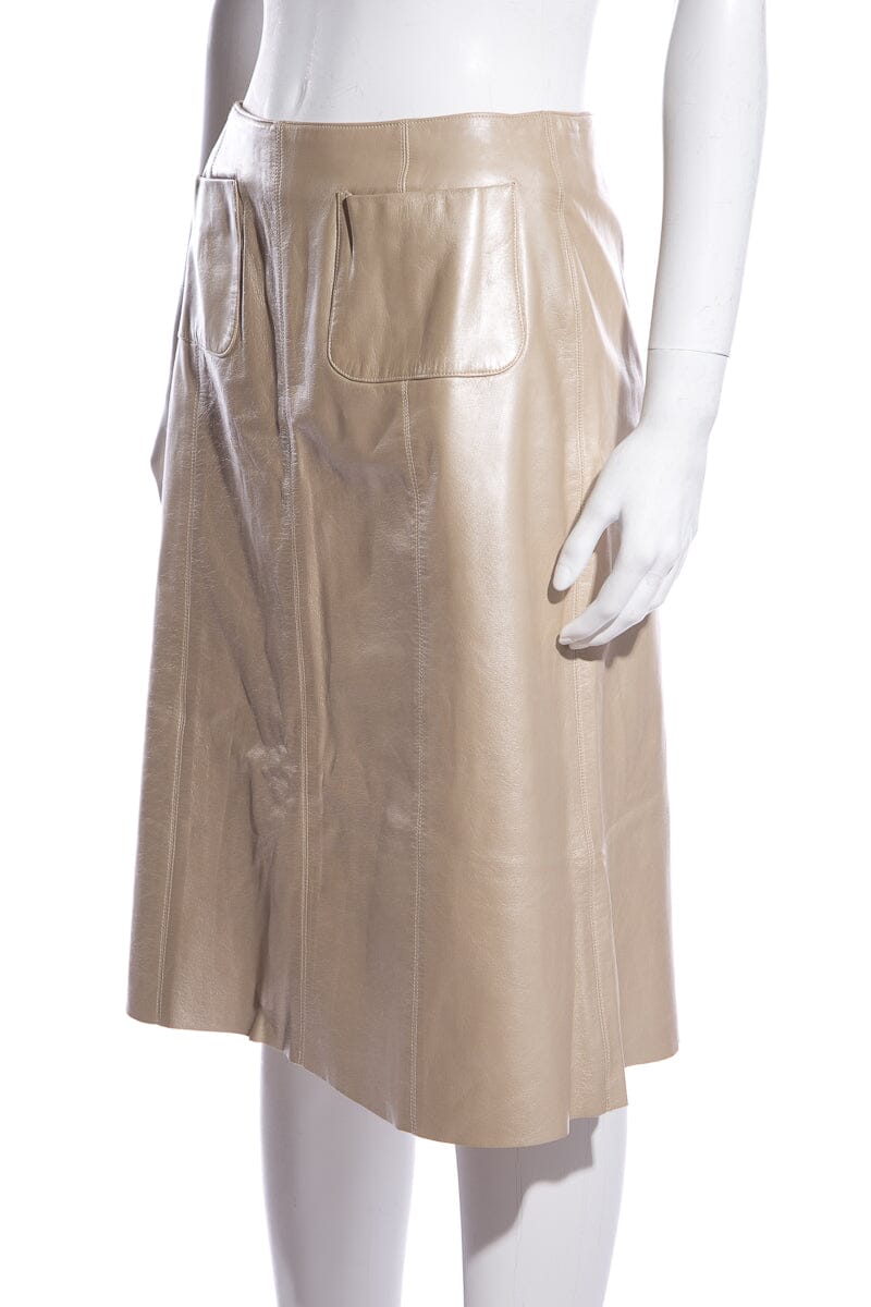 Vintage Chanel 1999 Spring Gold Lambskin Leather Knee Length Skirt w/ concealed zipper at back and front pocket detail. This item is in New condition with imperfections to leather on bottom and tear to composition tag inside.