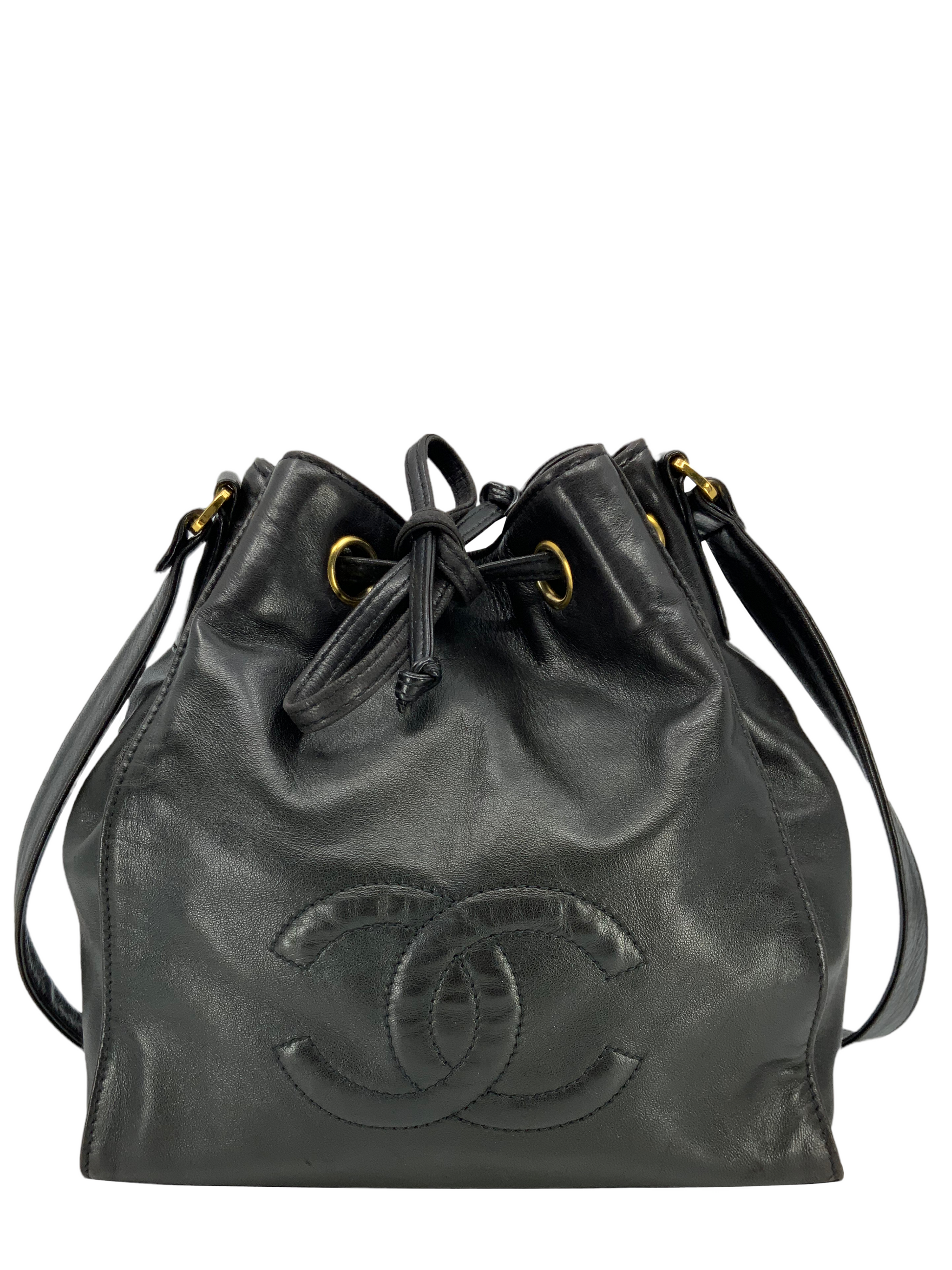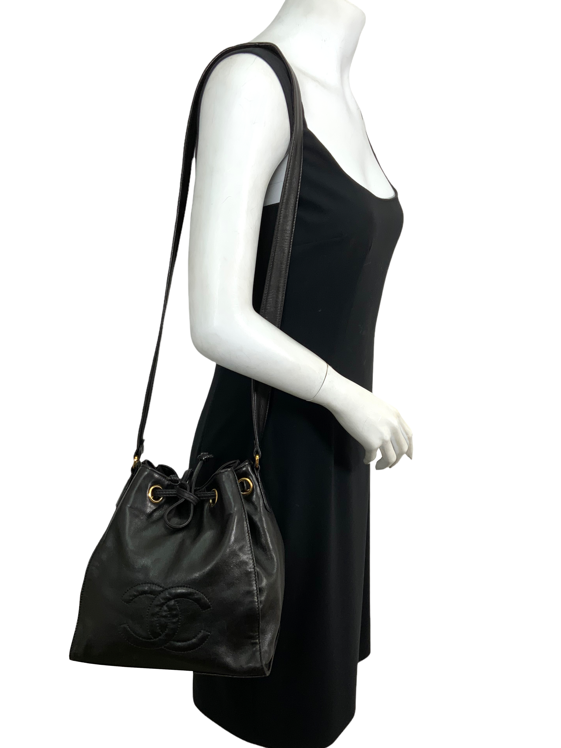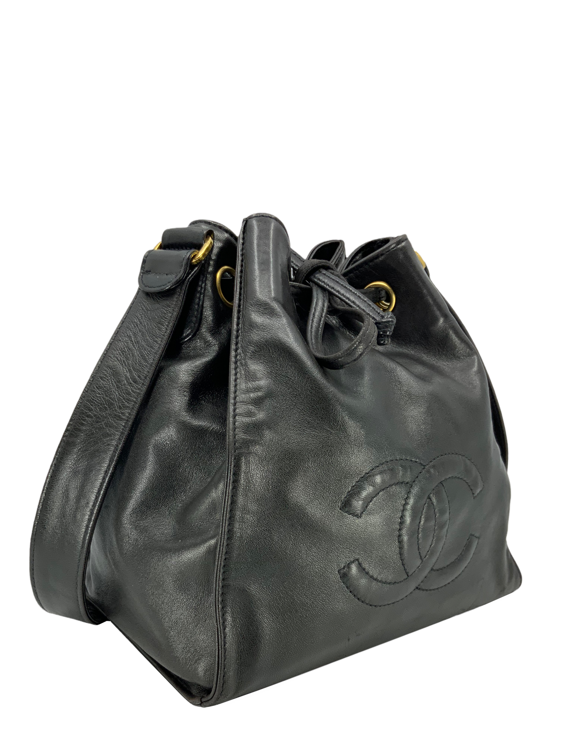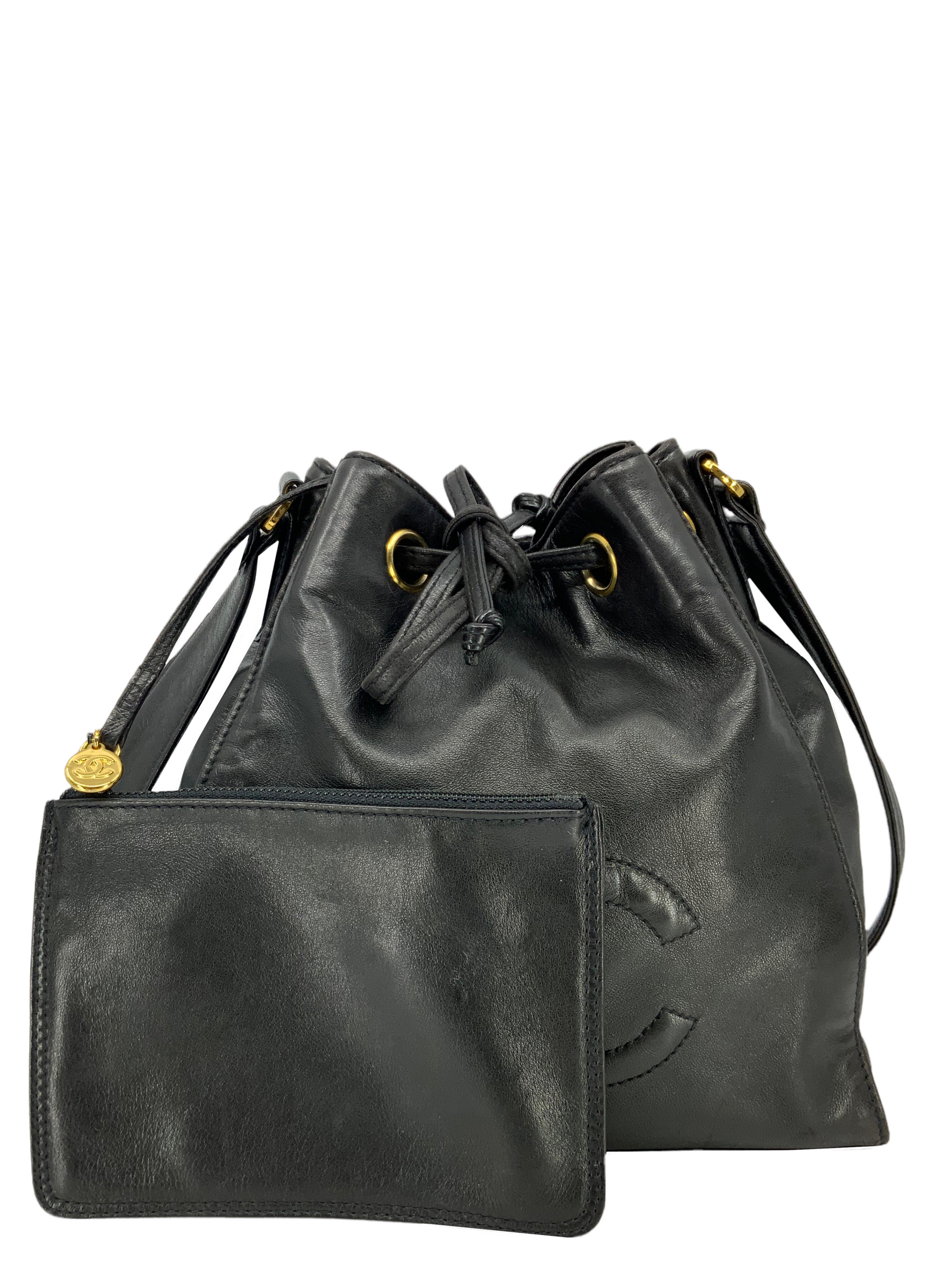 We the ity of thisCHANELVintage Lambskin Drawstring Bucket Shoulder Bag crafted in smooth blacklambskin and gold-tone hardware.Featuring a single flat leather shoulder strap, a front 'CC' logo and a leather self-tie drawstring closure that opens to a spacious interior finely lined in a black textile fabric with a hanging pochette.