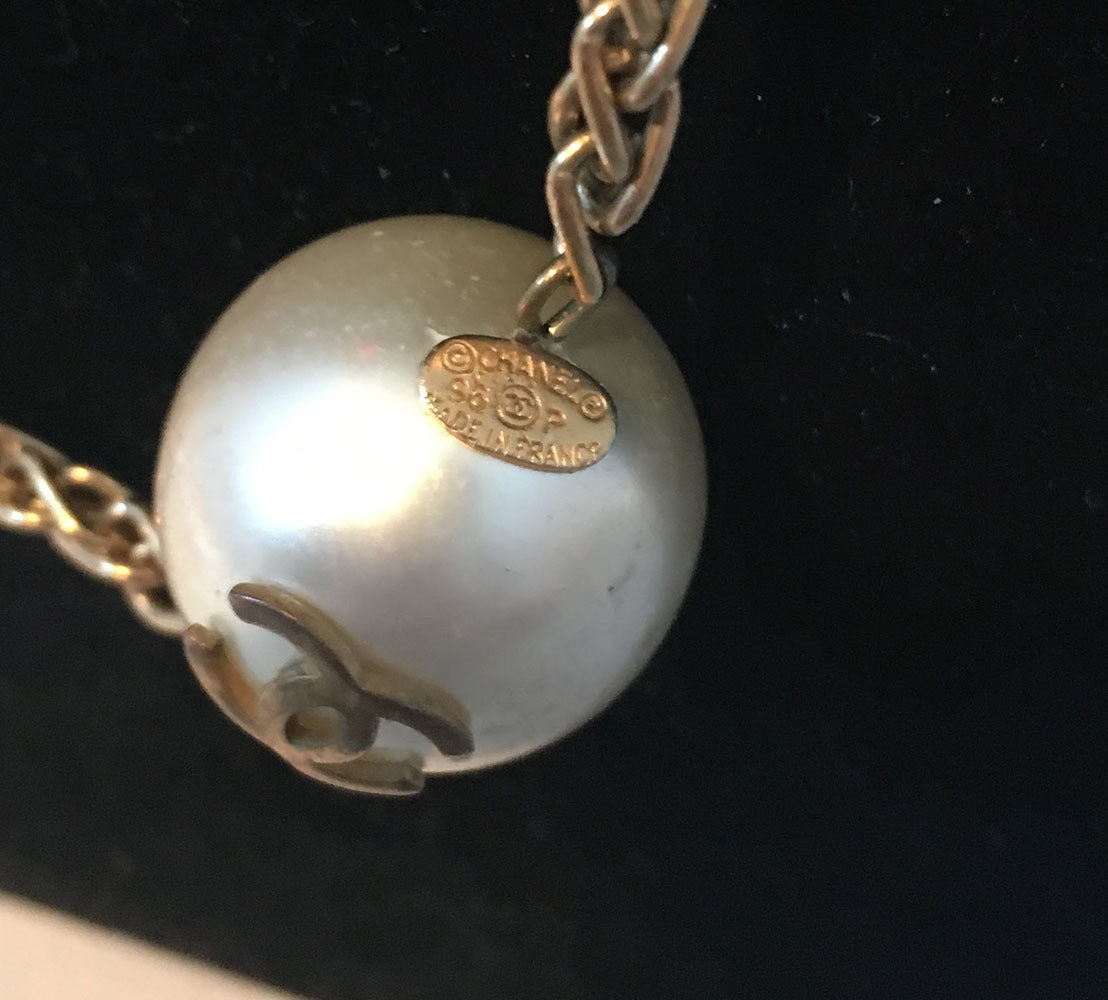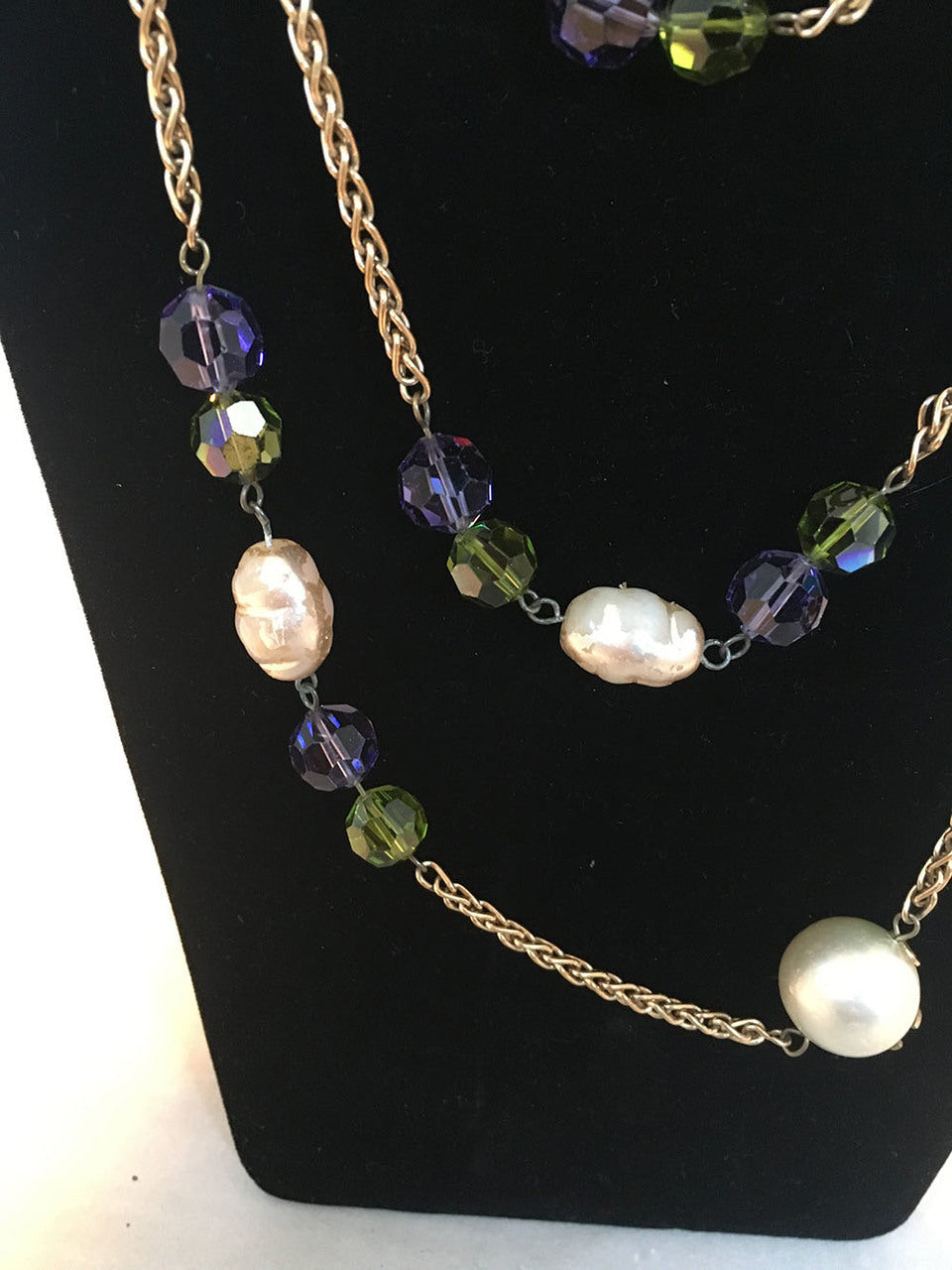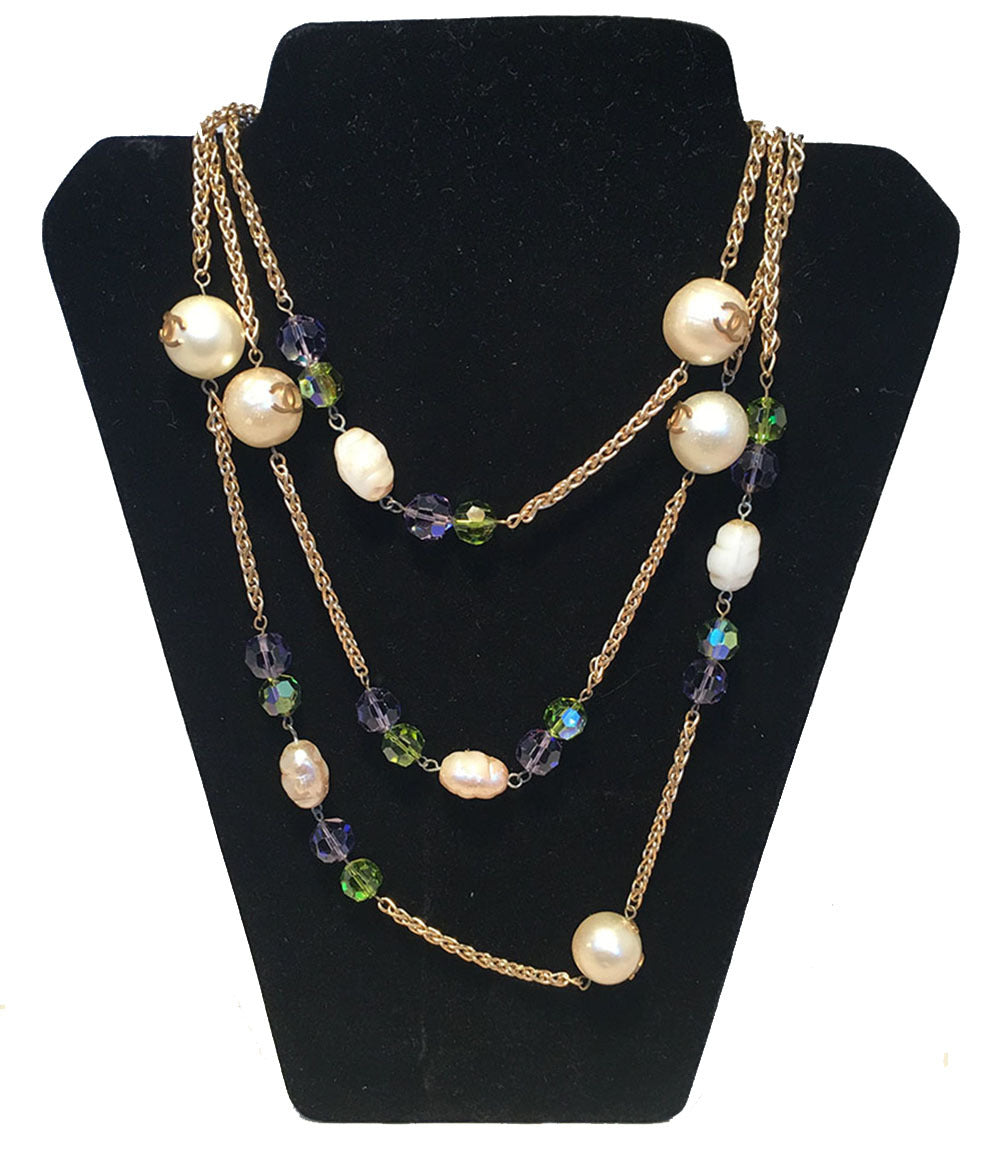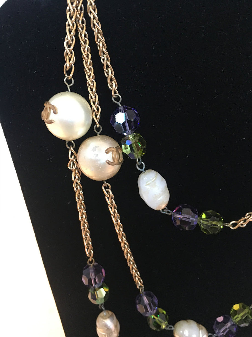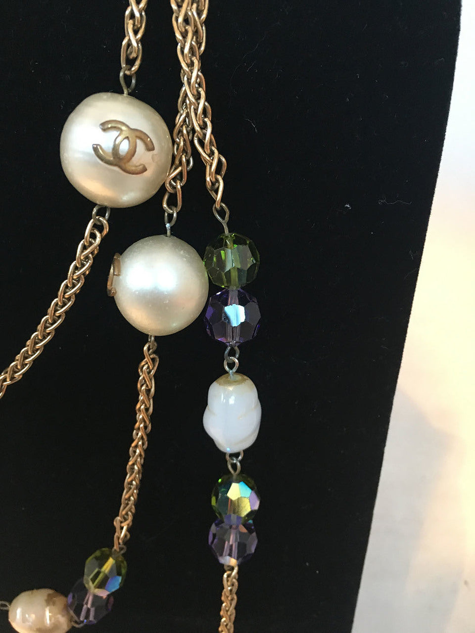 STUNNING Chanel Vintage Gold Necklace with Large Pearls and amp; Green and Purple Crystal Beads in New condition. Gold link chain necklace with large round pearl beads that feature matte gold CC logos and purple and green crystal cut beads. Wear consistent with age and use. Pearl coating is chipping off many of the pearl beads. See photos for details. Light hairline scratches on green and purple beads. This is a rare vintage Chanel piece that is perfect for the Chanel lover who has everything. It can be worn alone as a long chain or wrapped for a layered look. Pair it with other necklaces for a variety of colors and textures. Total length=66"