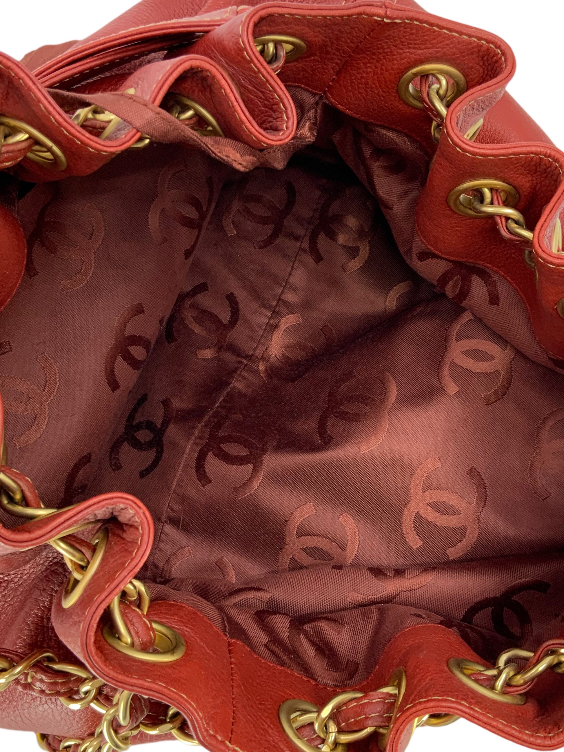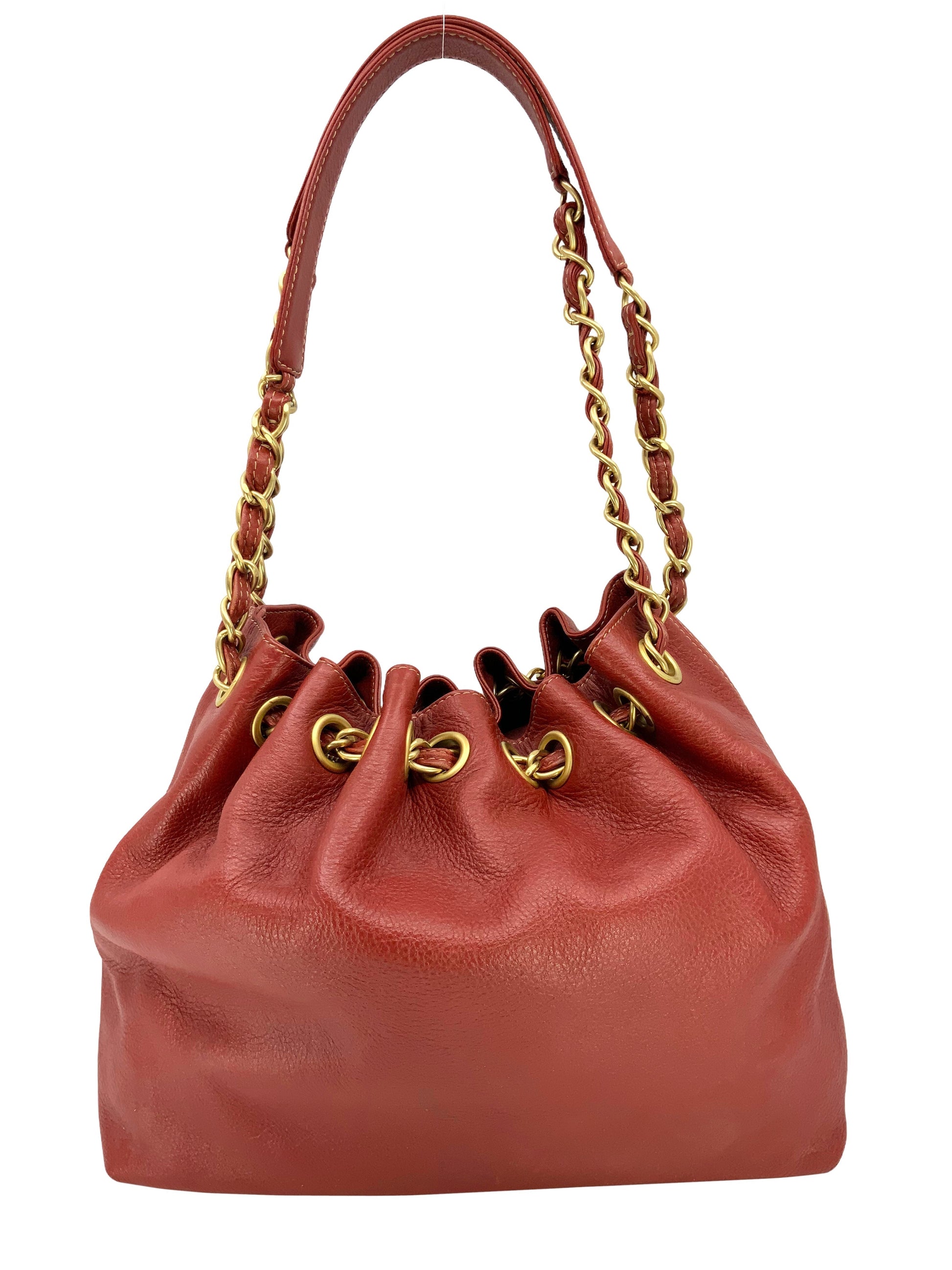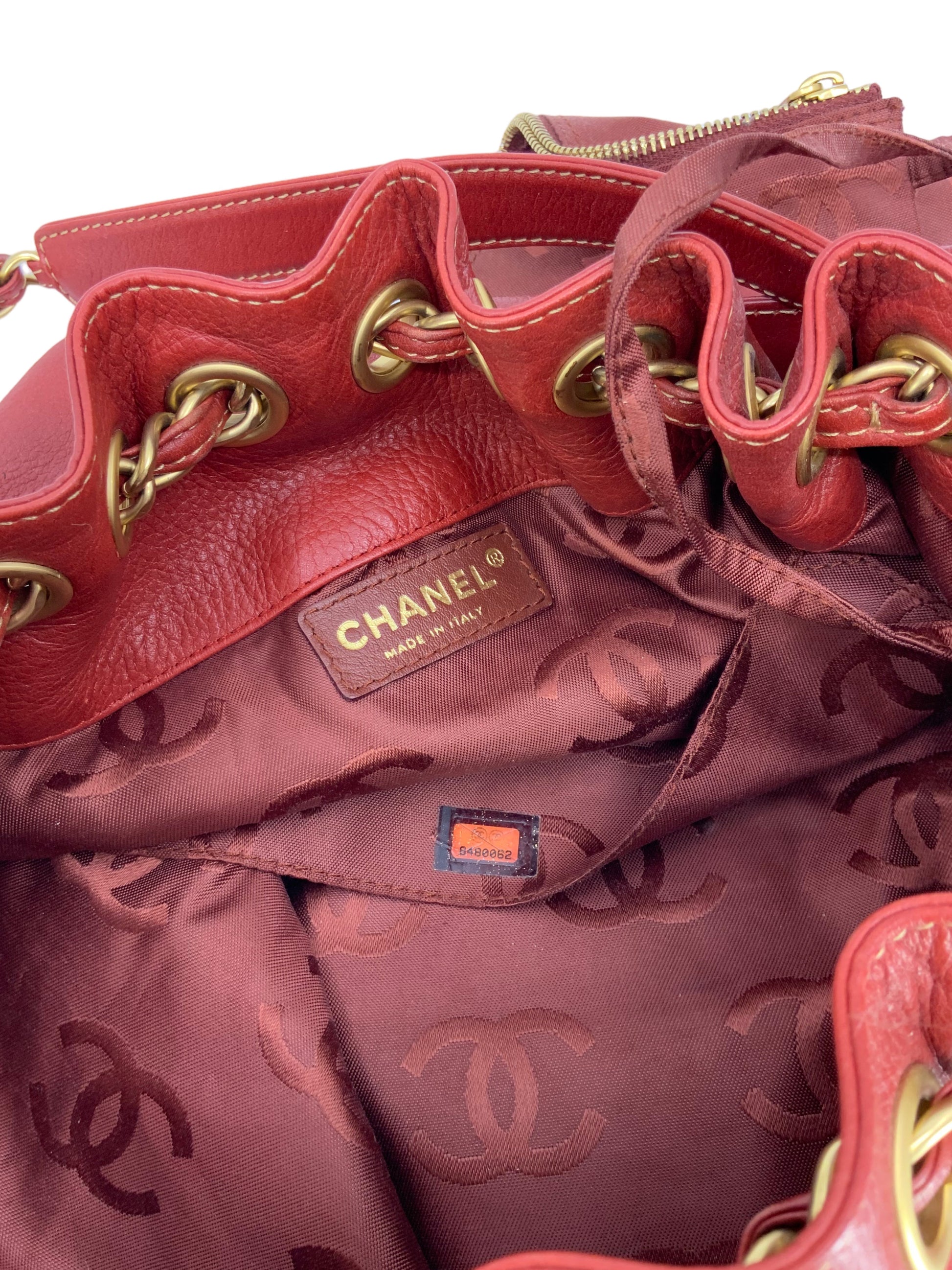 We the ity of this CHANEL Vintage Leather Drawstring Bucket Shoulder Bagcrafted in smoothred leather andantiqued gold-tone hardware.Featuringa front signature 'CC' logo anddual chain linkand leather shoulder straps that fasten the drawstring closure.