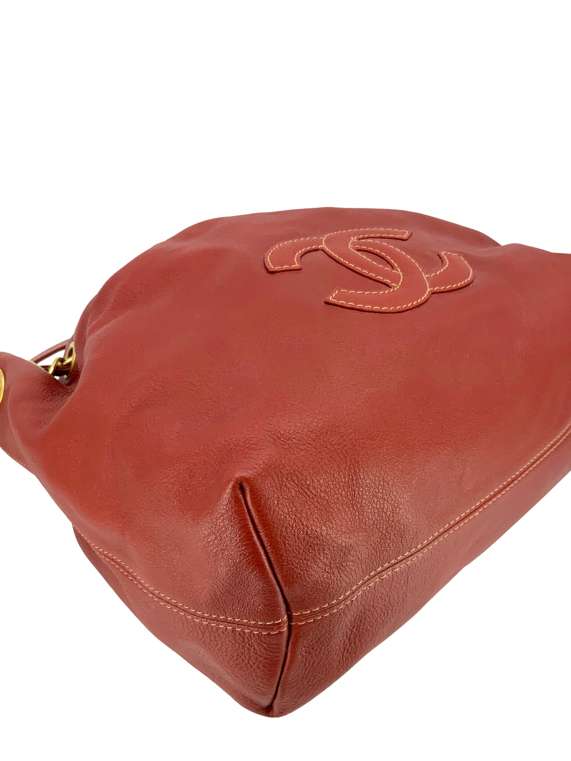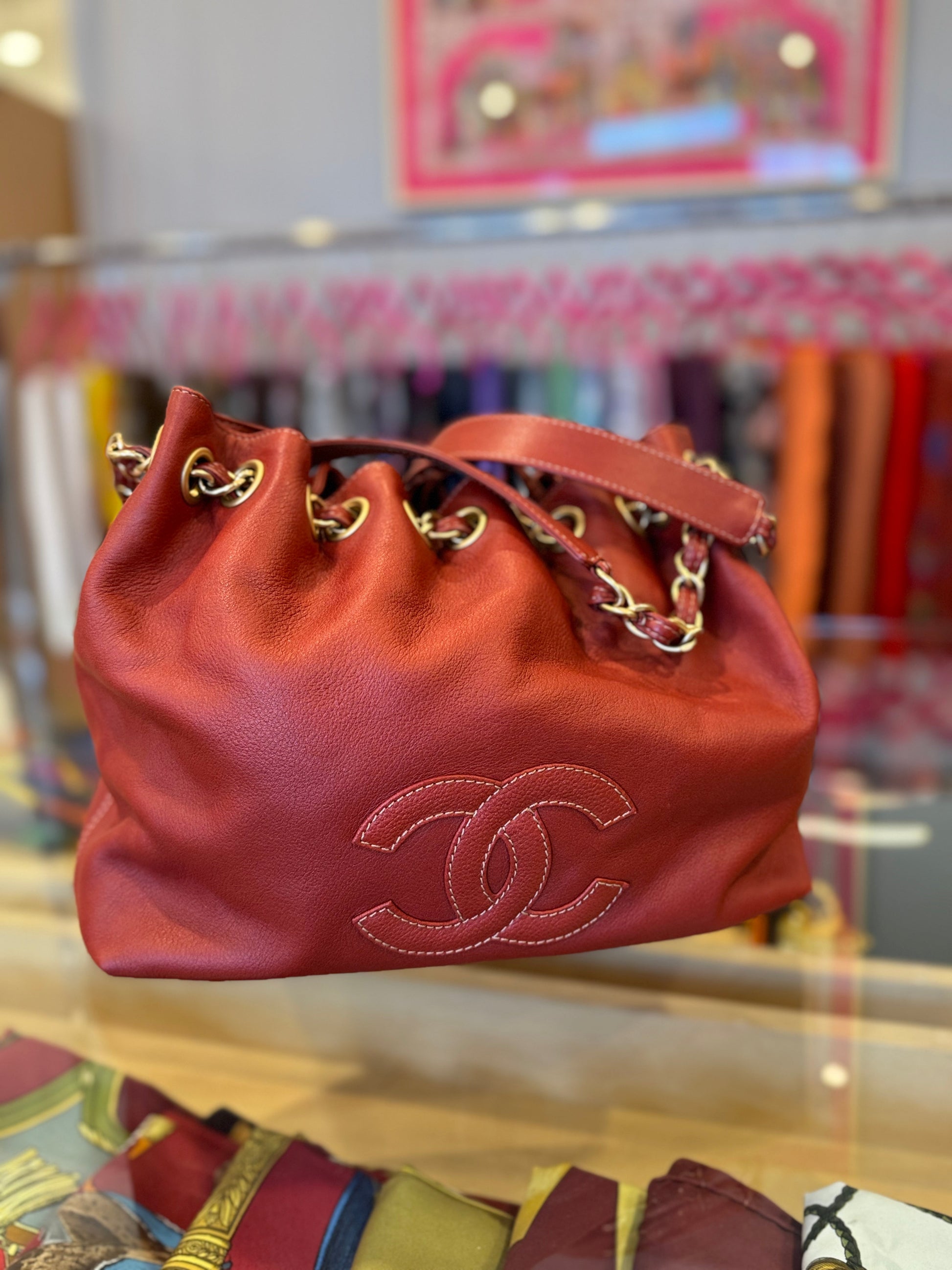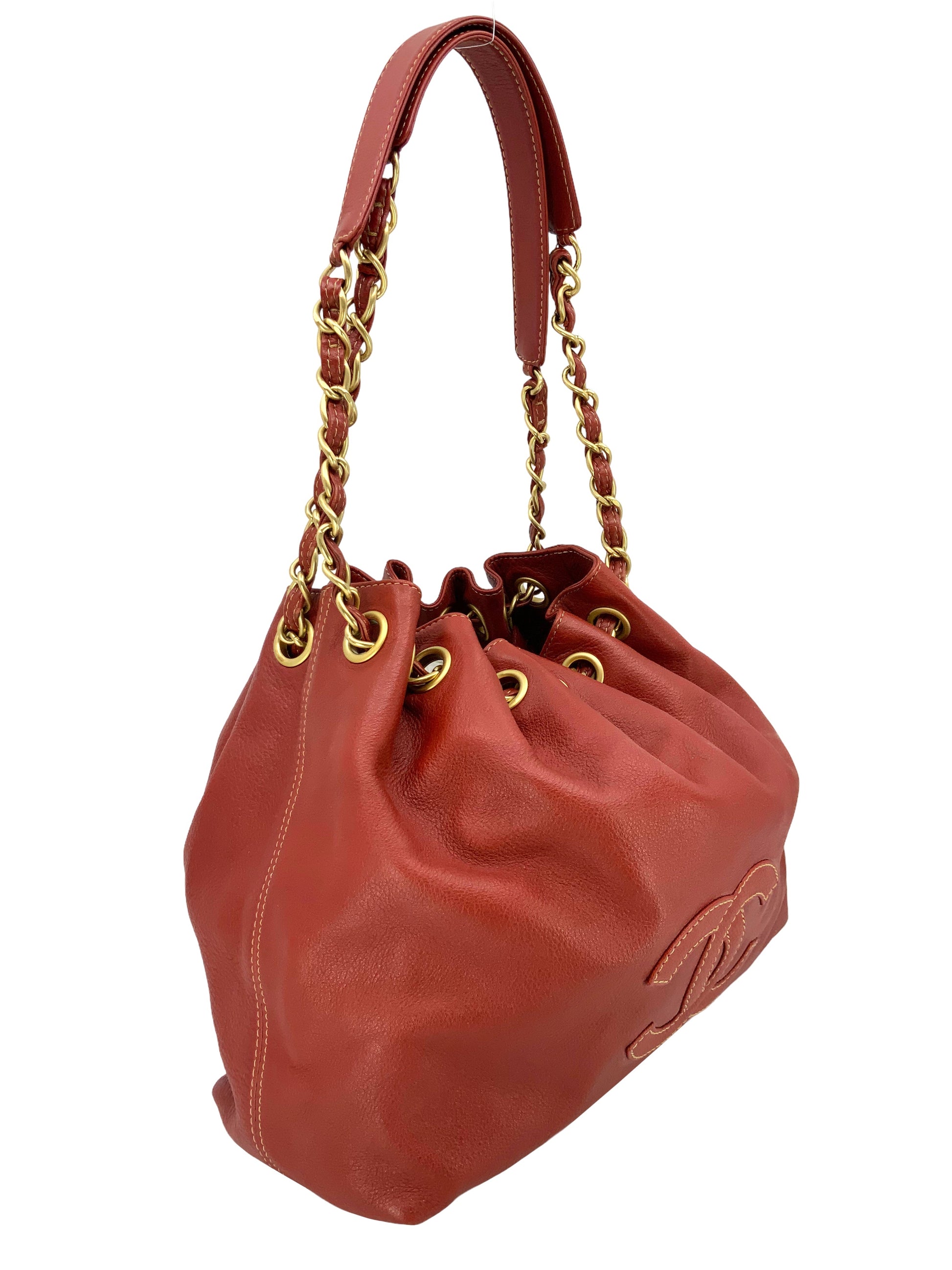 We the ity of this CHANEL Vintage Leather Drawstring Bucket Shoulder Bagcrafted in smoothred leather andantiqued gold-tone hardware.Featuringa front signature 'CC' logo anddual chain linkand leather shoulder straps that fasten the drawstring closure.