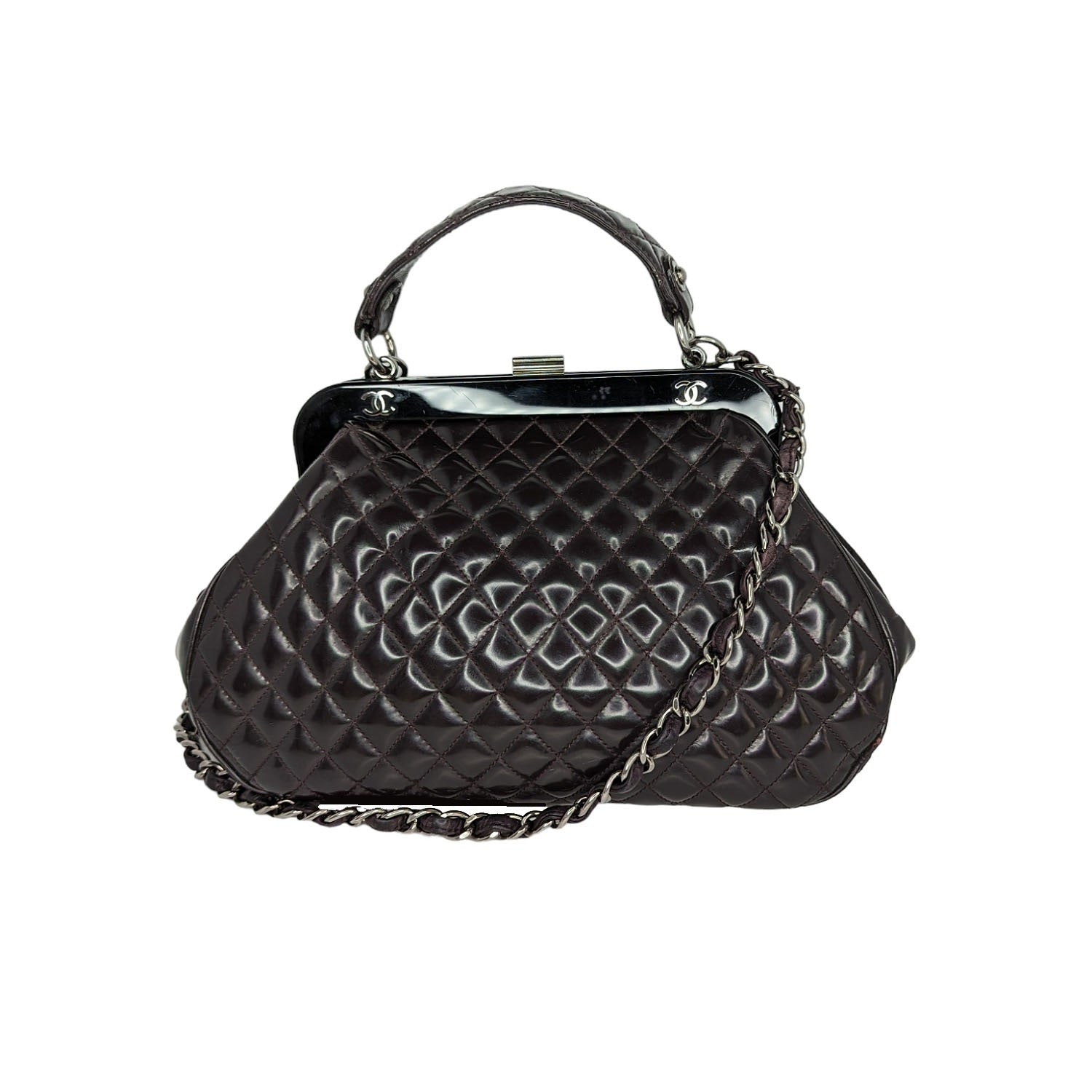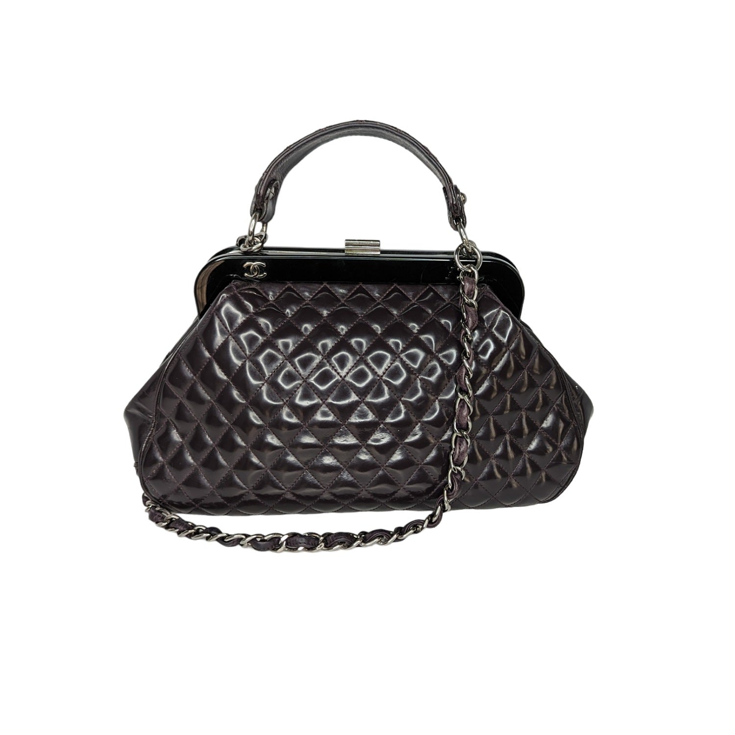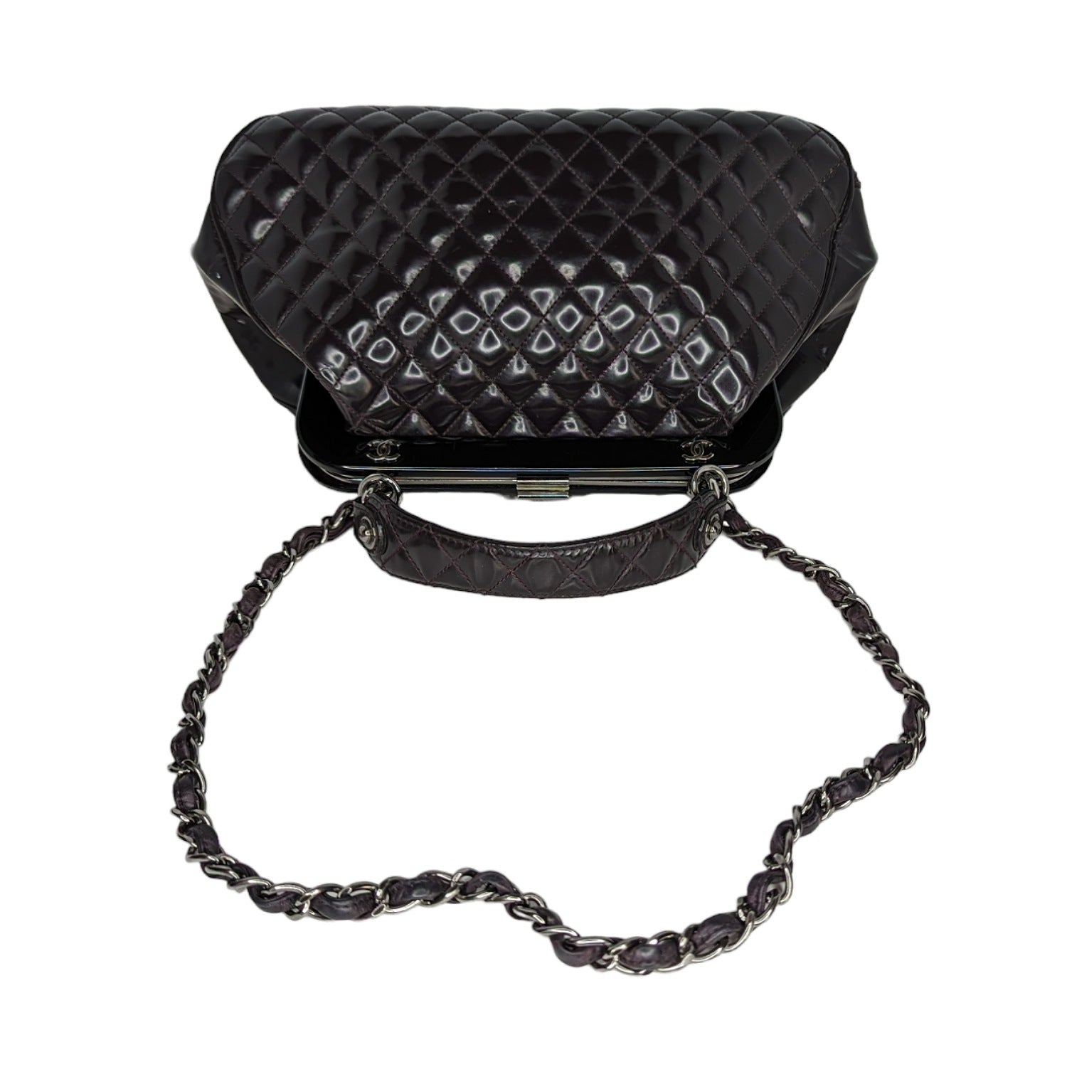 Eggplant quilted patent leather Chanel Mademoiselle Frame satchel with silver-tone hardware, single flat top handle, leather and chain-link shoulder strap, resin top frame featuring CC logo emblems, gray striped woven lining, dual pockets at interior walls; one with zip closure and push-lock closure at top frame.