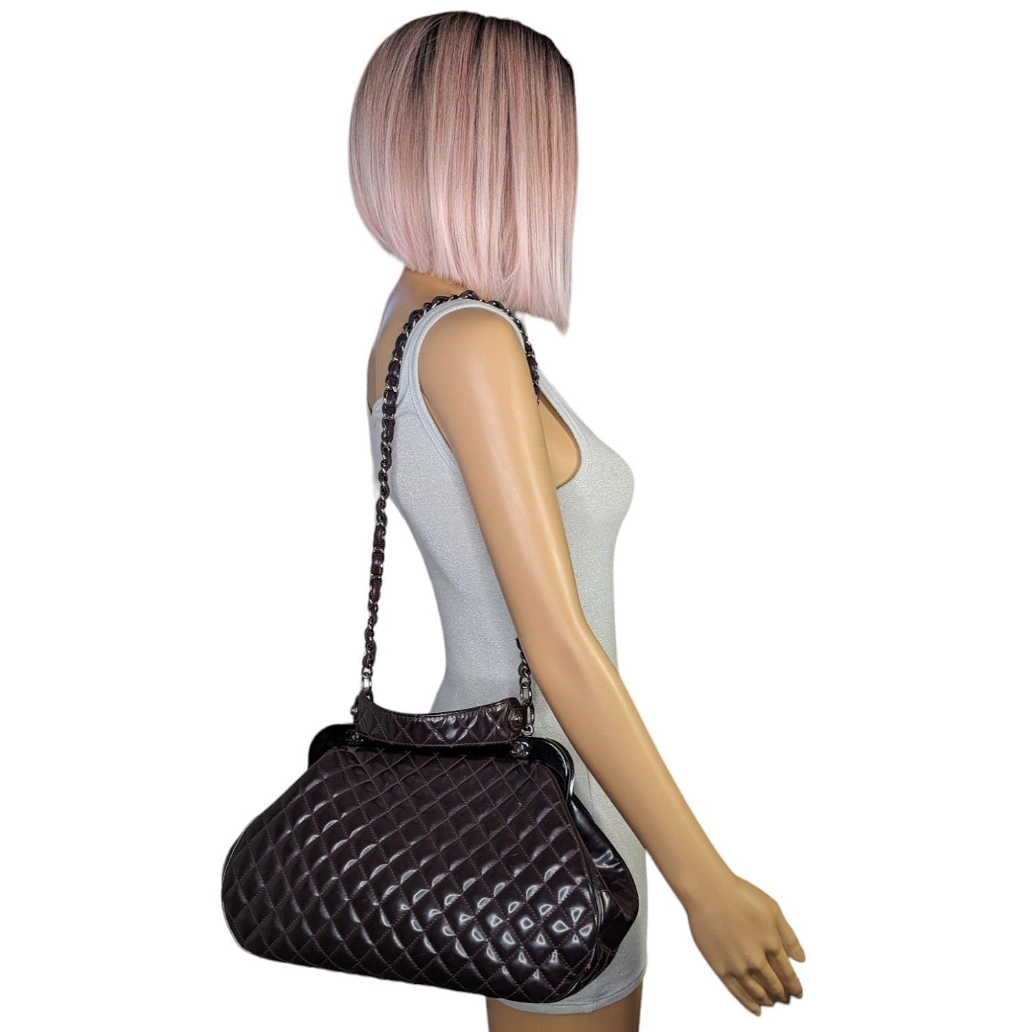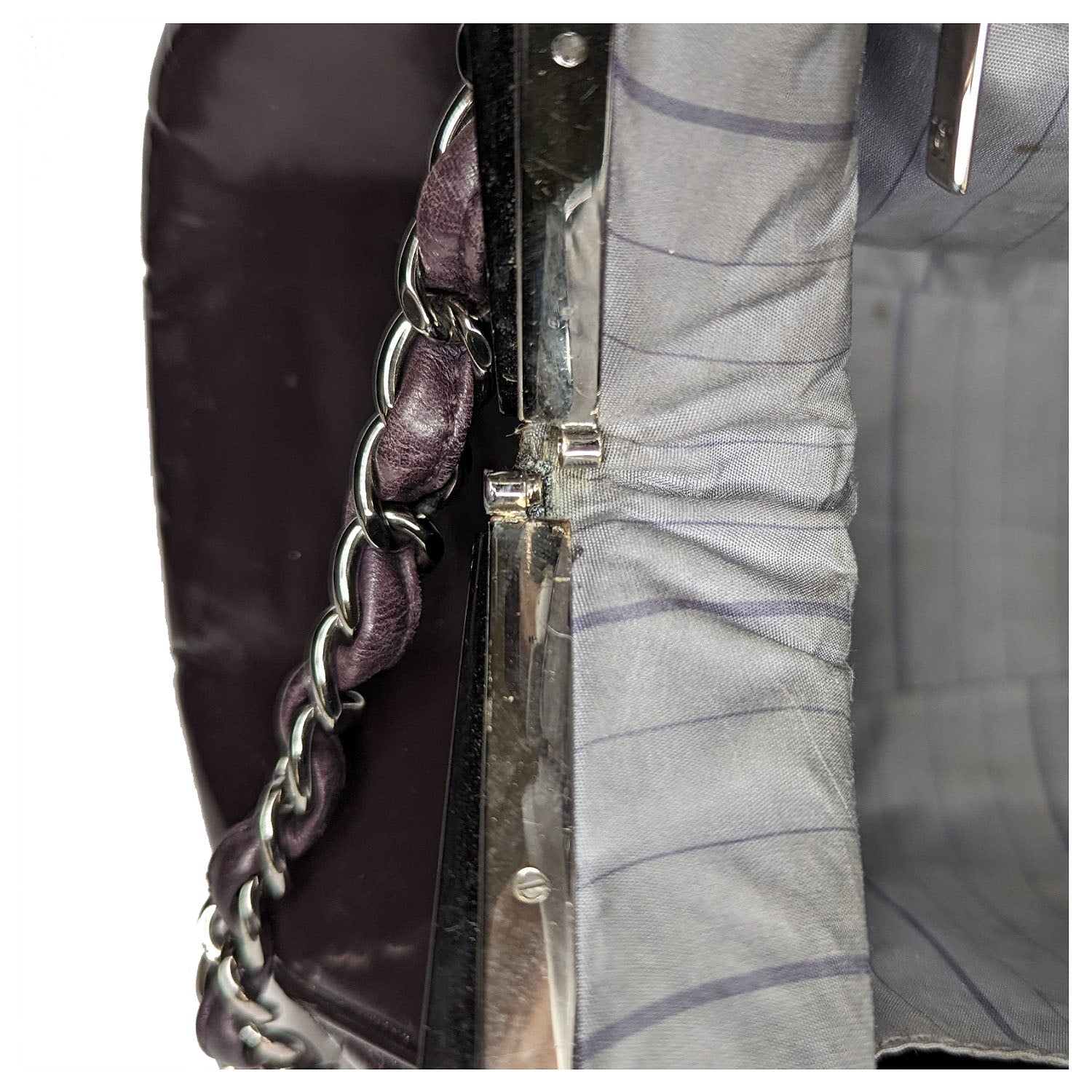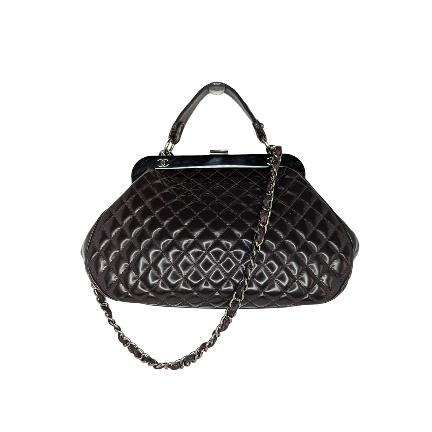 Eggplant quilted patent leather Chanel Mademoiselle Frame satchel with silver-tone hardware, single flat top handle, leather and chain-link shoulder strap, resin top frame featuring CC logo emblems, gray striped woven lining, dual pockets at interior walls; one with zip closure and push-lock closure at top frame.