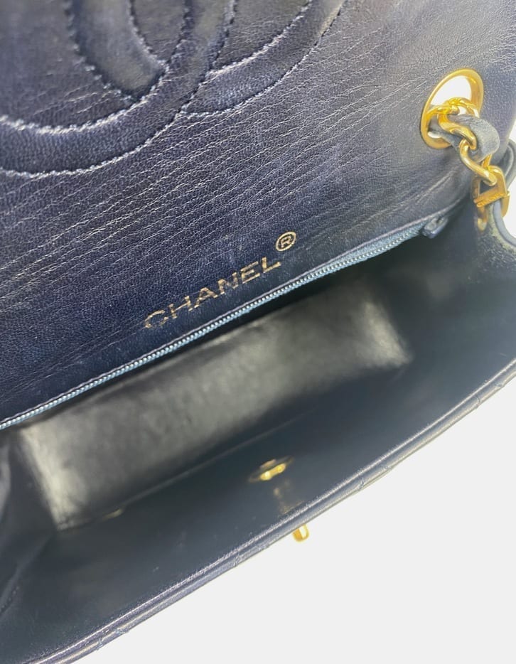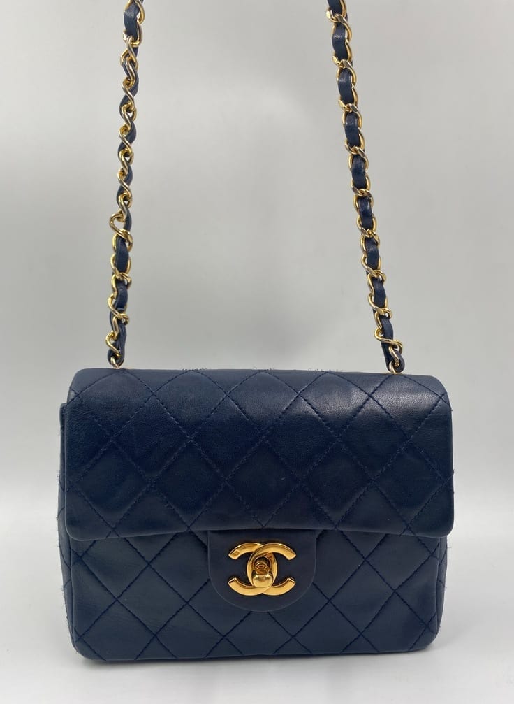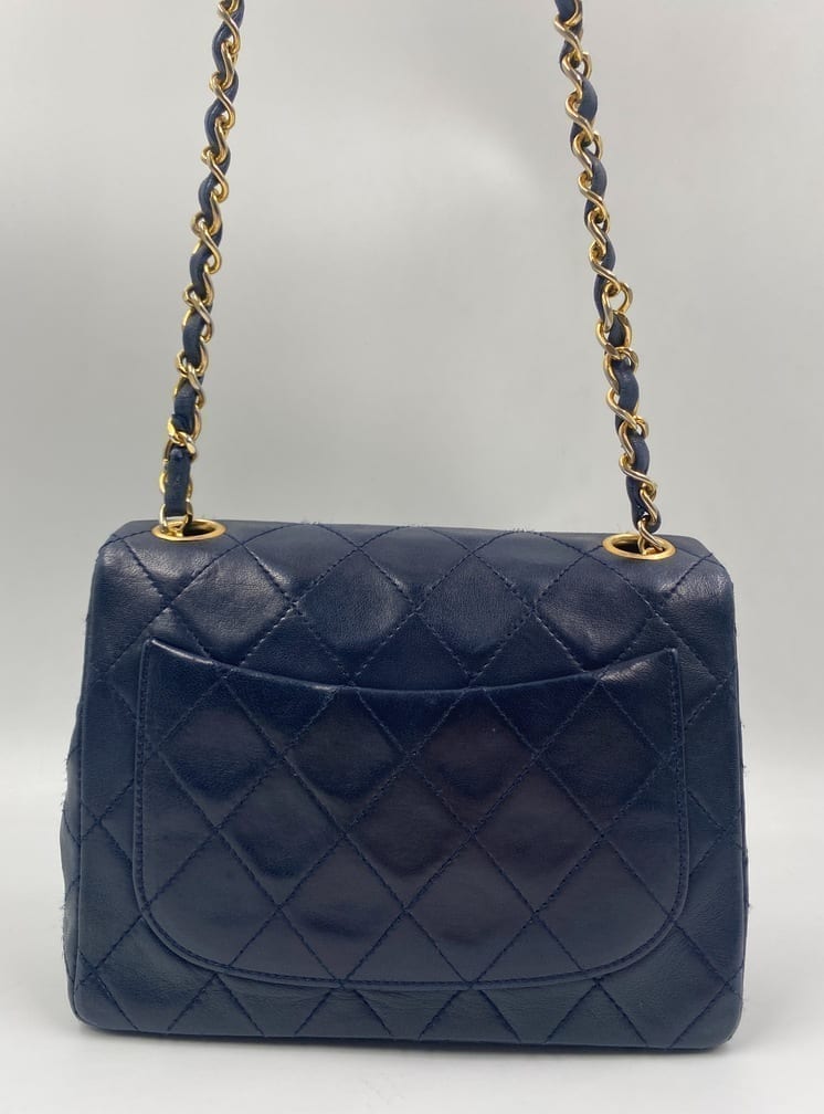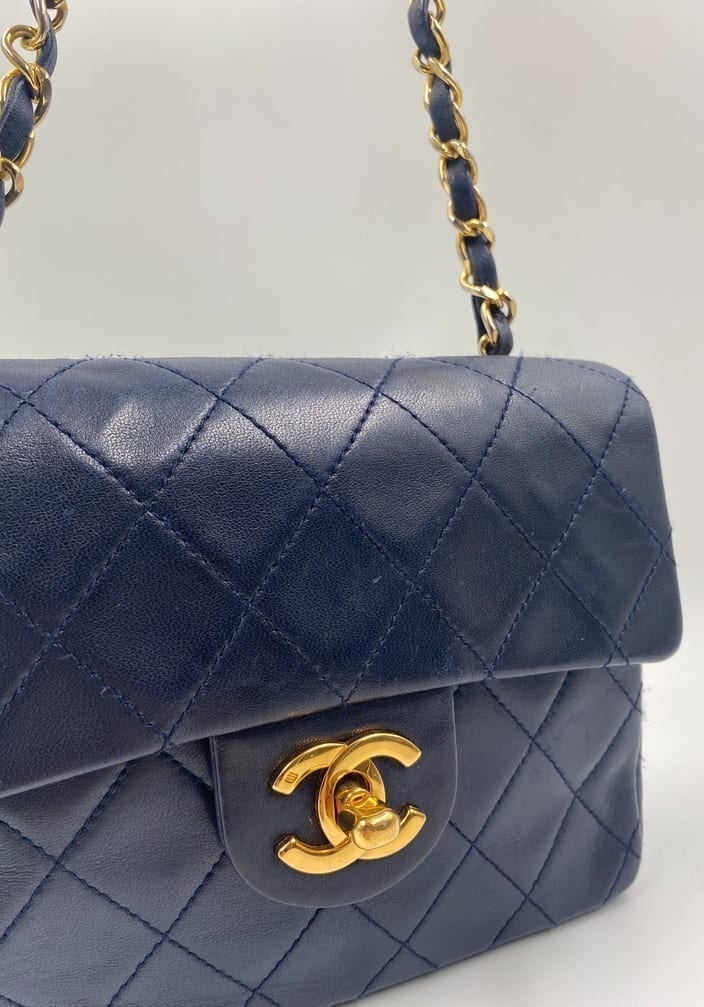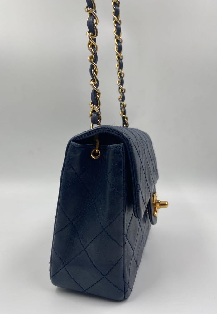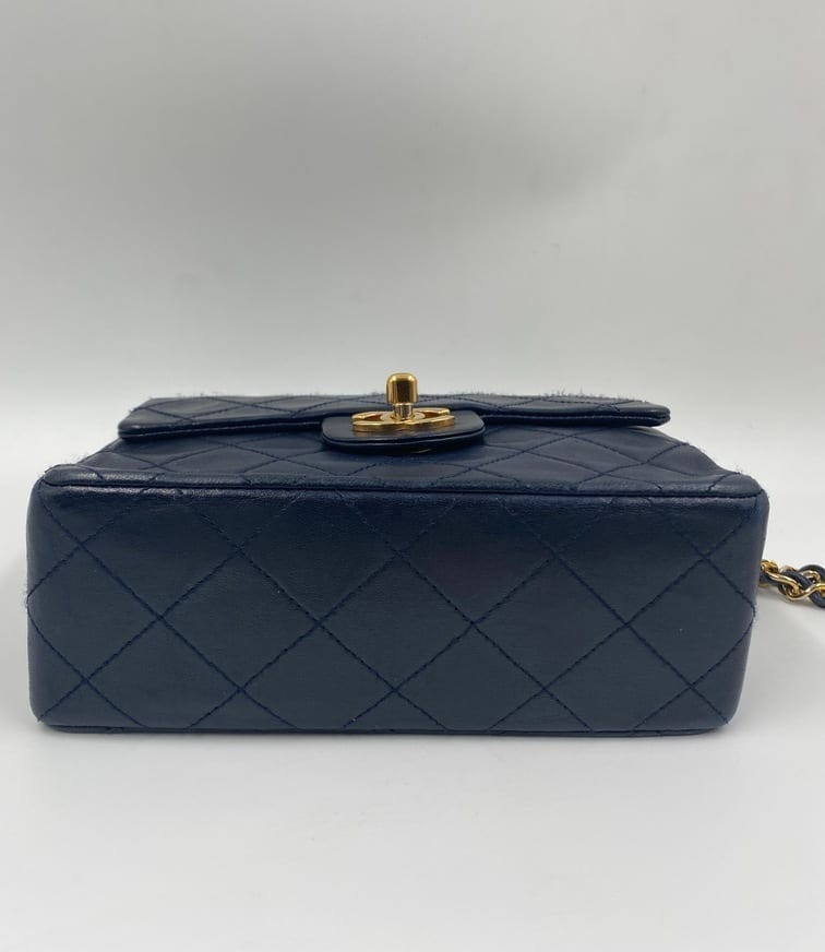 A beautiful vintage Chanel Mini Flap crossbody bag made between 1989-1991. The quilted navy lambskin leather is silky soft with minor signs of wear. The gold hardware is also in New condition, with minor signs of wear. The lock has the hallmark stamp to show the lock and chain has been plated in 24k gold. Chanel stopped plating the hardware with 24k gold in 2008. The sticker inside is intact. Inside the bag has a slip pocket plus a zipped pocket for valuables.