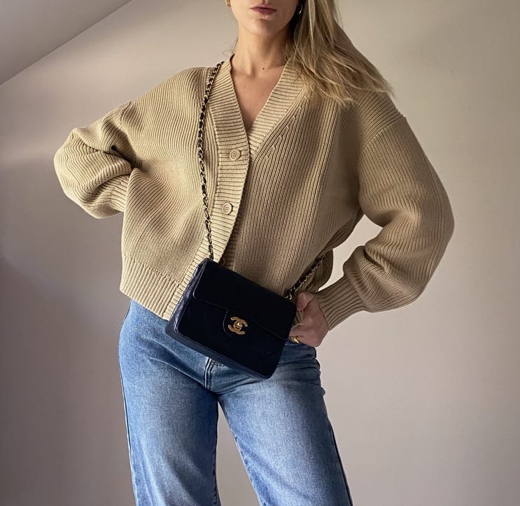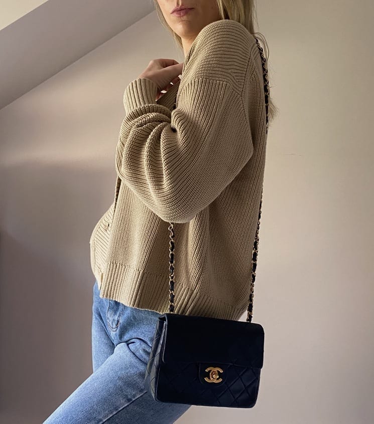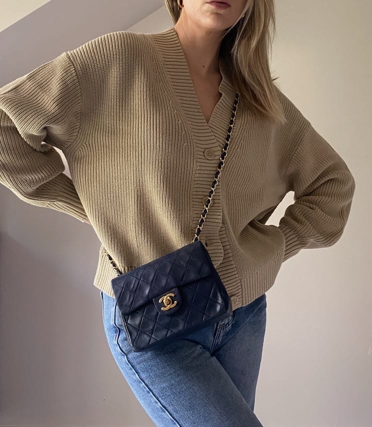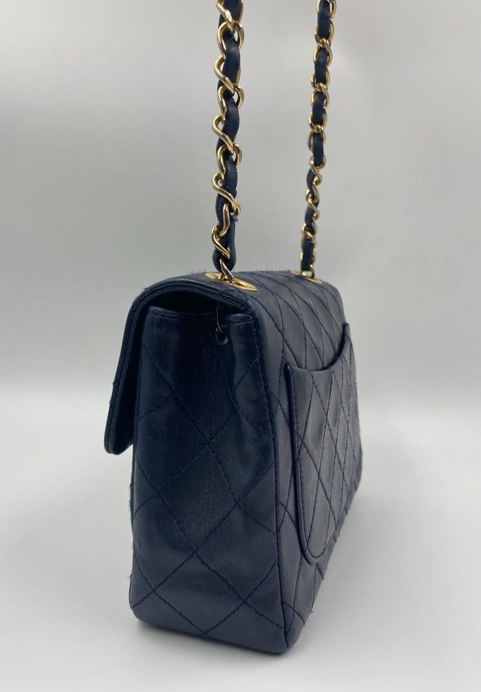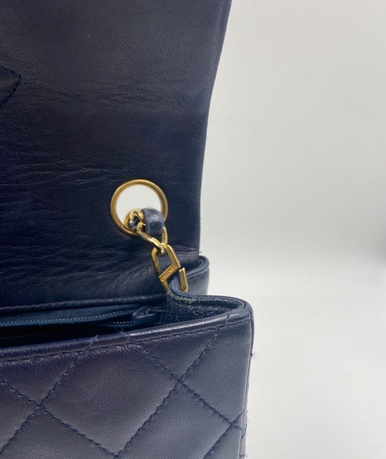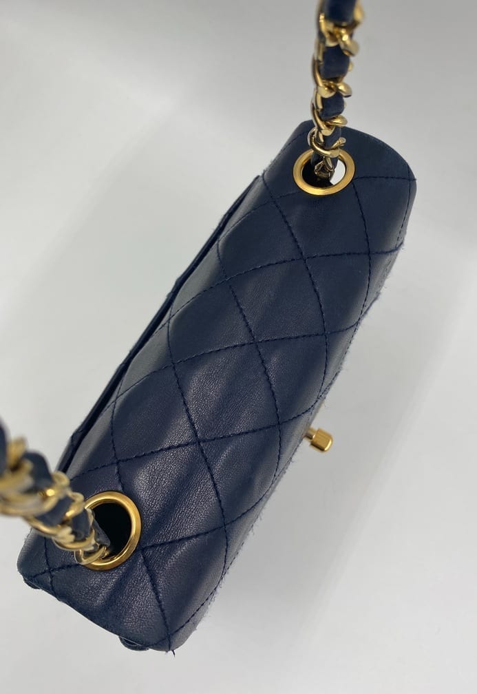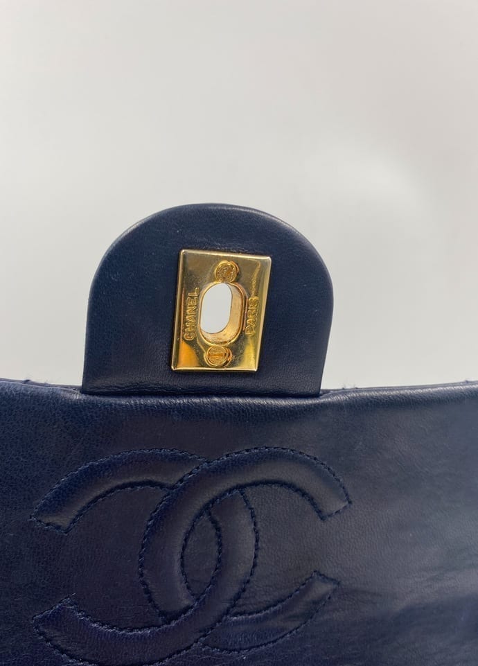 A beautiful vintage Chanel Mini Flap crossbody bag made between 1989-1991. The quilted navy lambskin leather is silky soft with minor signs of wear. The gold hardware is also in New condition, with minor signs of wear. The lock has the hallmark stamp to show the lock and chain has been plated in 24k gold. Chanel stopped plating the hardware with 24k gold in 2008. The sticker inside is intact. Inside the bag has a slip pocket plus a zipped pocket for valuables.