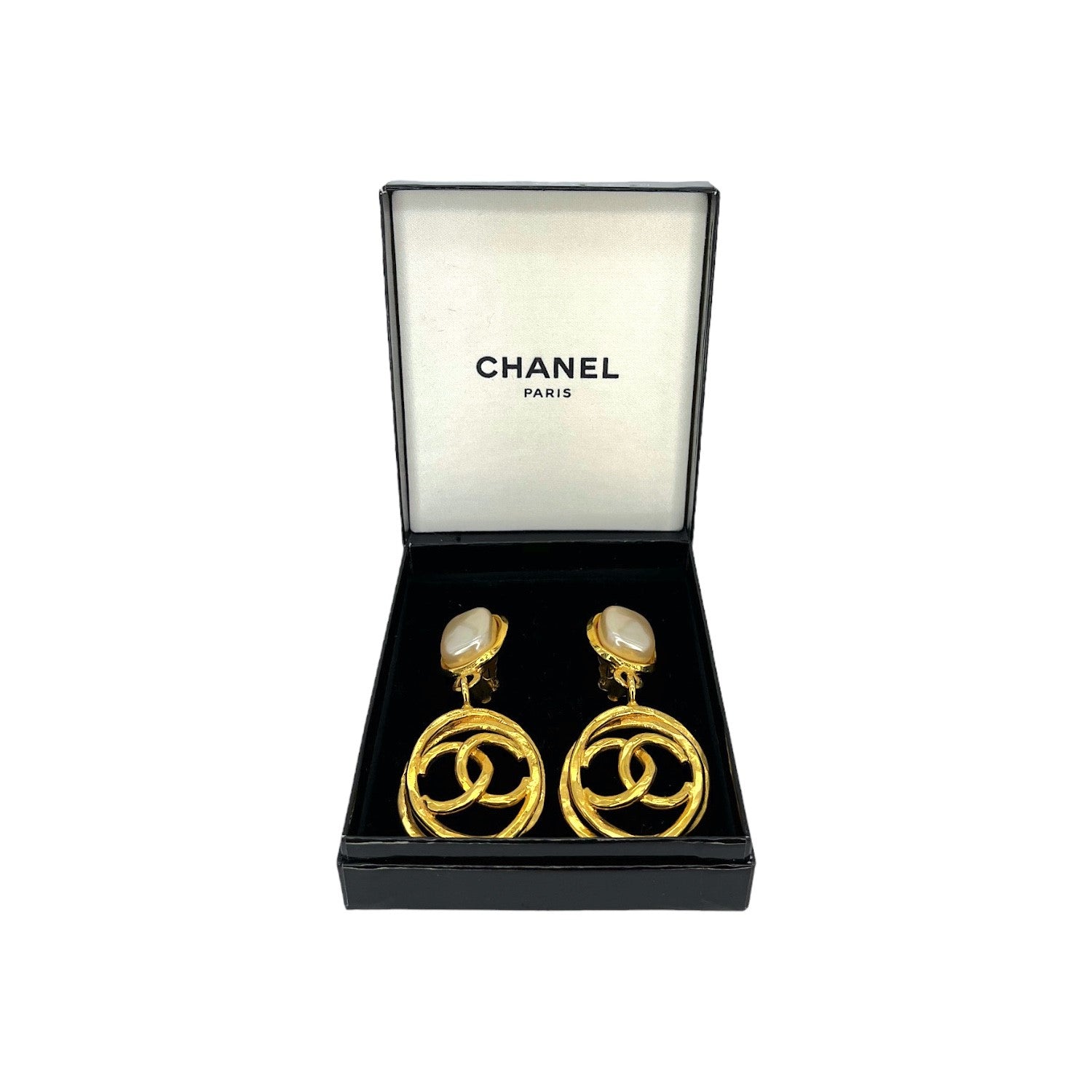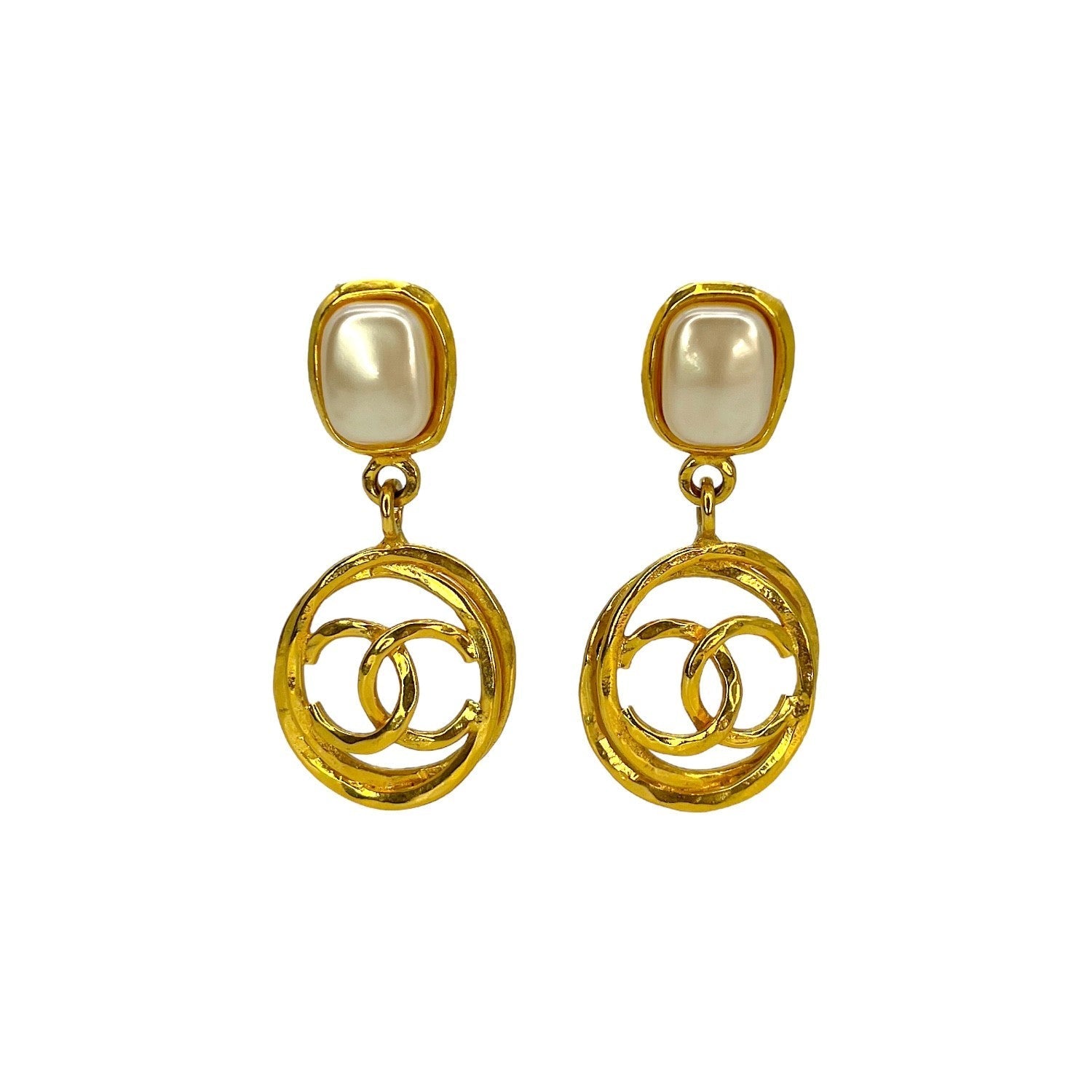 These Vintage Chanel Clip-On Earrings are finely crafted of 24K Gold-Plated Hardware with 2 large rectangular pearl gemstones and it features the iconic Oversized Chanel 'CC' logo. These very beautiful drop earrings have clip closures and they would be an excellent addition to your Vintage Chanel jewelry collection!