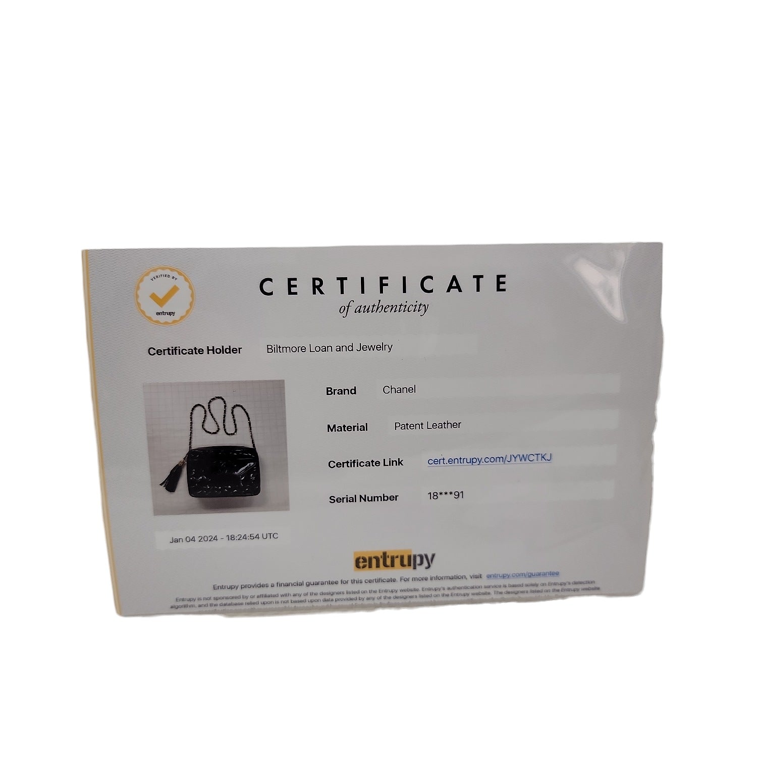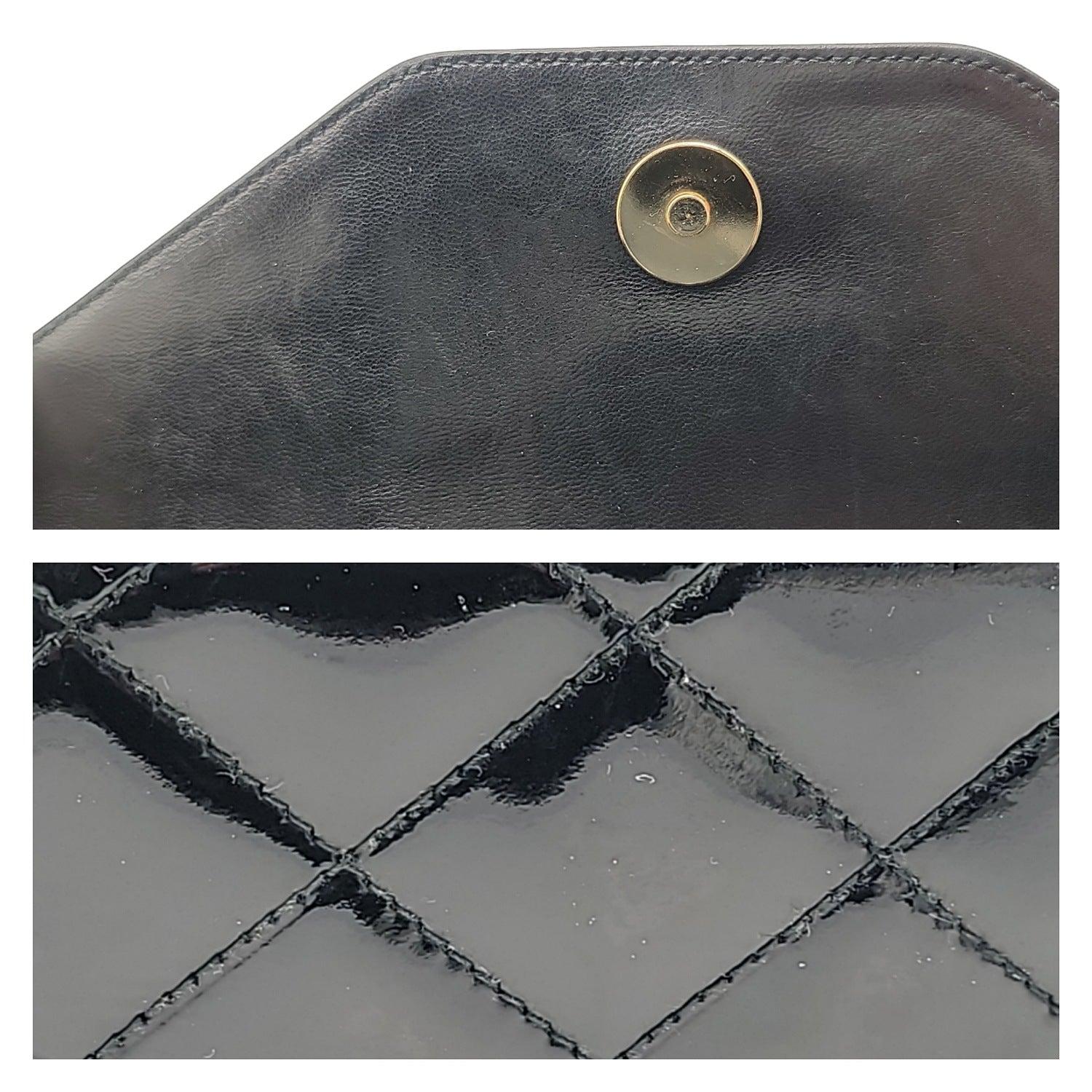 This Vintage CC Chanel handbag/Camera Bag is crafted of quilted black patent leather and features 24k plated gold hardware, and a CC logo quilted into thefront. The zipper opens to a roomy main compartment, with side zipper pocket in the interior, it has an exterior pocket, with flap with magnetic snap to the front. The gold plated chain strap is plenty long at a 20.5" drop to wear on your shoulder, or cross body.