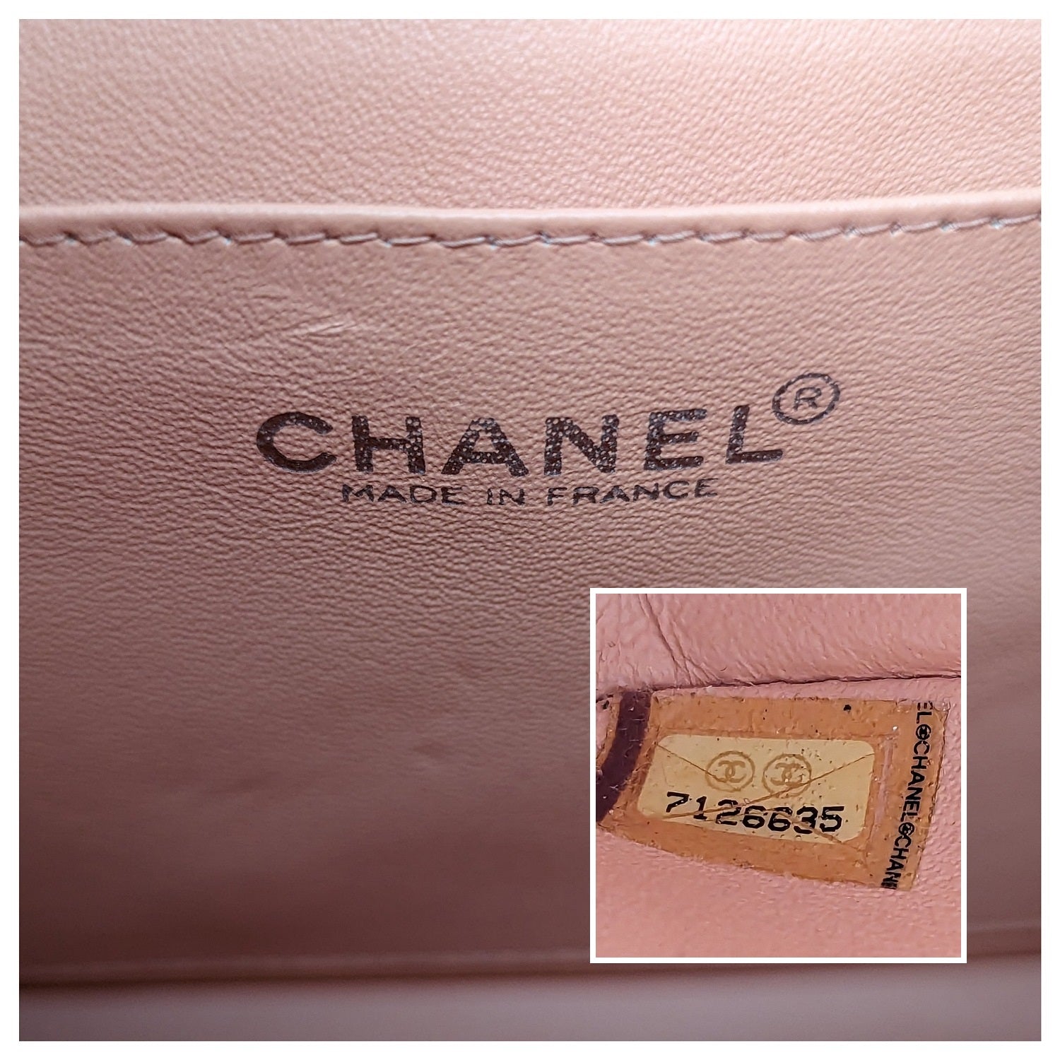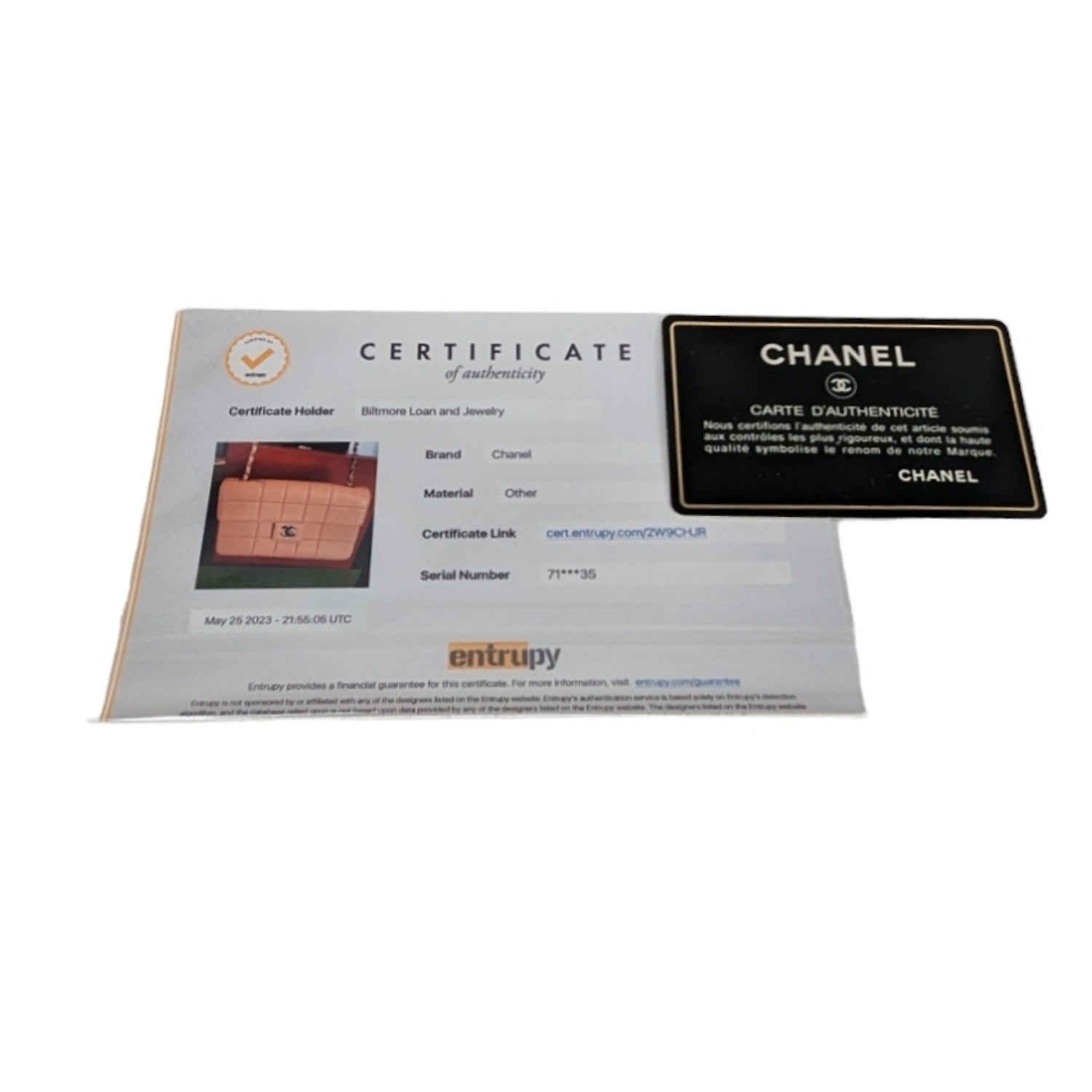 Peach square quilted lambskin leather with polished silver-tone hardware, chain-link shoulder strap, an exterior rear patch pocket, tonal leather lining, two pockets at interior wall, the front flap secured with a CC turn-lock closure. Made in France.