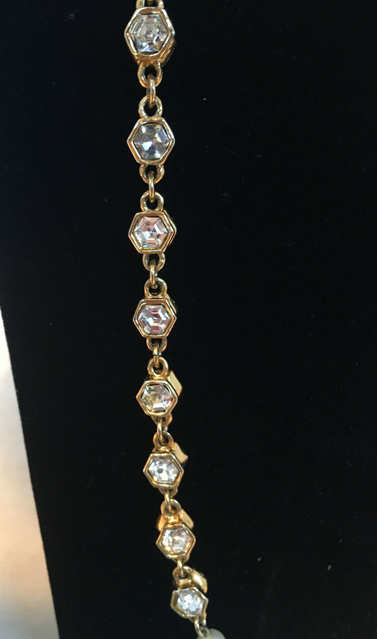 BEAUTIFUL Chanel Vintage Pearl and Crystal Beaded Necklace in excellent condition. Round pearl beads with small gold hexagon crystal beads. This piece switches between 12 crystal beads and 17 pearls throughout. Can be worn long or wrapped for a layered look. Can also be paired with a variety of other necklaces adding a touch of classic Chanel style to any ensemble. No scratches, scuffs, or chips. Perfect for collectors and vintage lovers alike. Total length=38"