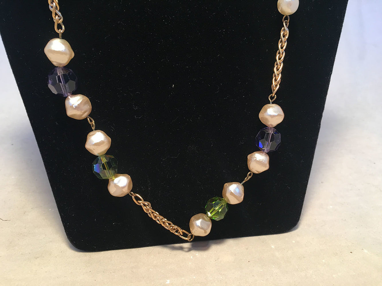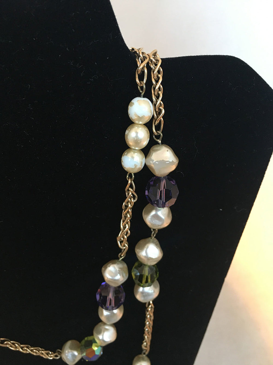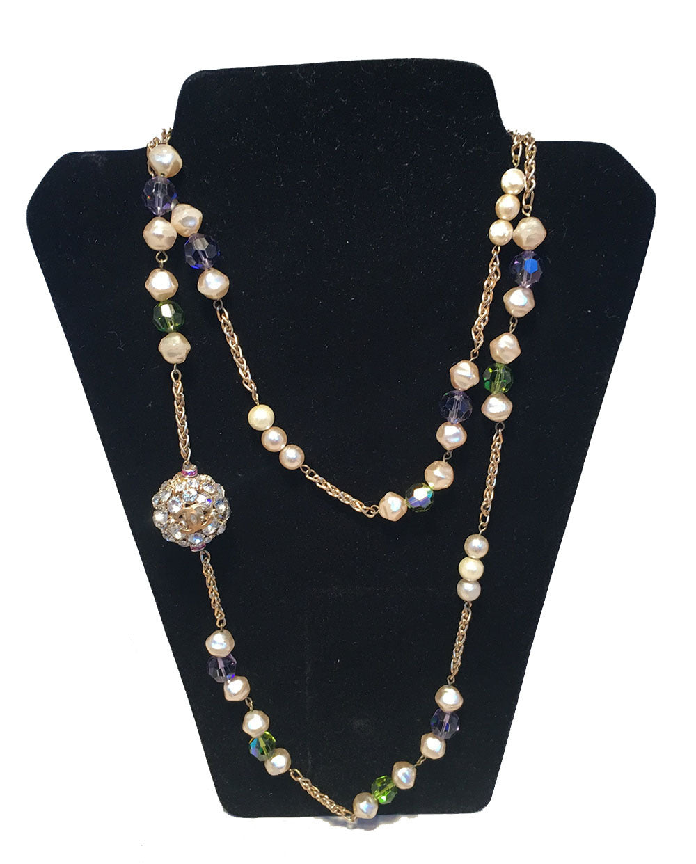 Chanel Vintage Pearl and Green and Purple Beaded Necklace with Crystal Ball