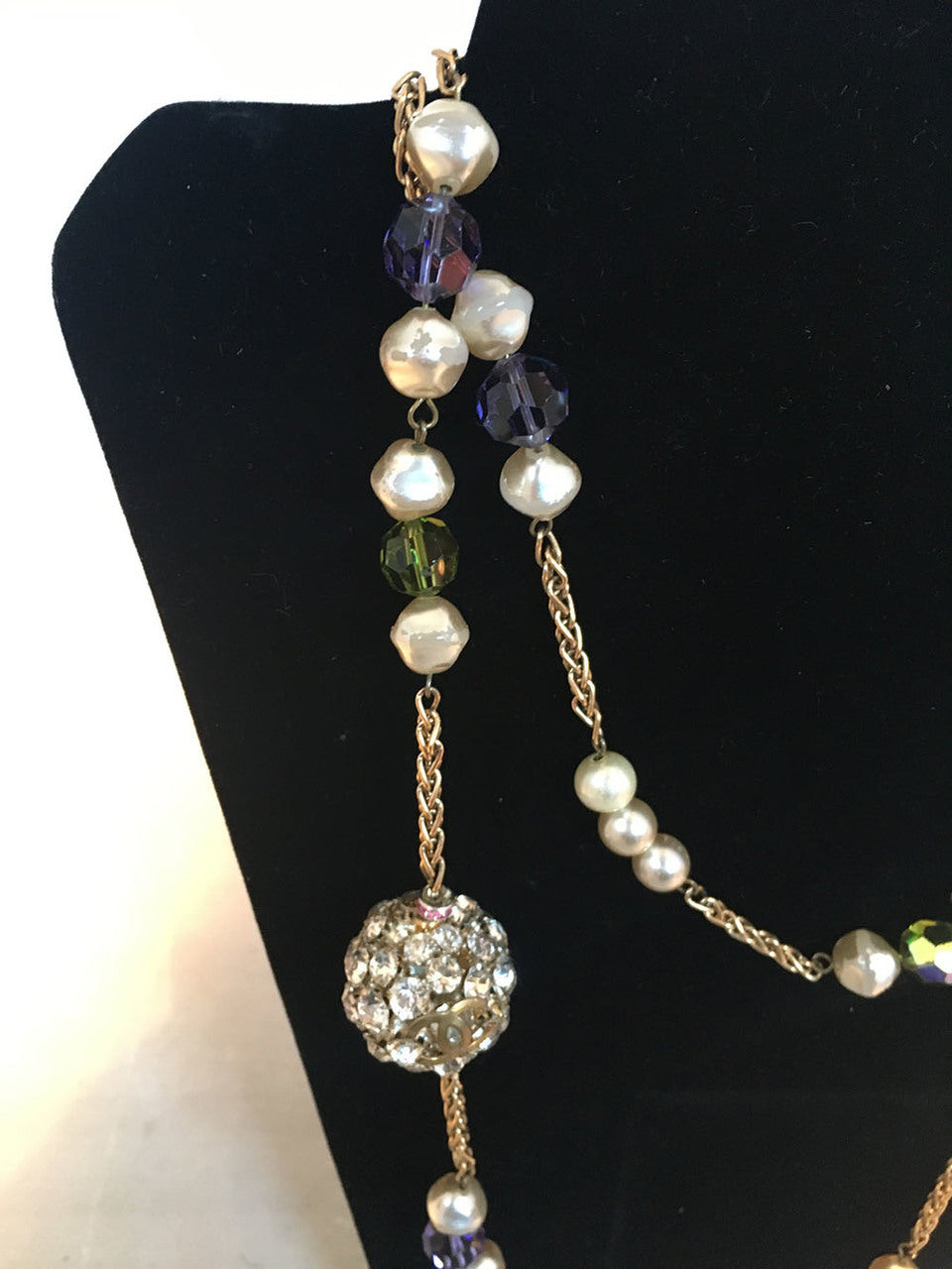 AMAZING Chanel Vintage Pearl and Green and Purple Beaded Necklace with Crystal Ball in New condition. Gold link chain necklace with large pearl beads, green and purple crystal beads and a centered large rhinestone crystal ball detail featuring the CC chanel logo. Wear consistent with age and use throughout. Pearl coating is starting to chip on pearl beads. Gentle hairline scratches on green and purple beads. See photos for details. This is a very rare piece that is no longer made or sold. Perfect for vintage collectors and Chanel lovers alike. Can be worn long, doubled or layered with other necklaces. Total length=50"