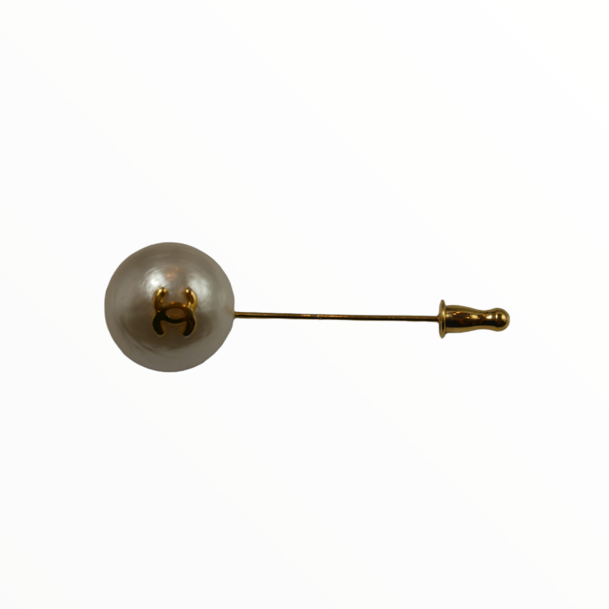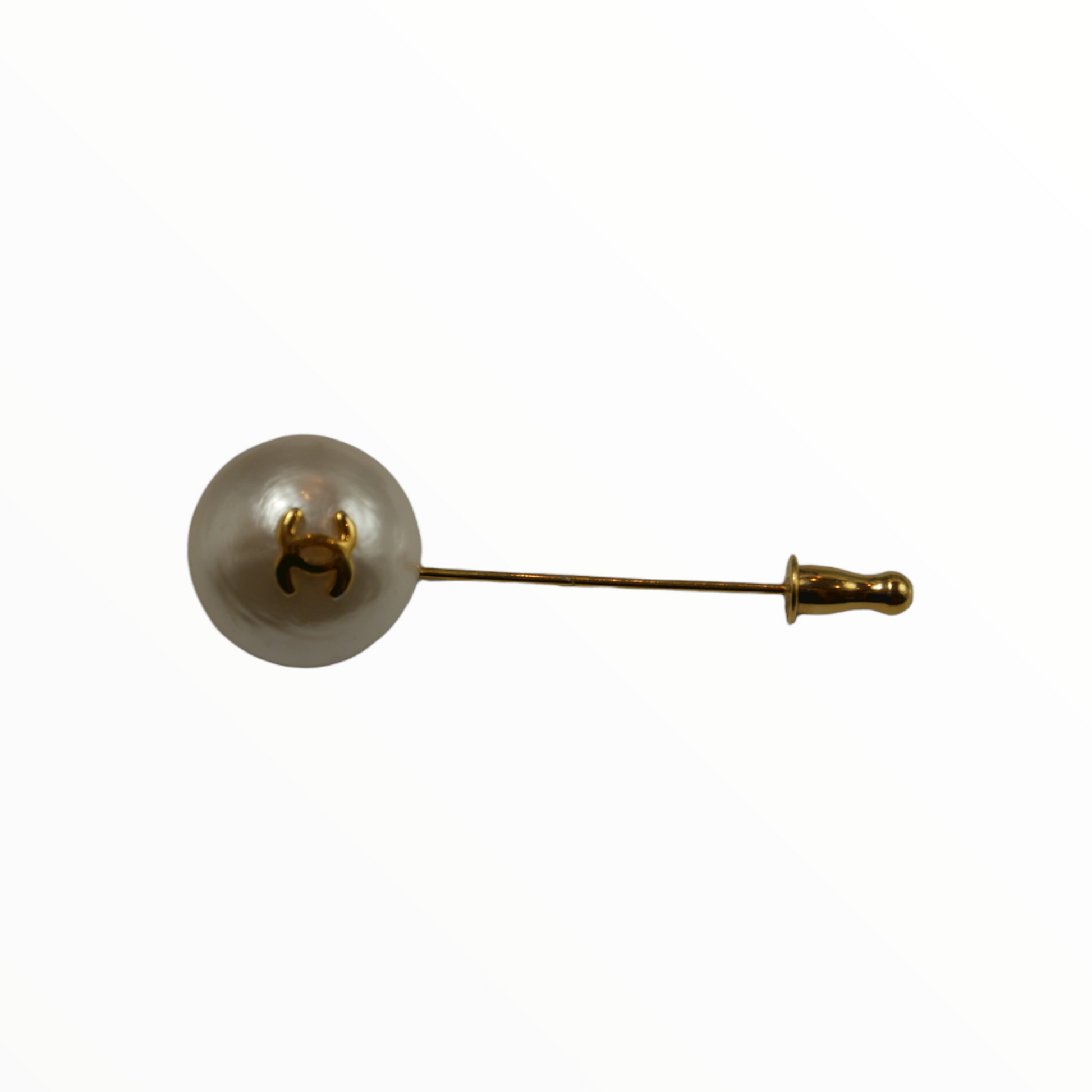 DESCRIPTION: Chanel pearl brooches with gold logo