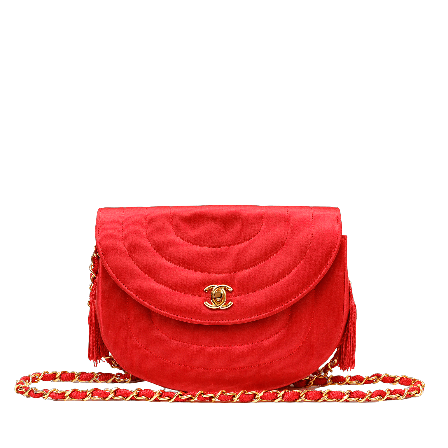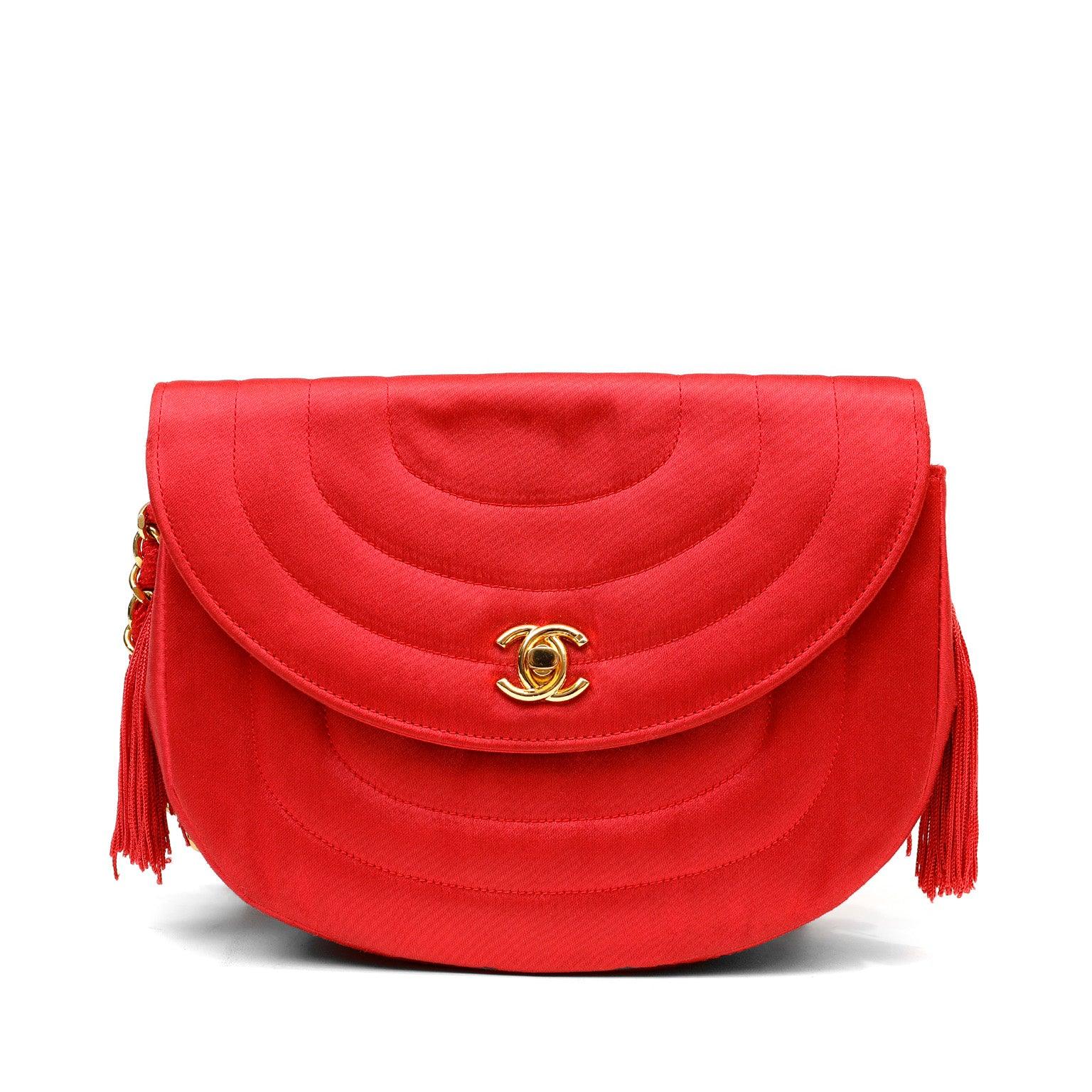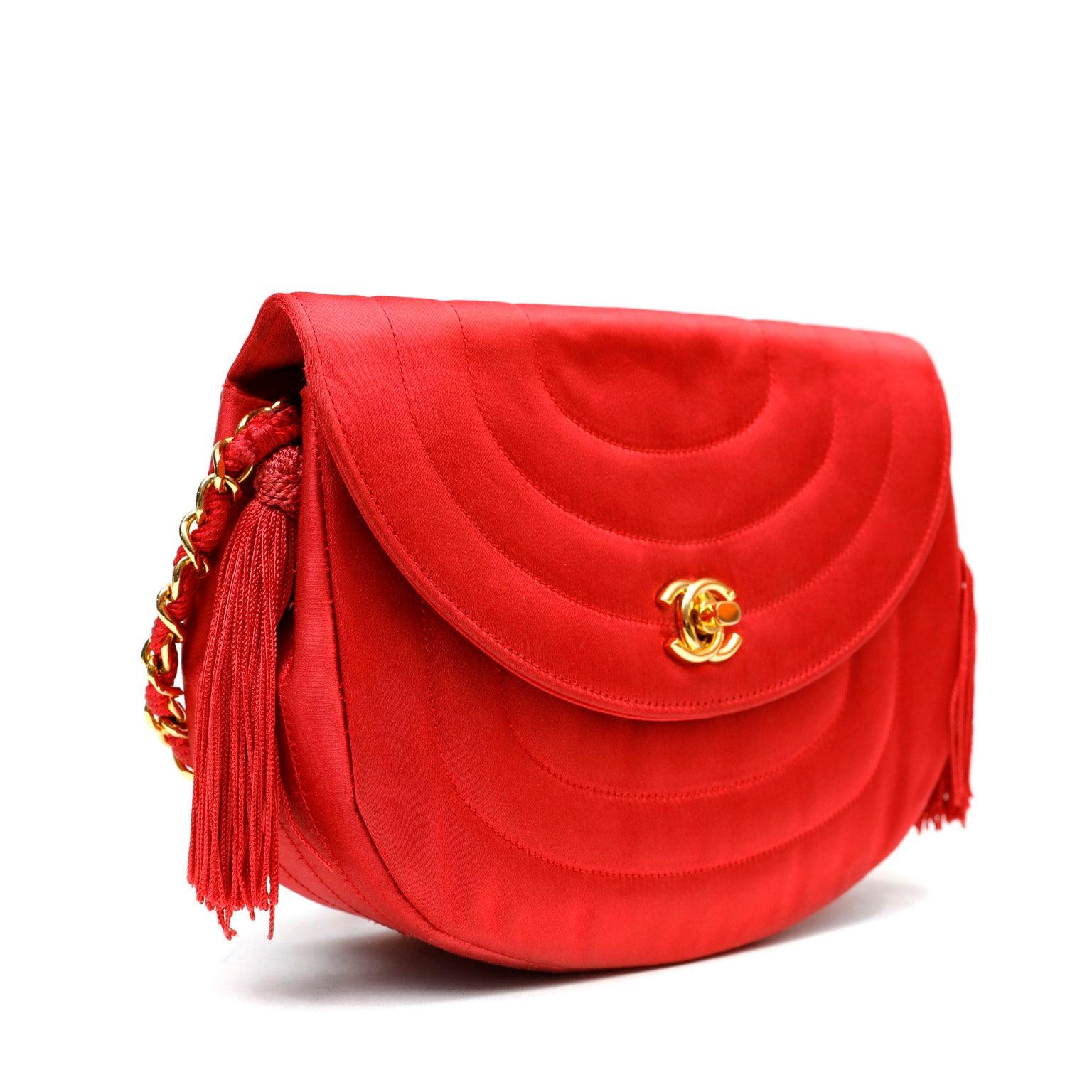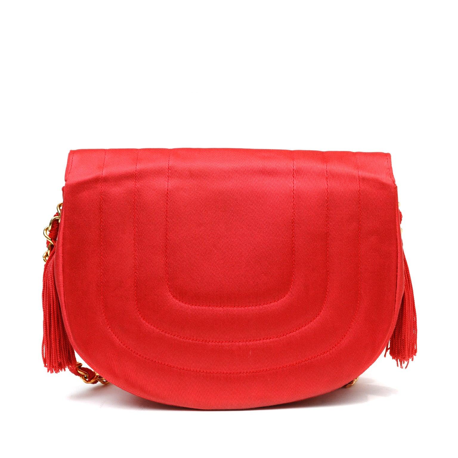 This Chanel Red Satin Vintage Evening Bag is in superb condition. Uniquely shaped in vivid red satin, this crossbody piece is truly beautiful. Bright red satin vintage bag with soft half-moon shaped flap and gold tone hardware accents. Subtly stitched with interlocking CC closure and large fabric tassel. Red rope fabric is intertwined with gold chain on the long crossbody strap. Dust bag included.