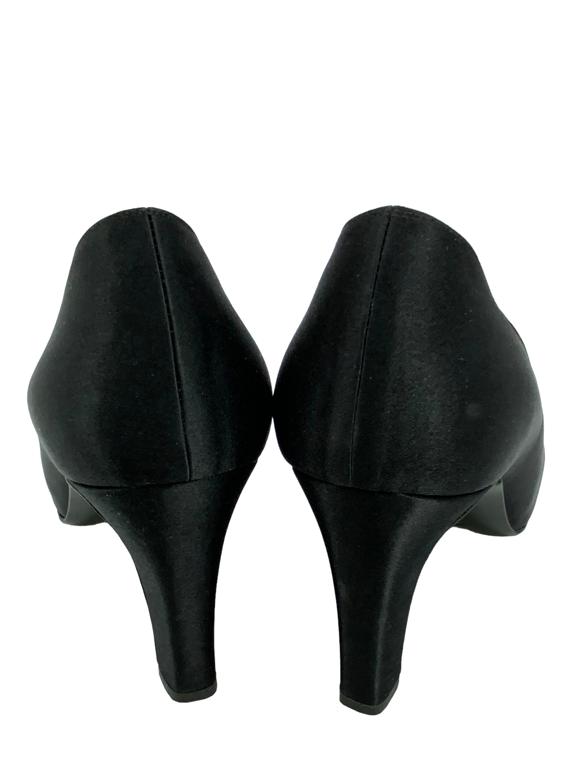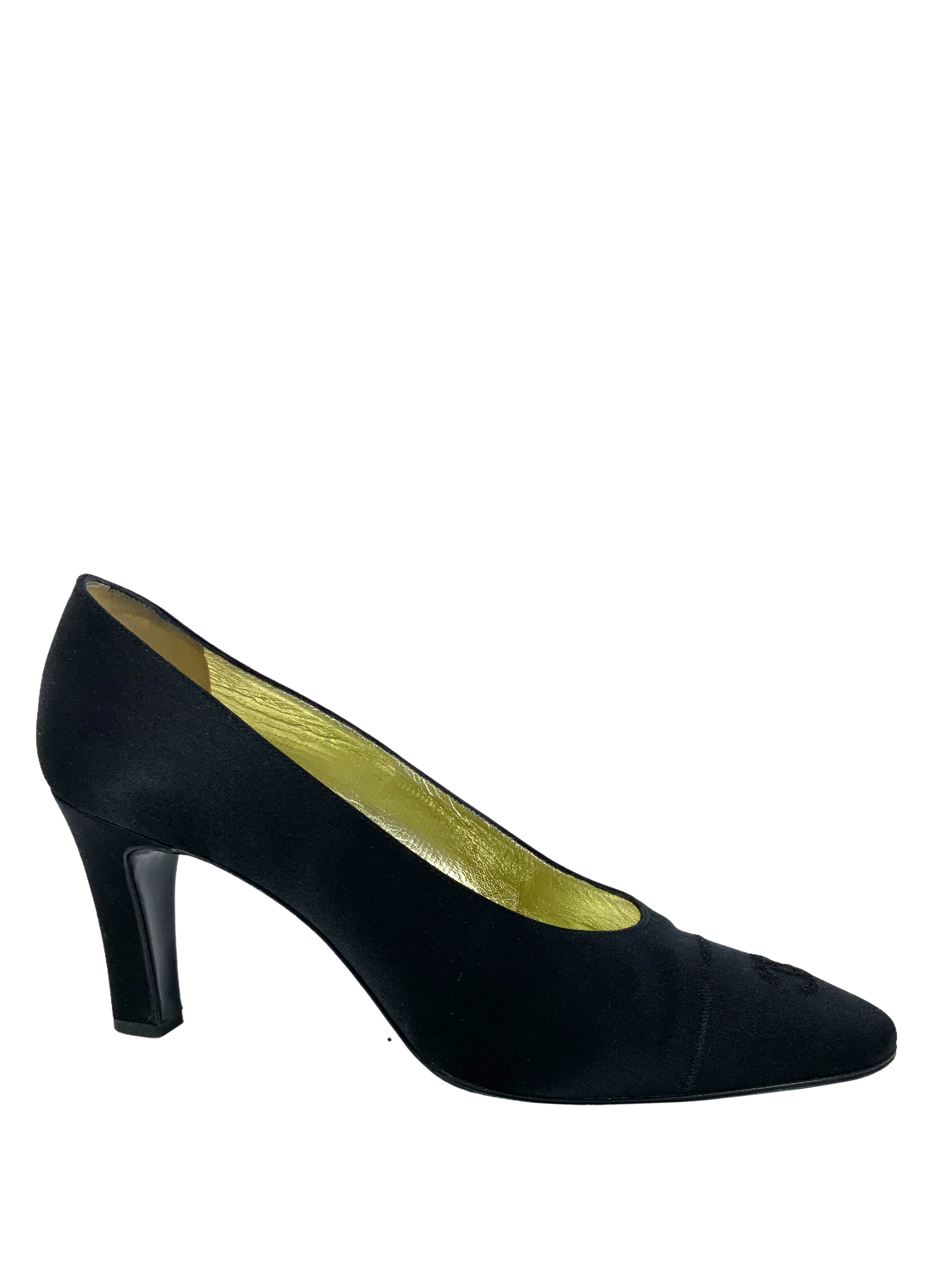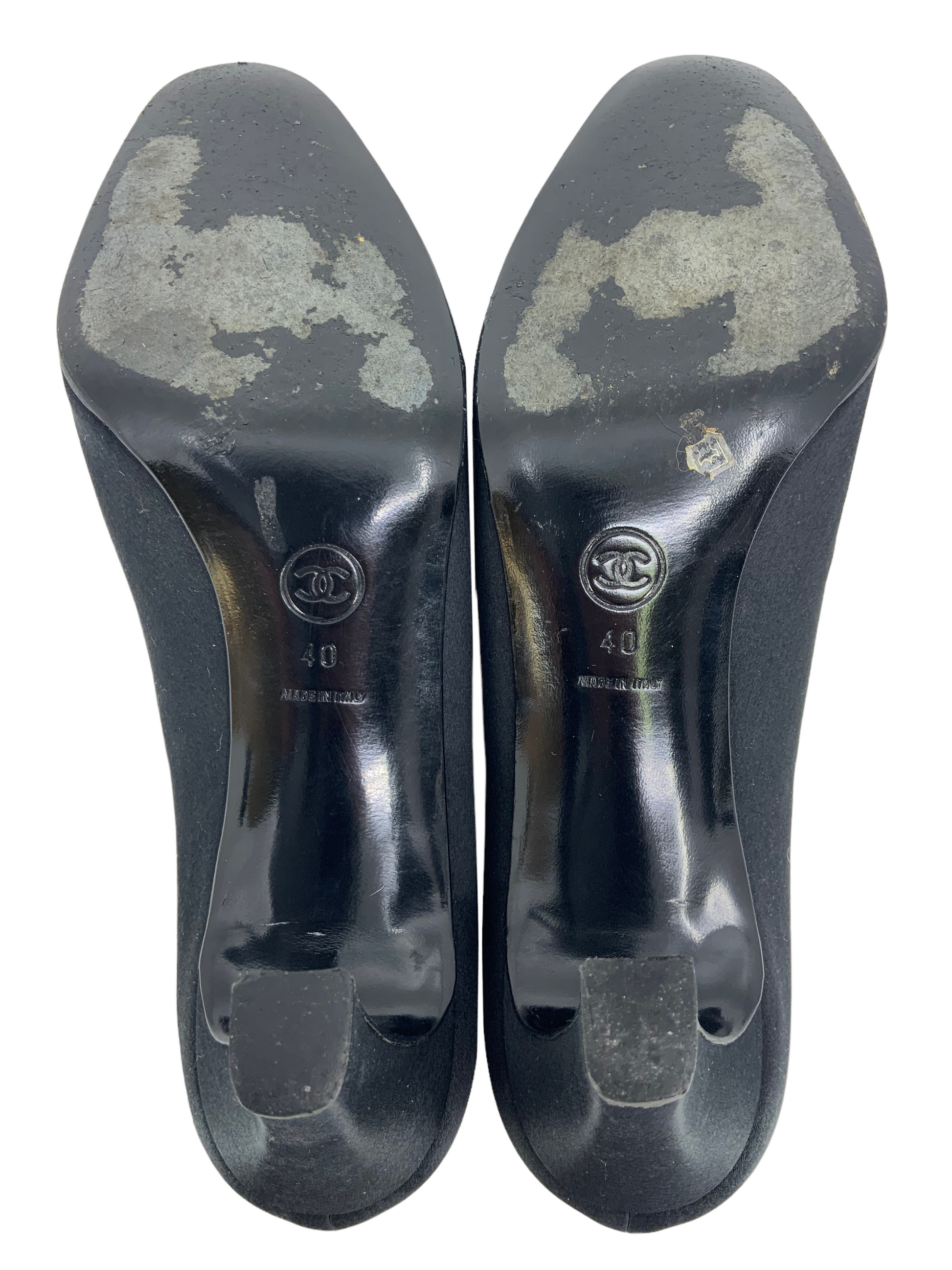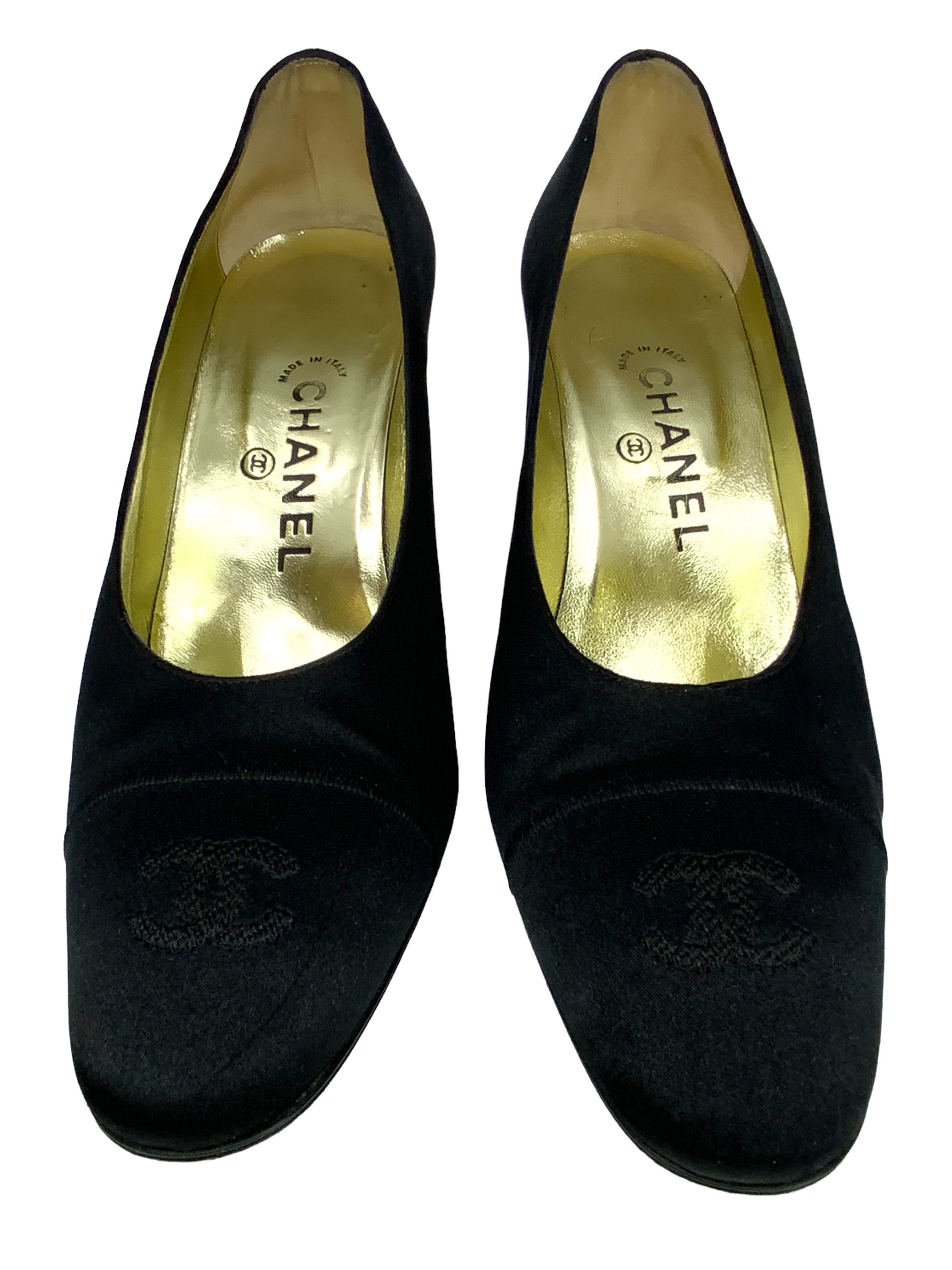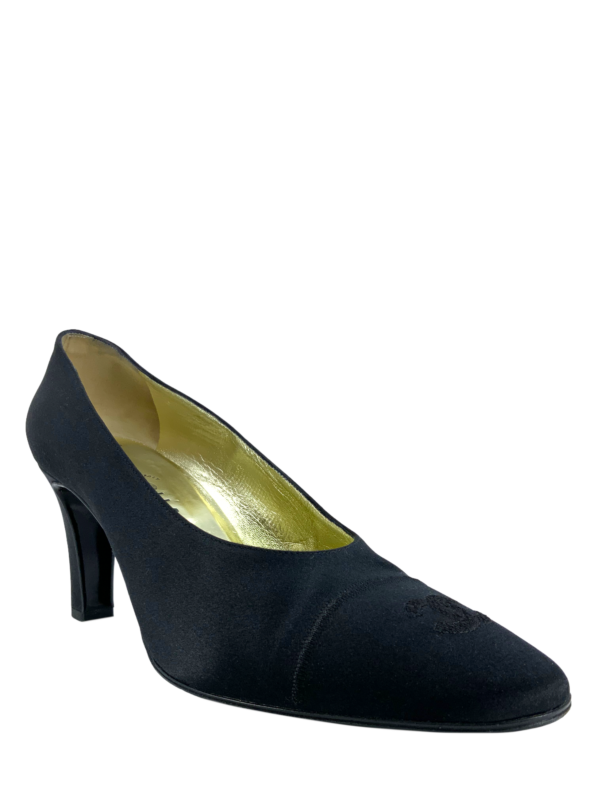 Step out in style with thisvintage pair of CHANEL Vintage Satin CC Cap Toe Pumps Size 10 (IT 40) beautifully crafted in soft-to-the-touch black satin with awell-rounded pointed toe. Featuring a satin 'CC' logo cap-toe, a self-covered heel and a metallic gold leather insole.