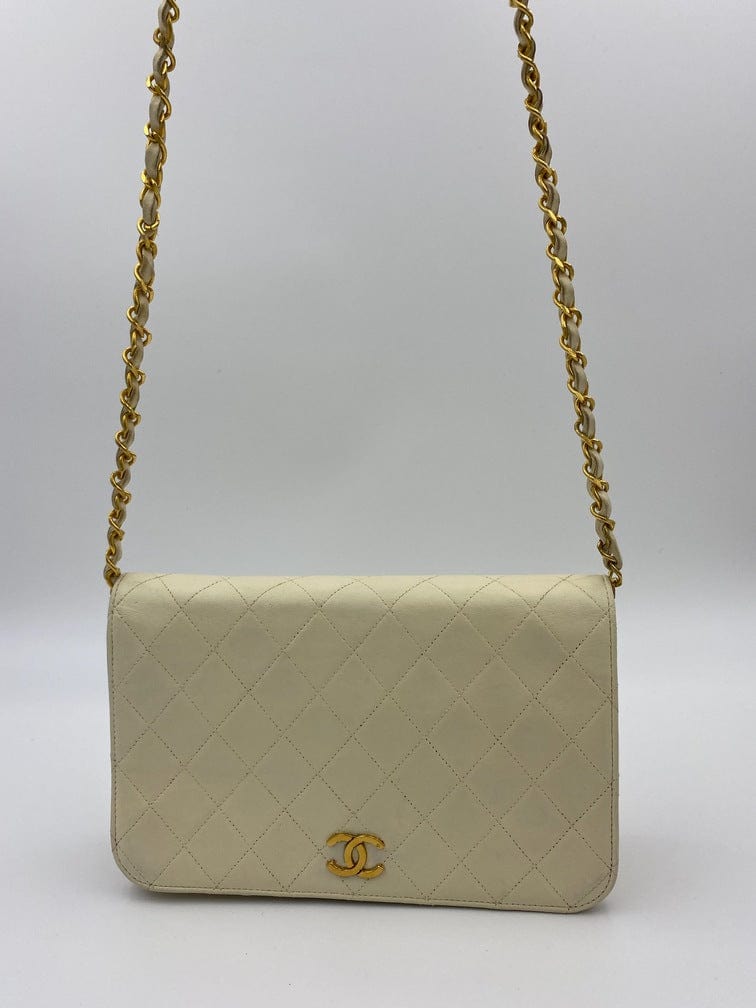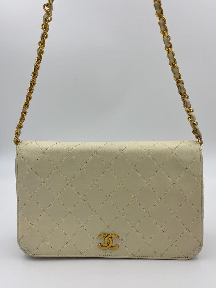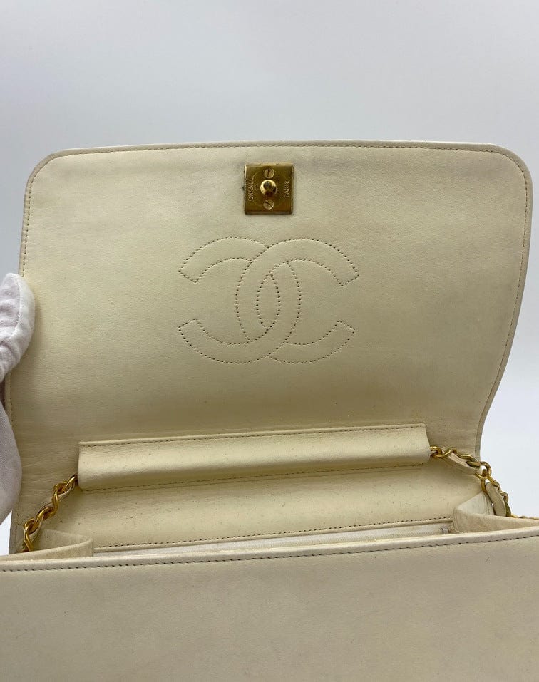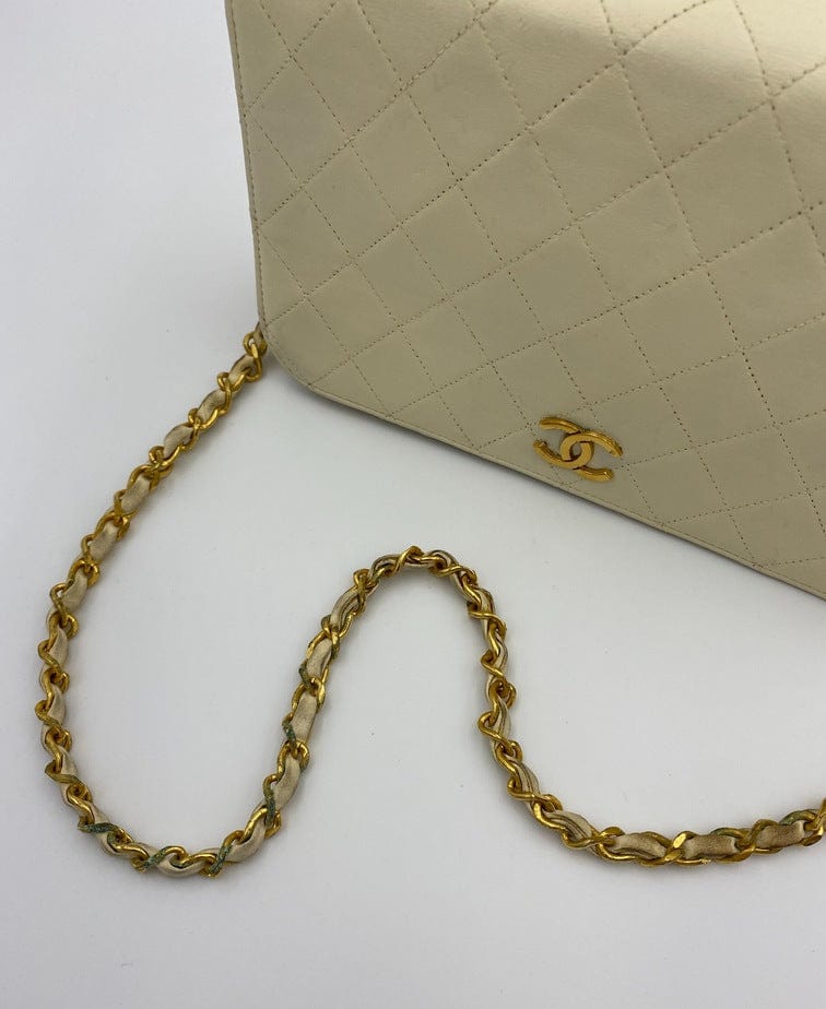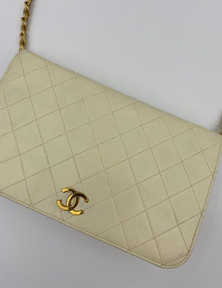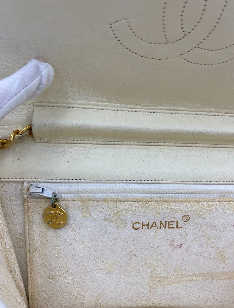 A beautiful vintage cream flap Chanel shoulder bag with the iconic CC on the front. There is a hallmark on the CC hardware showing us that the gold hardware is plated in 24k gold. Chanel stopped plating with real gold in late 2008. There are some lovely Chanel branding details on this bag, under the flap the CC is stitched under the flap. Inside the bag the gold CC charm is still intact on the inner zip. From the serial number we know this bag was made between 1986-1988.