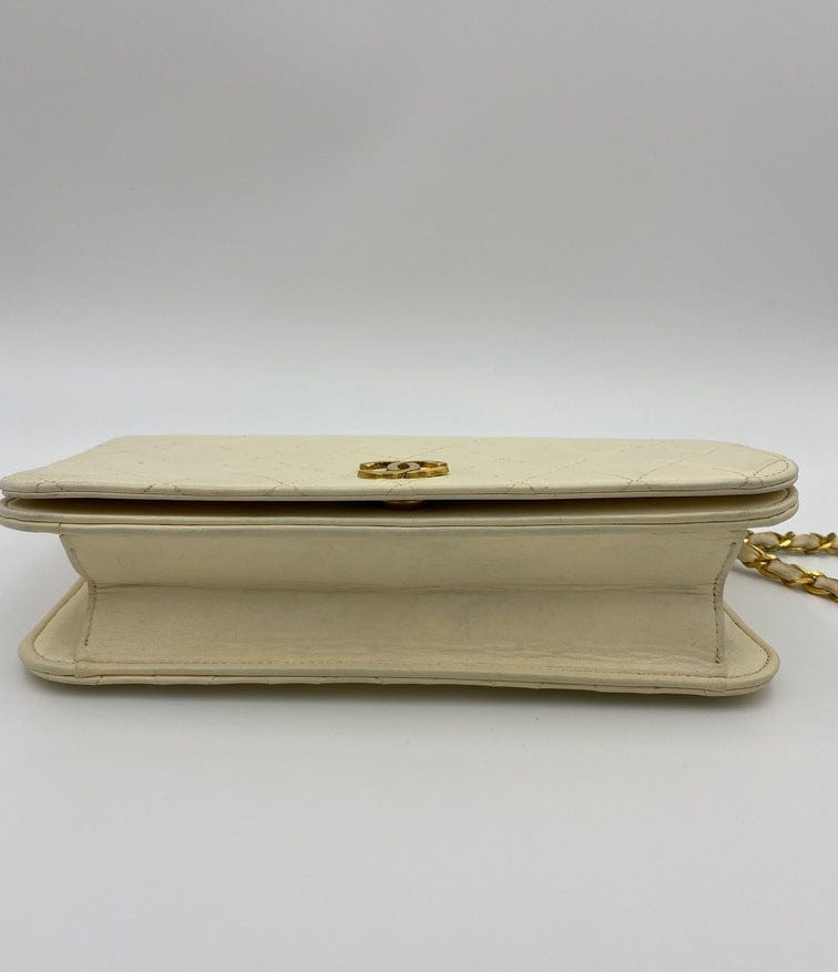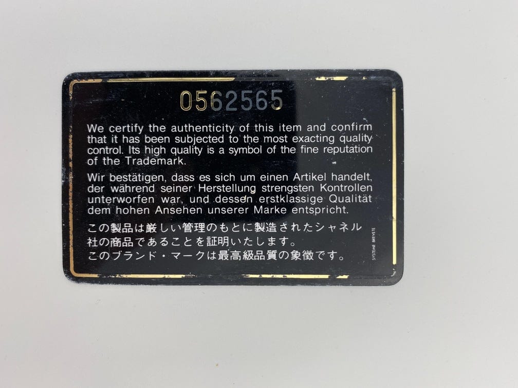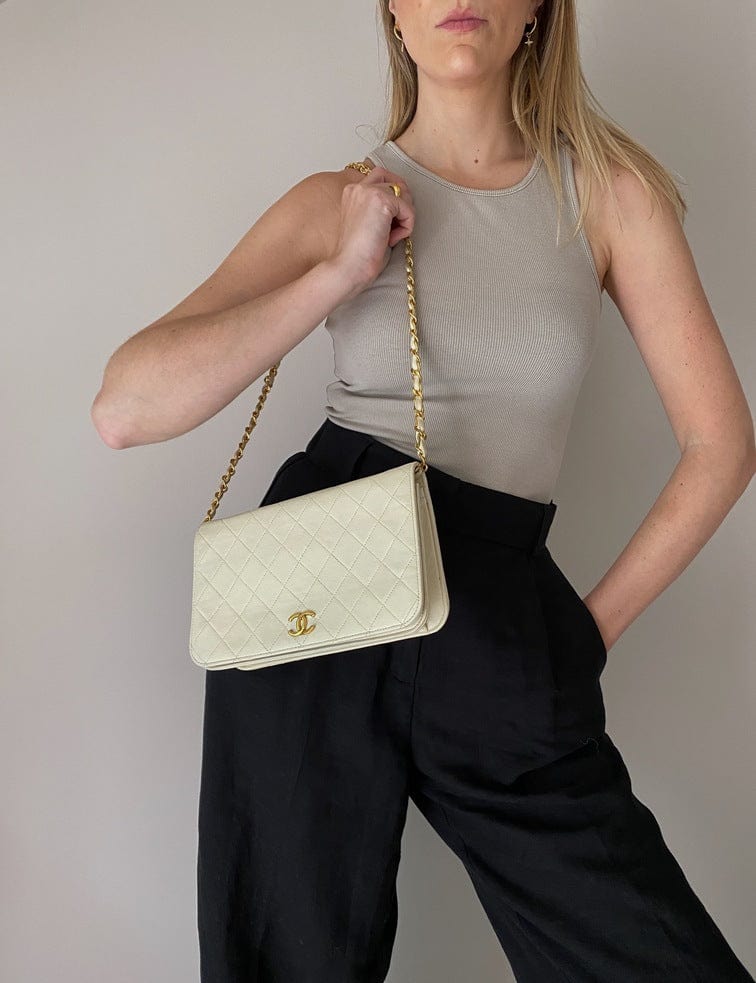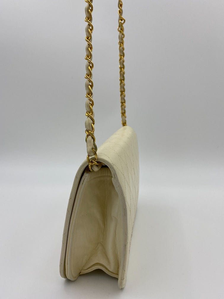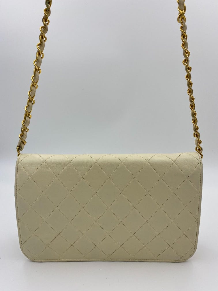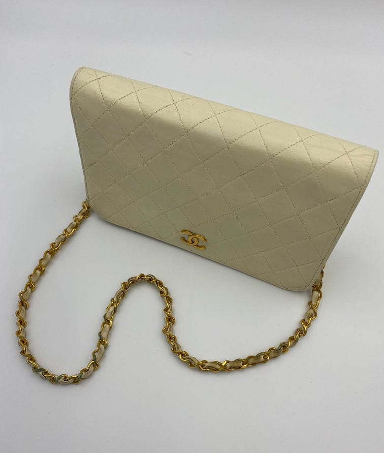 A beautiful vintage cream flap Chanel shoulder bag with the iconic CC on the front. There is a hallmark on the CC hardware showing us that the gold hardware is plated in 24k gold. Chanel stopped plating with real gold in late 2008. There are some lovely Chanel branding details on this bag, under the flap the CC is stitched under the flap. Inside the bag the gold CC charm is still intact on the inner zip. From the serial number we know this bag was made between 1986-1988.