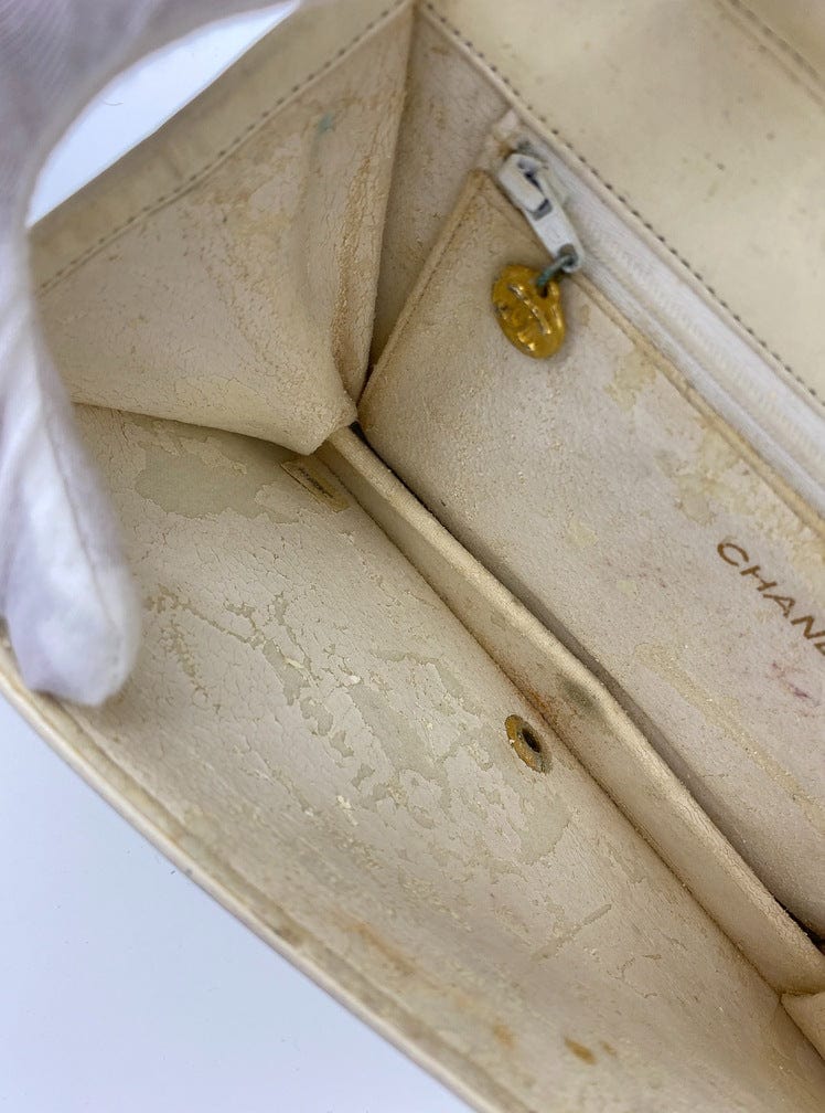 This vintage bag is showing some wear so please view all photos before buying. Inside the bag the leather lining has deteriorated and is flaking and peeling. A bag repair company will be able to replace this bags lining if you so wish. This bag is in full working condition with no holes or tears. There is no vintage smell. The chain has some rust in parts. The outer leather is in New condition as it has had the colour/paint retouched in places by the previous owner (carried out by a bag repair company). This bag comes with the sticker inside (is faded), the and the Chanel dust bag (which is marked).