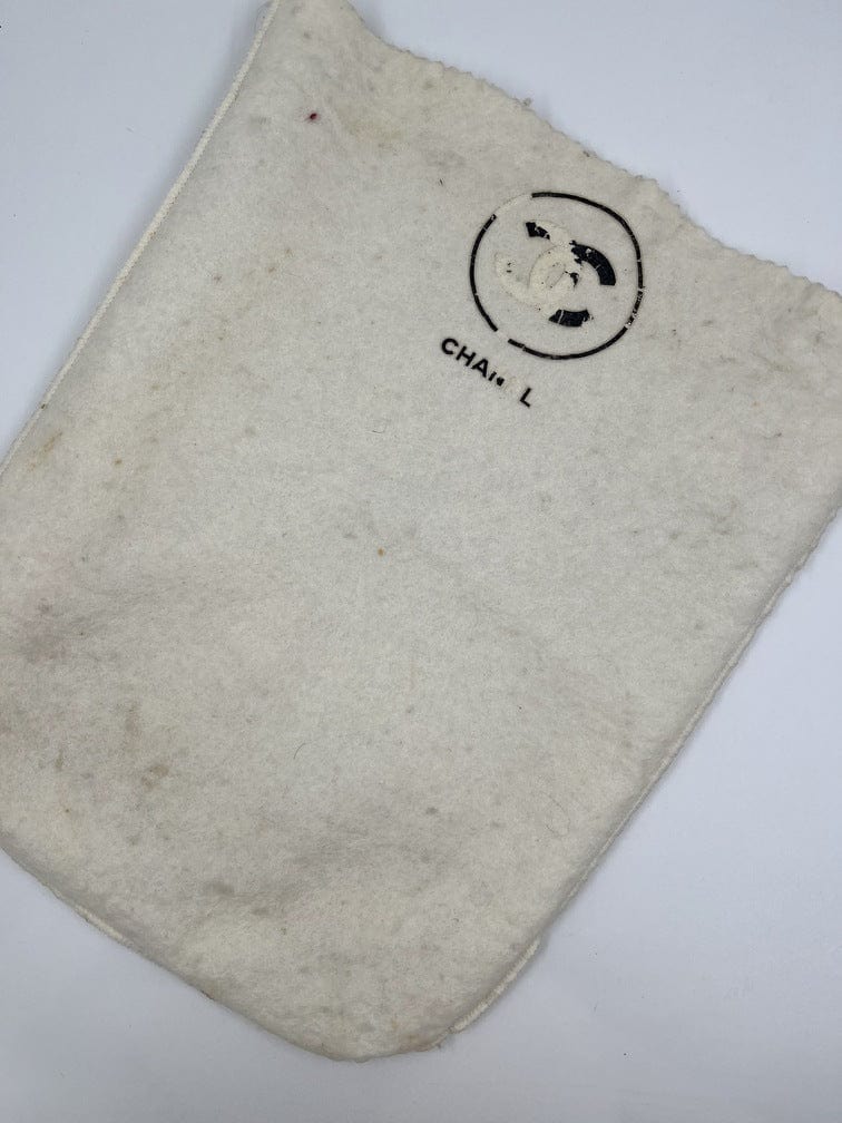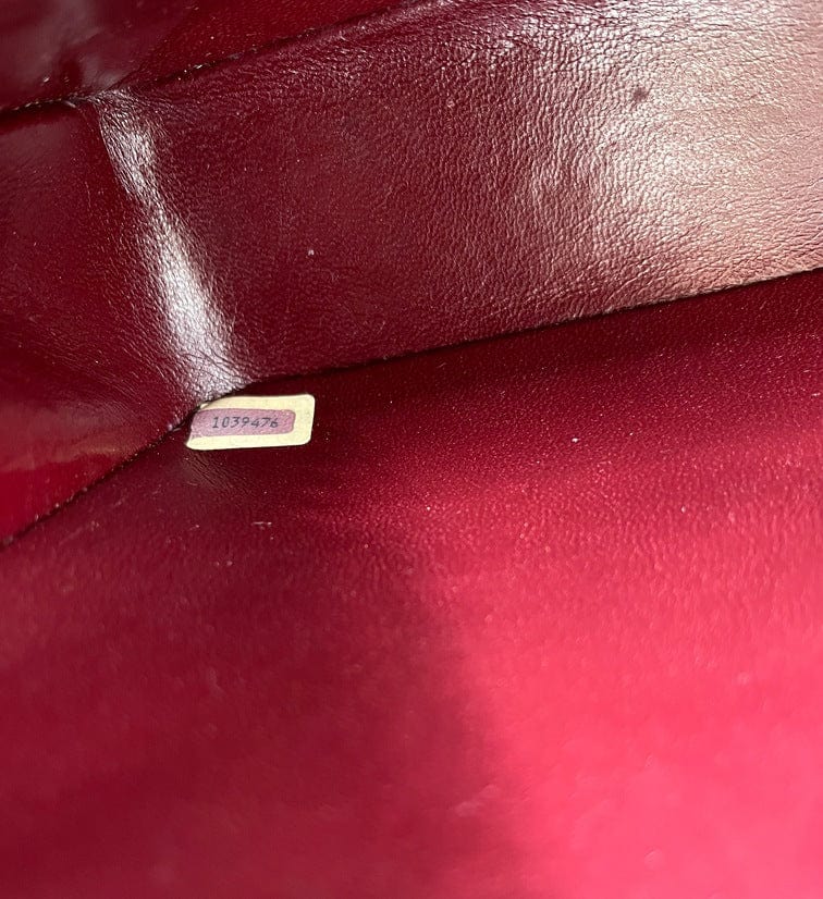 The serial number on thestickertells us the bag was made between 1989 and 1991. This bag is in very New vintage condition with some minor signs of use. The hallmark on the CC turn lock confirms the gold hardware is plated in 24K gold, a real collectors item. Before 2008, Chanel Classic Flaps with gold coloured hardware (chains, clasps, grommets, and CC turn locks) were all plated in real 24K gold.