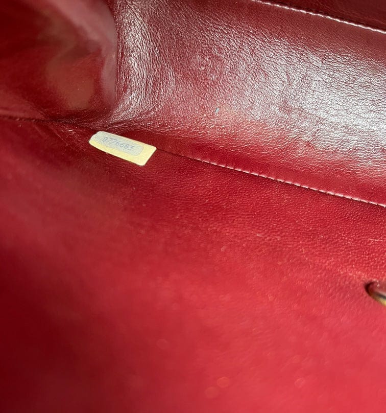 The serial number on thestickertells us the bag was made between 1986 and 1988. This bag is in New vintage condition with some minor signs of use. The hallmark on the CC turn lock confirms the gold hardware is plated in 24K gold, a real collectors item. Before 2008, Chanel Classic Flaps with gold coloured hardware (chains, clasps, grommets, and CC turn locks) were all plated in real 24K gold.