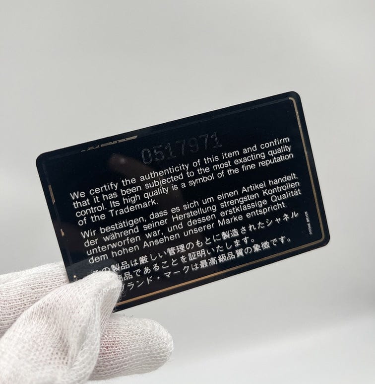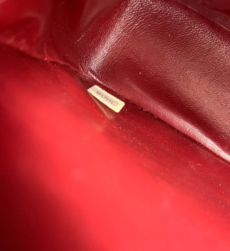The serial number on thestickertells us the bag was made between 1986 and 1988. This bag is in New vintage condition with some minor signs of use. The hallmark on the CC turn lock confirms the gold hardware is plated in 24K gold, a real collectors item. Before 2008, Chanel Classic Flaps with gold coloured hardware (chains, clasps, grommets, and CC turn locks) were all plated in real 24K gold.
