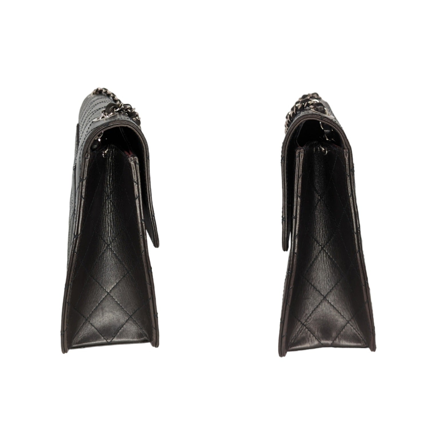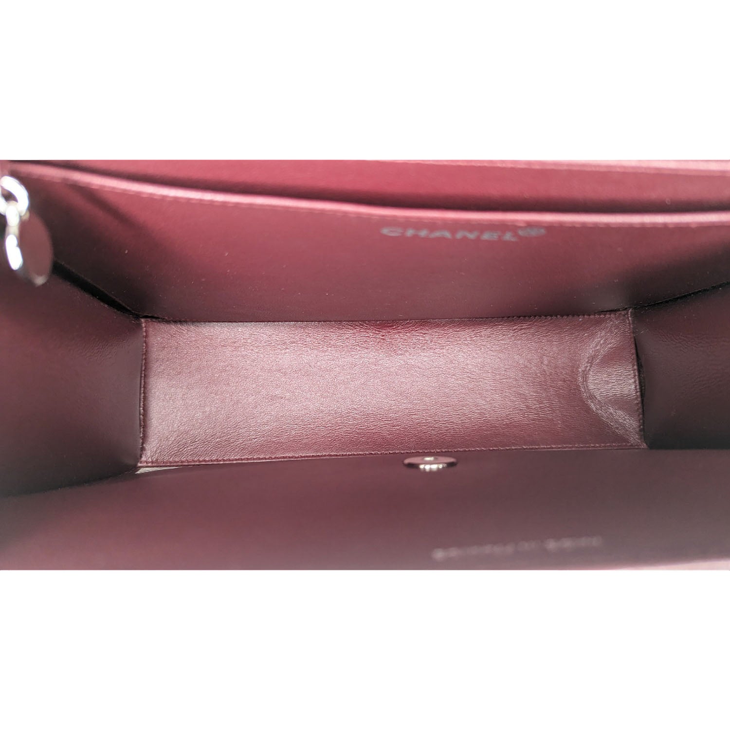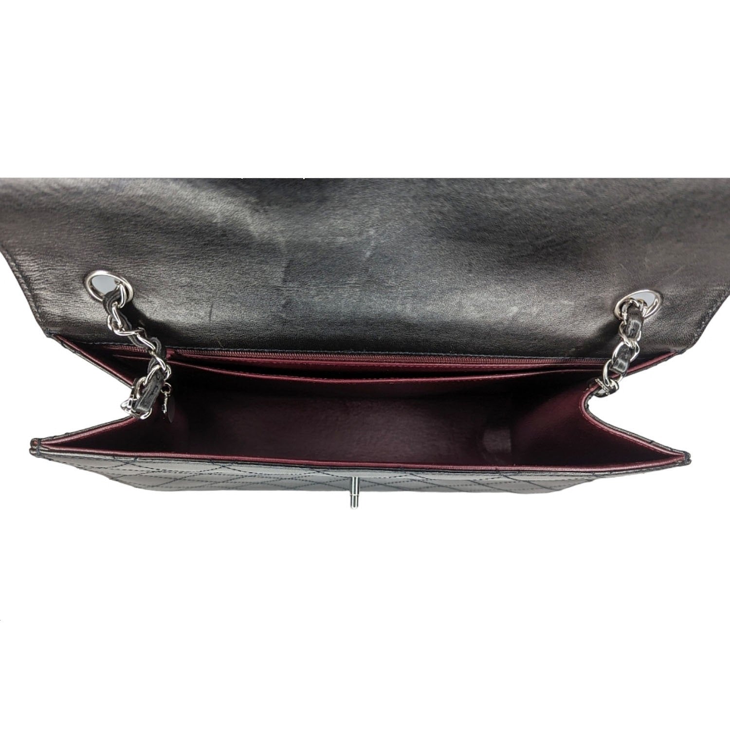 This classic bag is finely composed of luxurious diamond quilted lambskin leather. The bag features a silver chain link leather threaded shoulder strap and a silver Chanel CC turn lock. This opens the front flap to a leather interior with a zipper and patch pockets. Made in France.