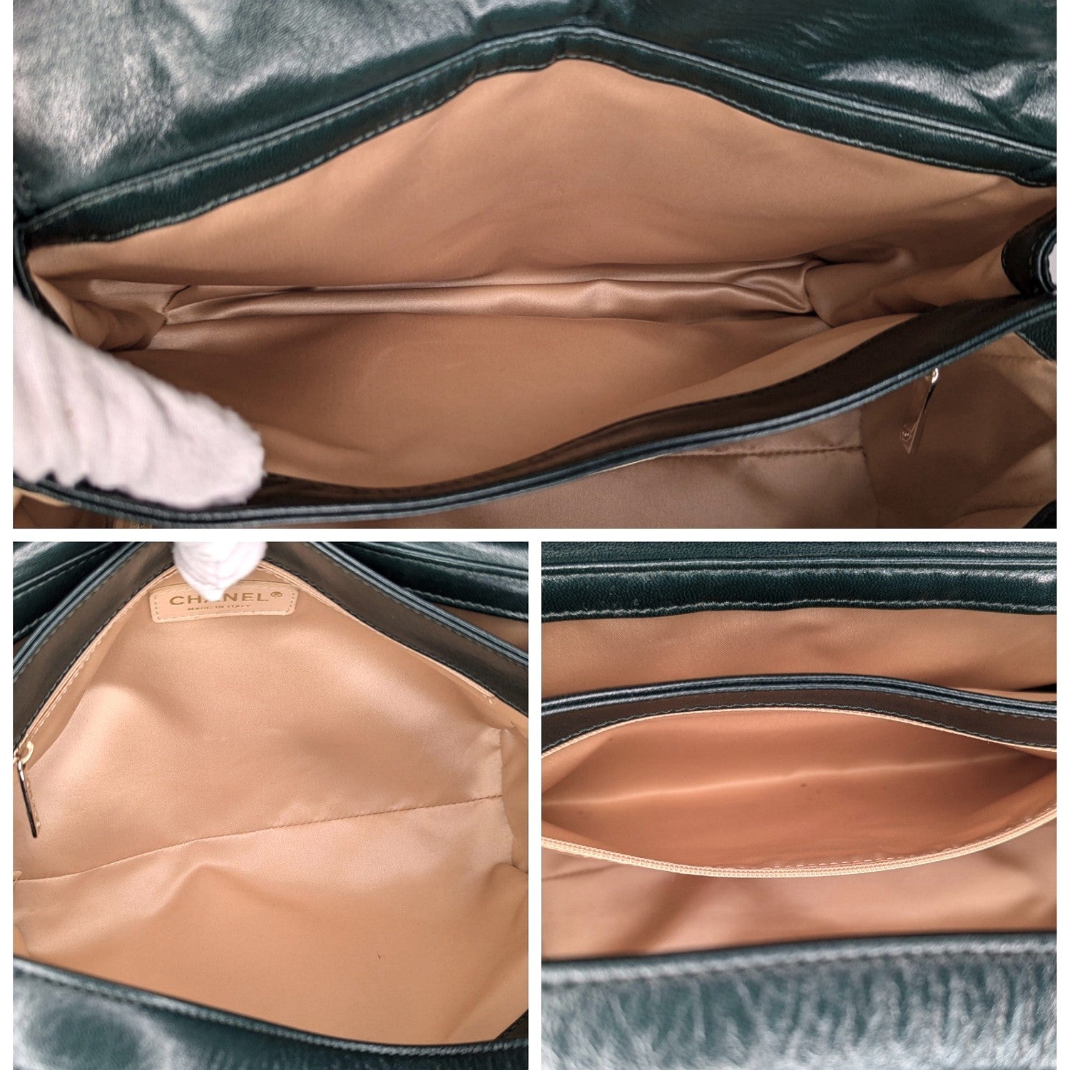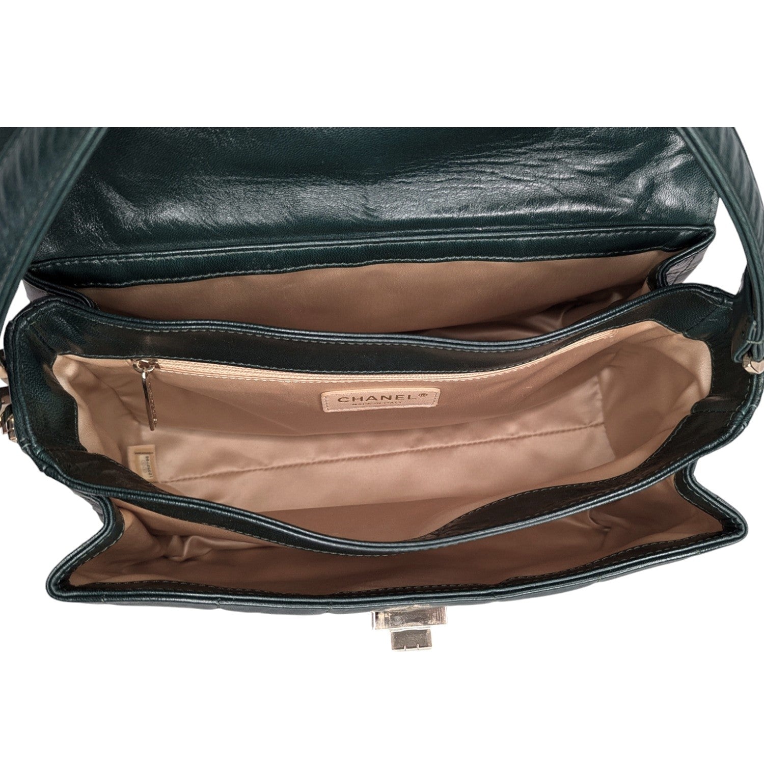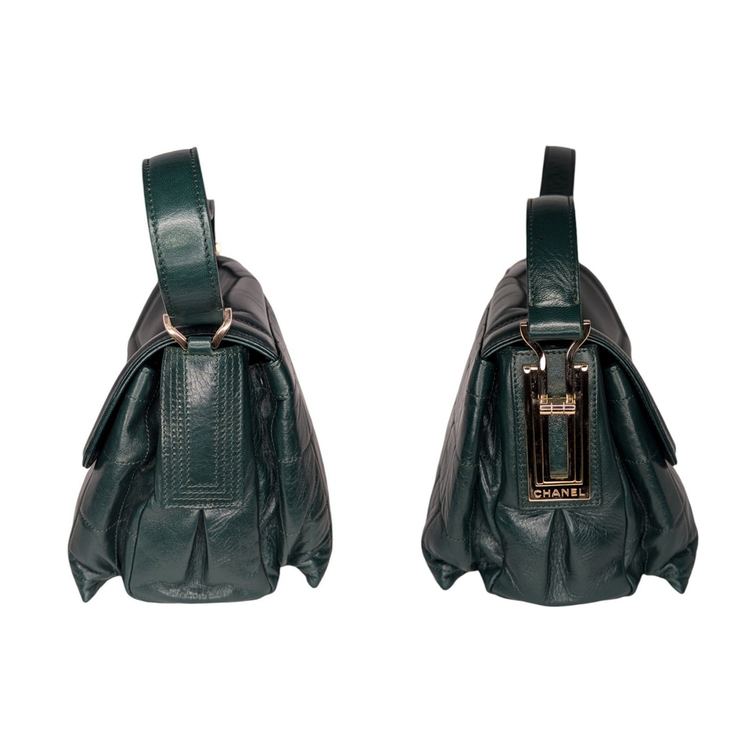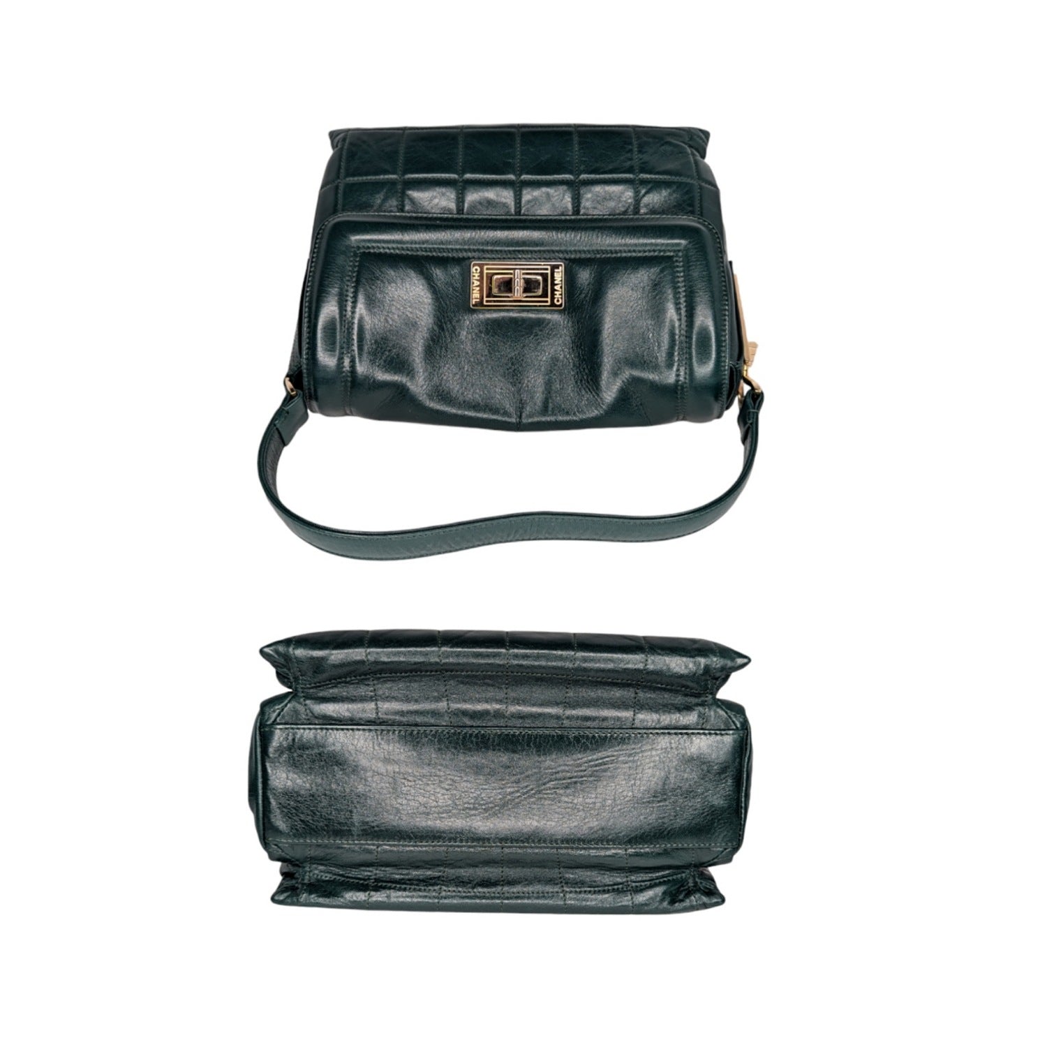 Dark Green quilted lambskin Chanel Square Mademoiselle Flap bag with gold-tone hardware, single flat shoulder strap, three interior compartments; camel satin lining, single zip pocket at interior wall and Mademoiselle turn-lock closure at front flap.