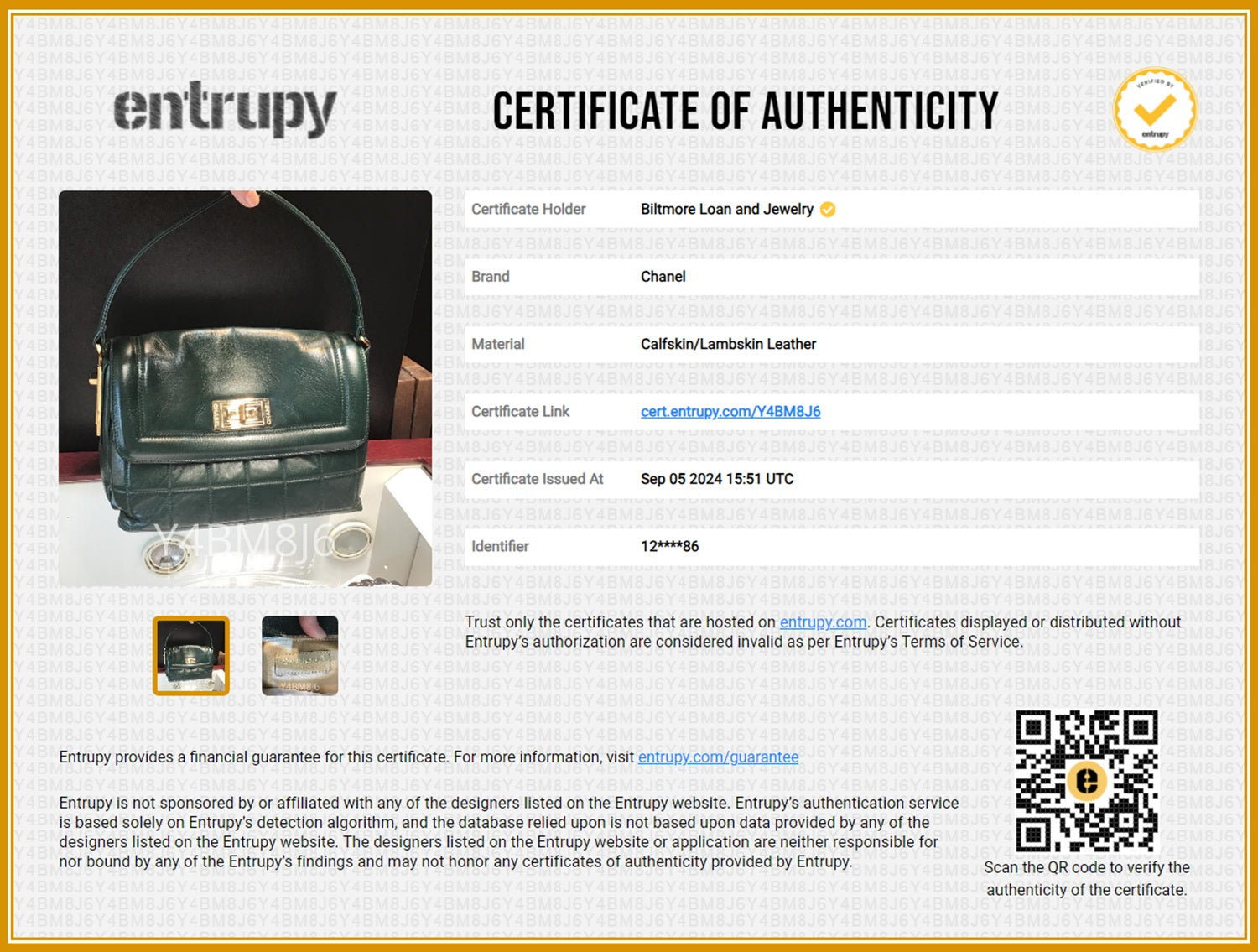 Accompanied By: Chanel dust bag, care booklet, Chanel & Entrupy
