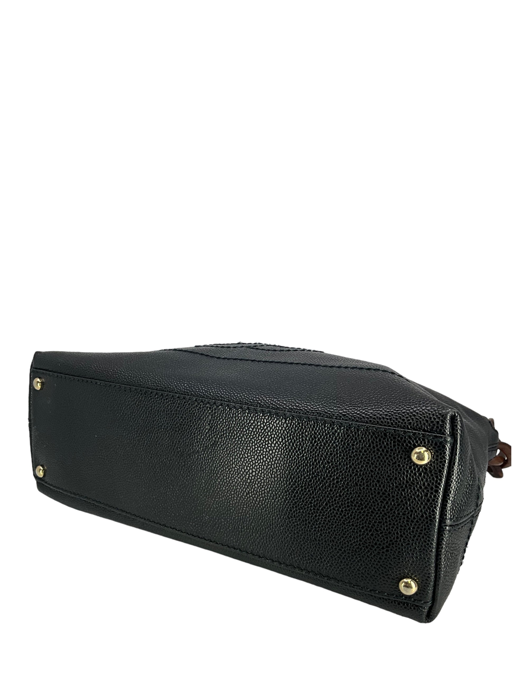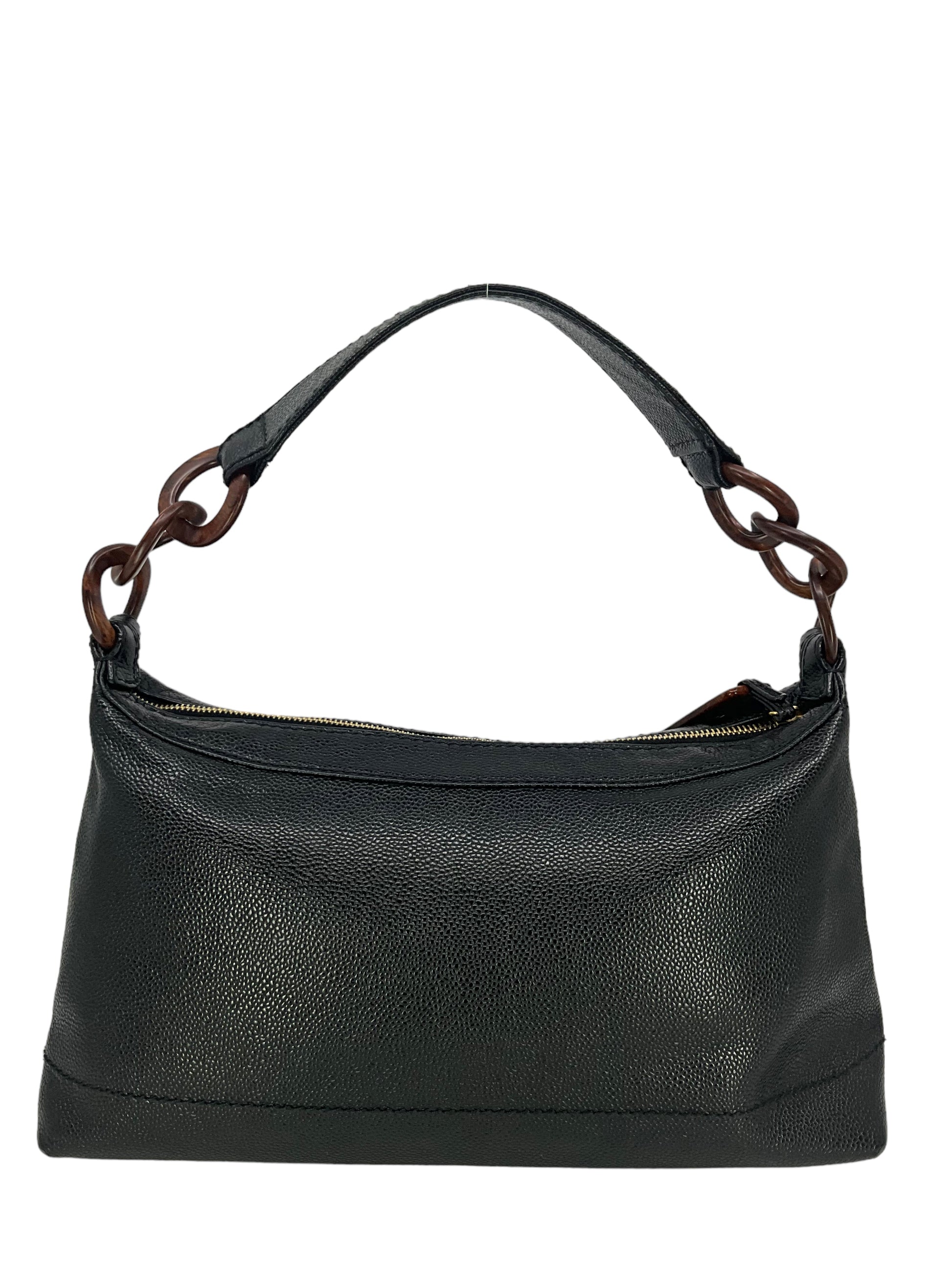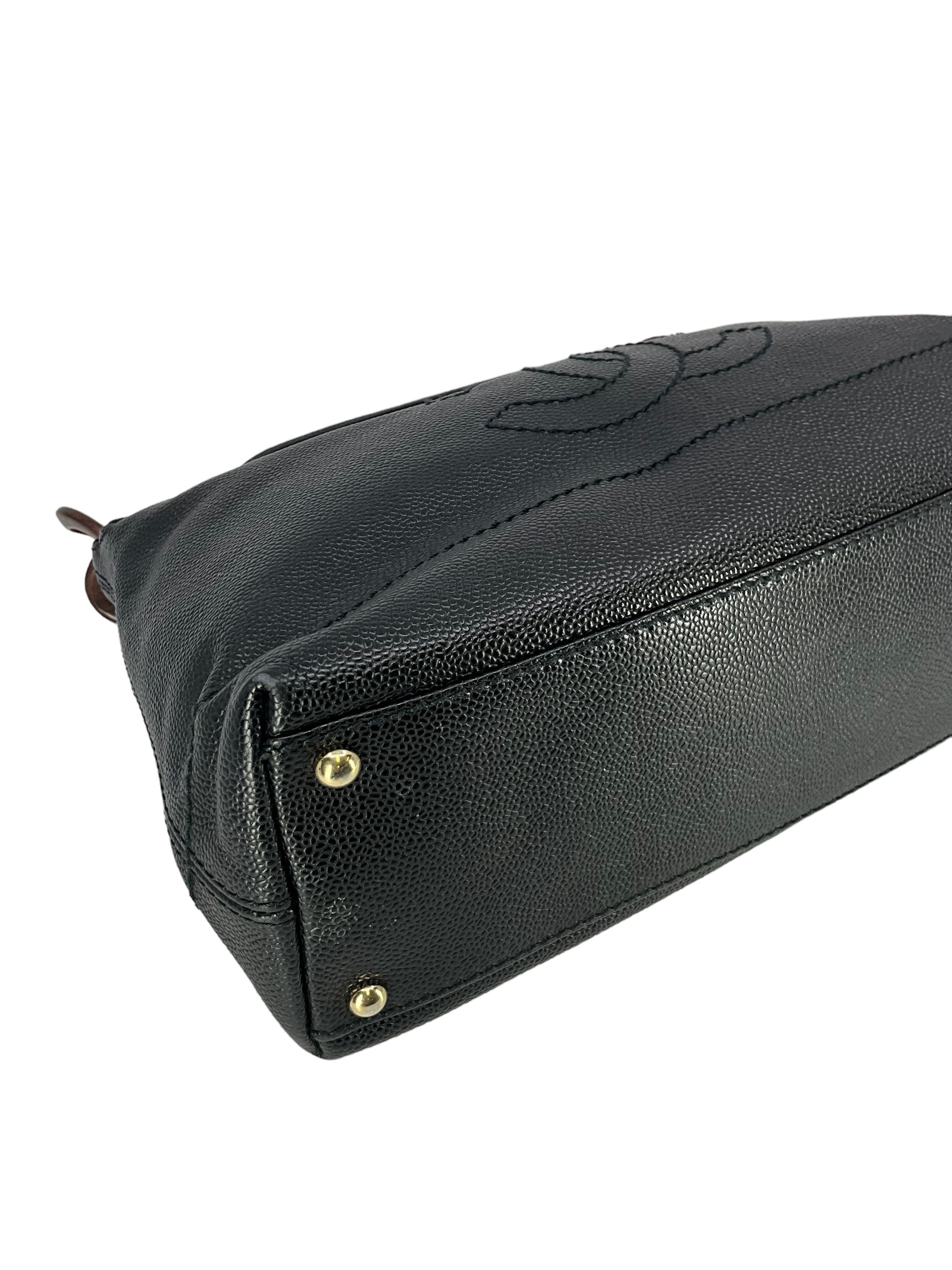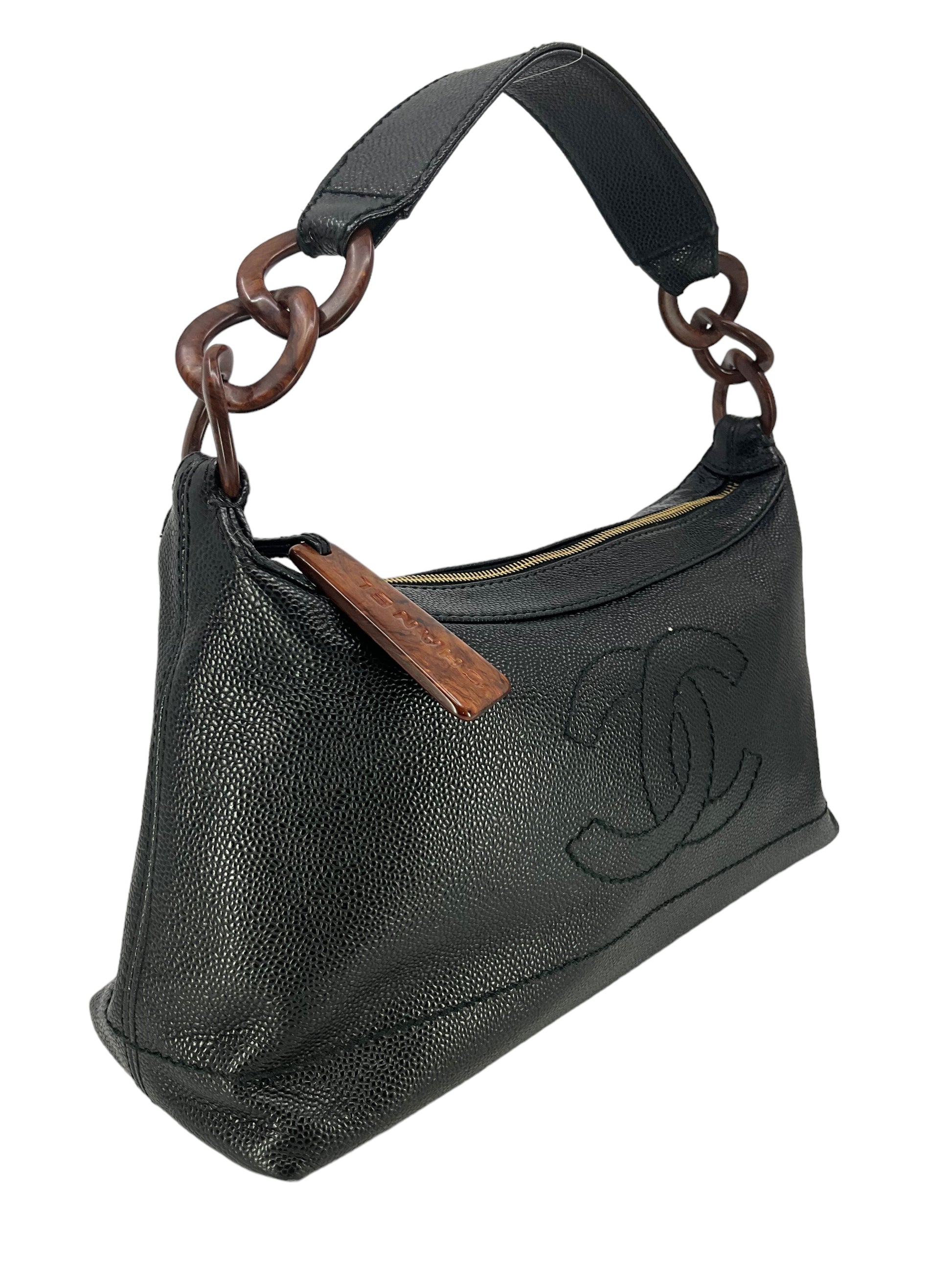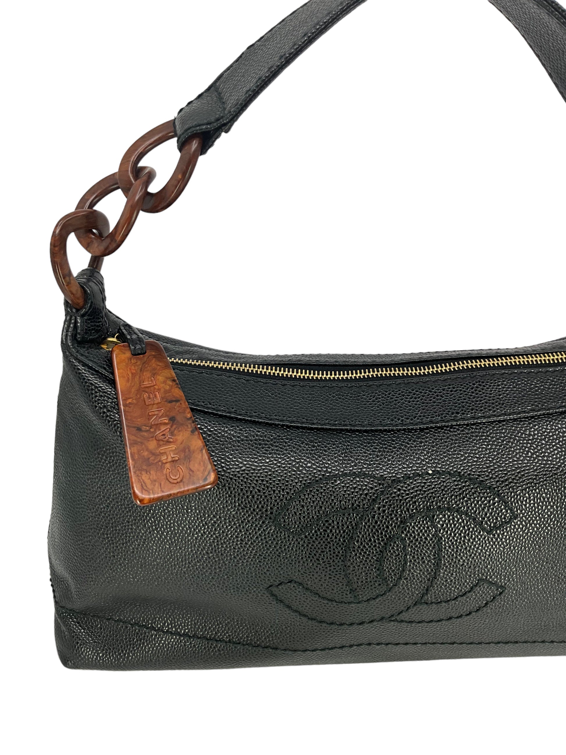 We the ity of this CHANEL Vintage Timeless CC Tortoise Shell Bag crafted from black caviar leather. Featuring a large embossed 'CC' logo at center, a single flat leather shoulder strap with tortoise shell handle links and a single zip closure with a CC logo tortoise shell zip pull.
