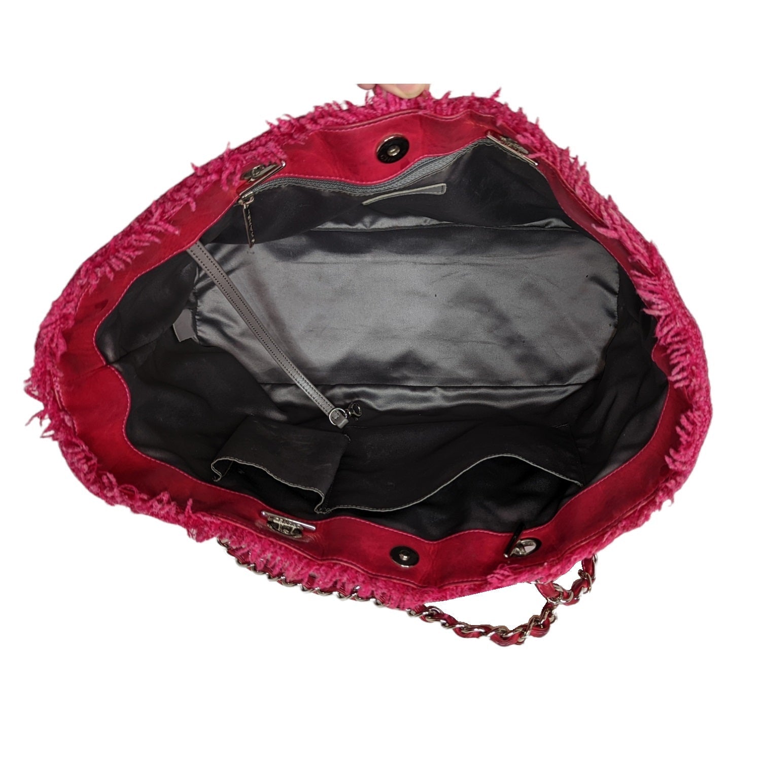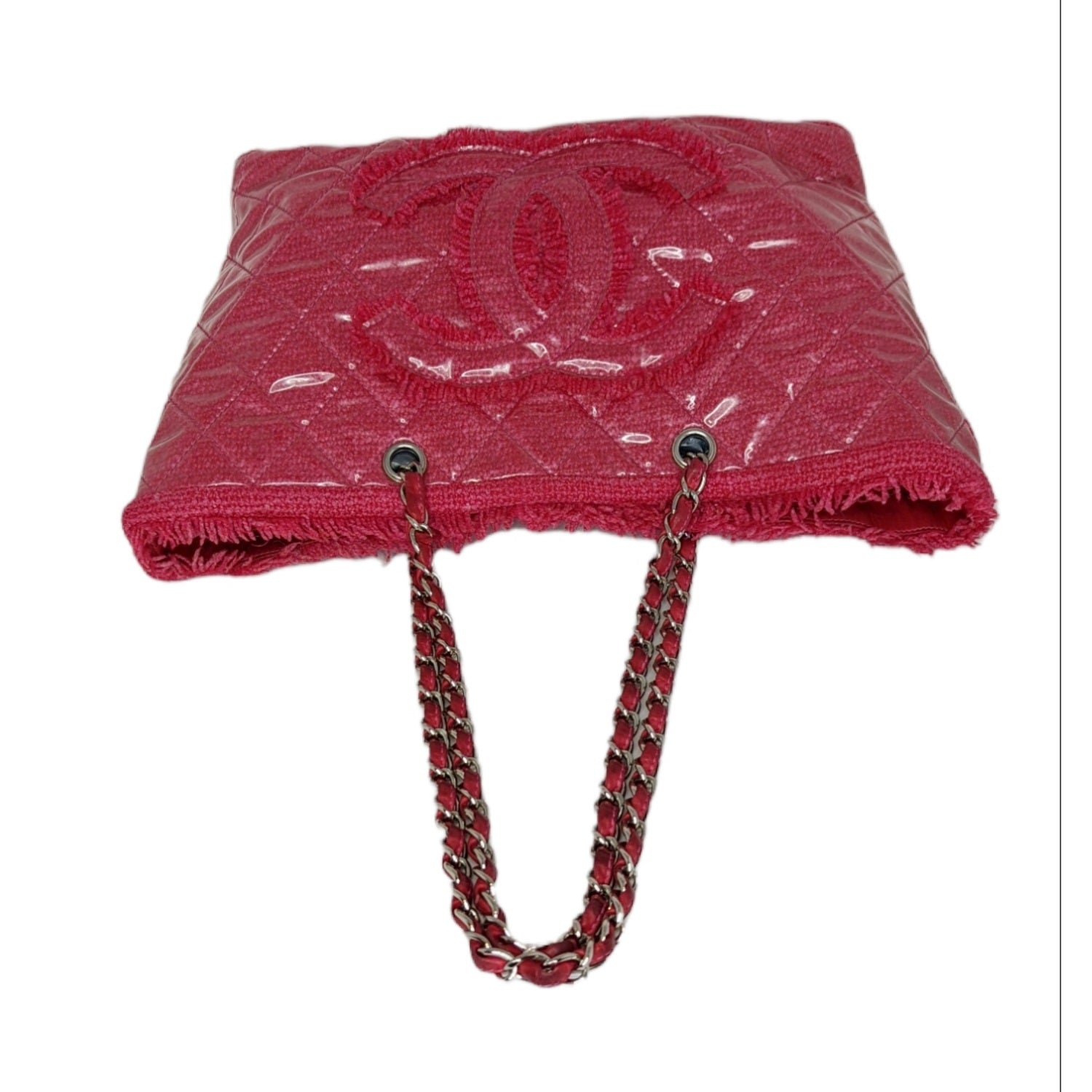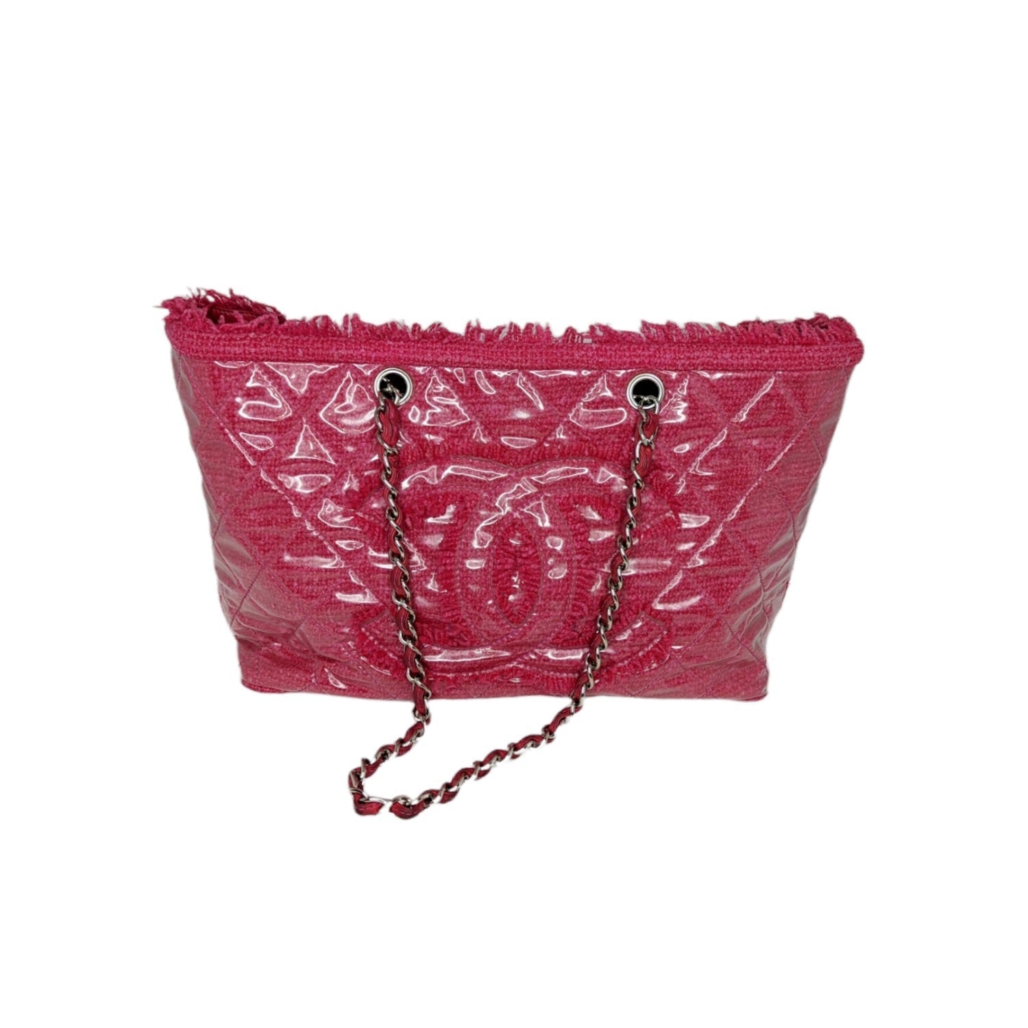 From the Pre-Fall 2009 Collection by Karl Lagerfeld. This chic tote is crafted of pink tweed with frayed edges layered with clear diamond quilted vinyl. There is a large embroidered Chanel CC, and silver chain shoulder straps threaded with pink leather. The top is open to a satin interior with zippered and patch pockets.