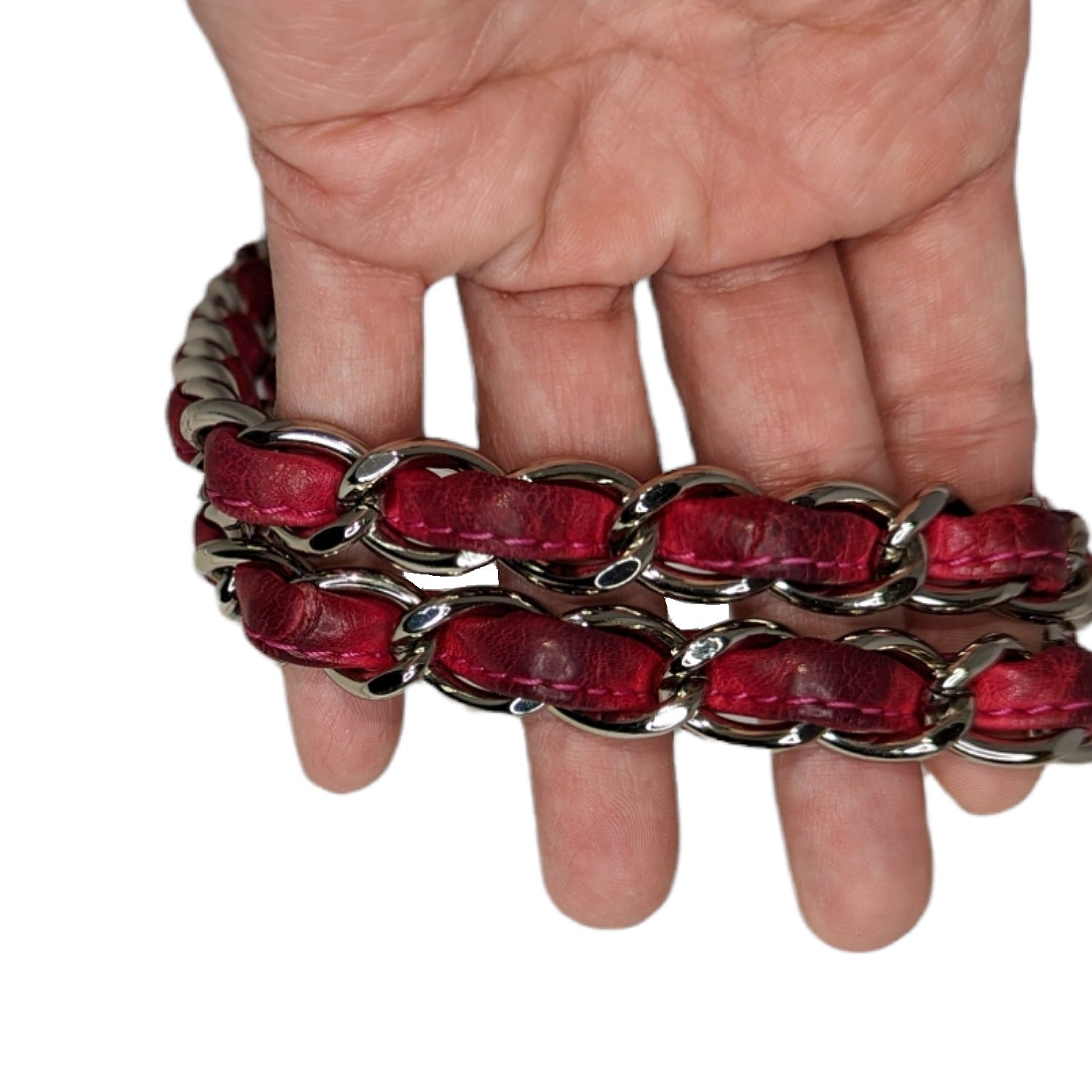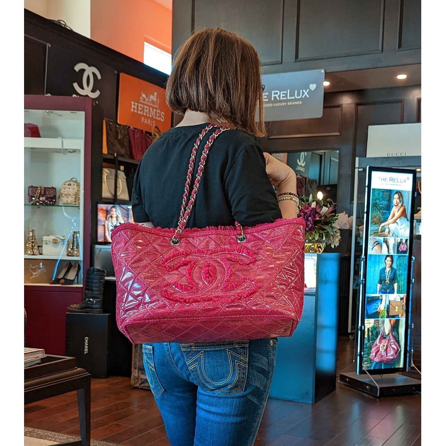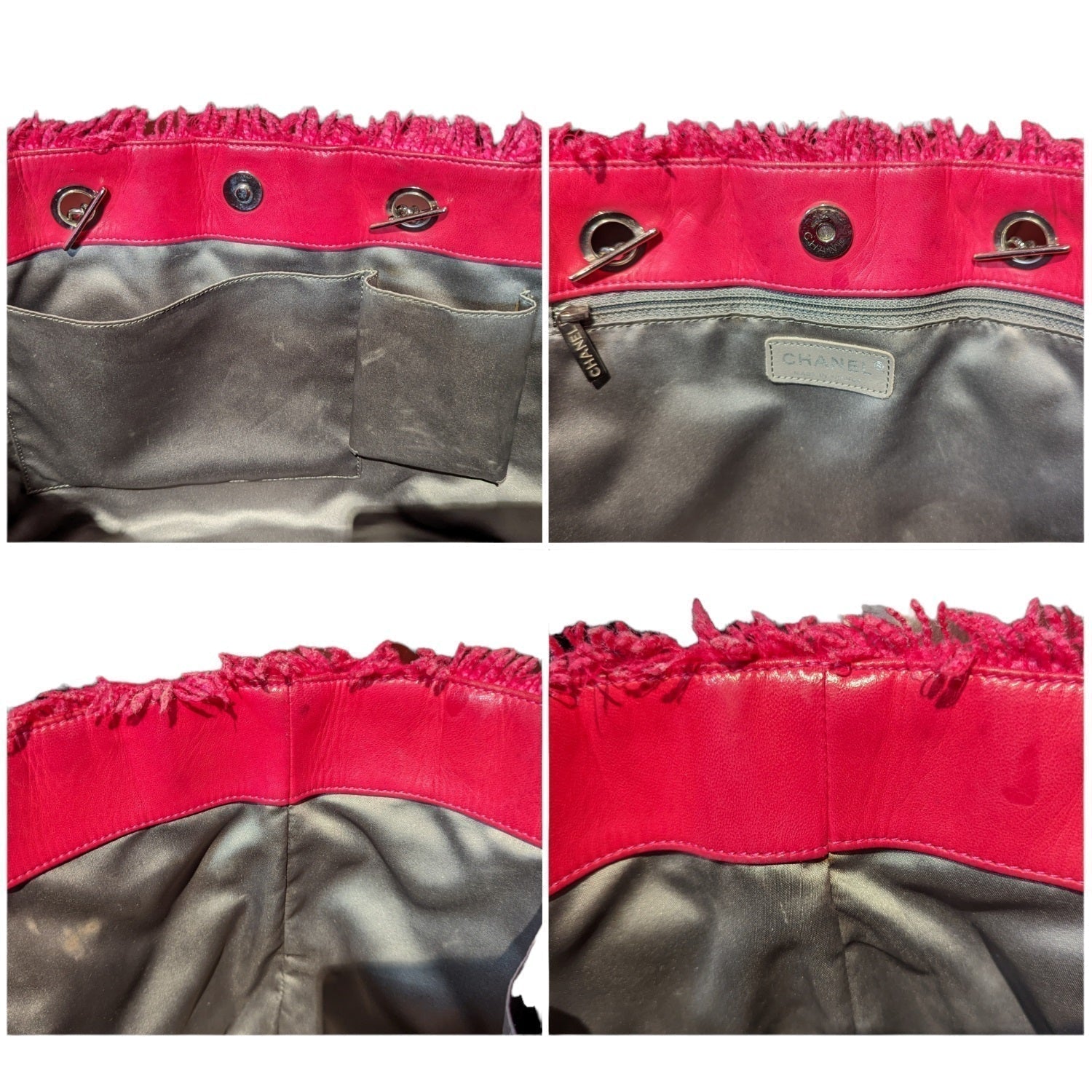 From the Pre-Fall 2009 Collection by Karl Lagerfeld. This chic tote is crafted of pink tweed with frayed edges layered with clear diamond quilted vinyl. There is a large embroidered Chanel CC, and silver chain shoulder straps threaded with pink leather. The top is open to a satin interior with zippered and patch pockets.