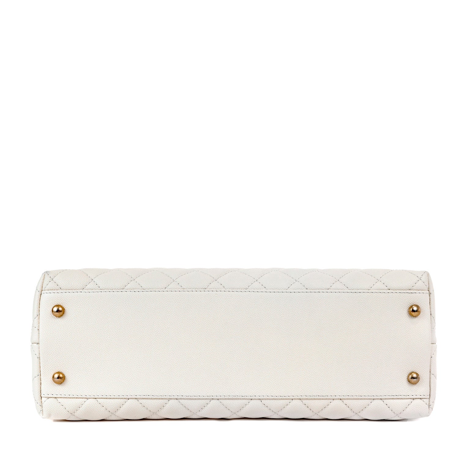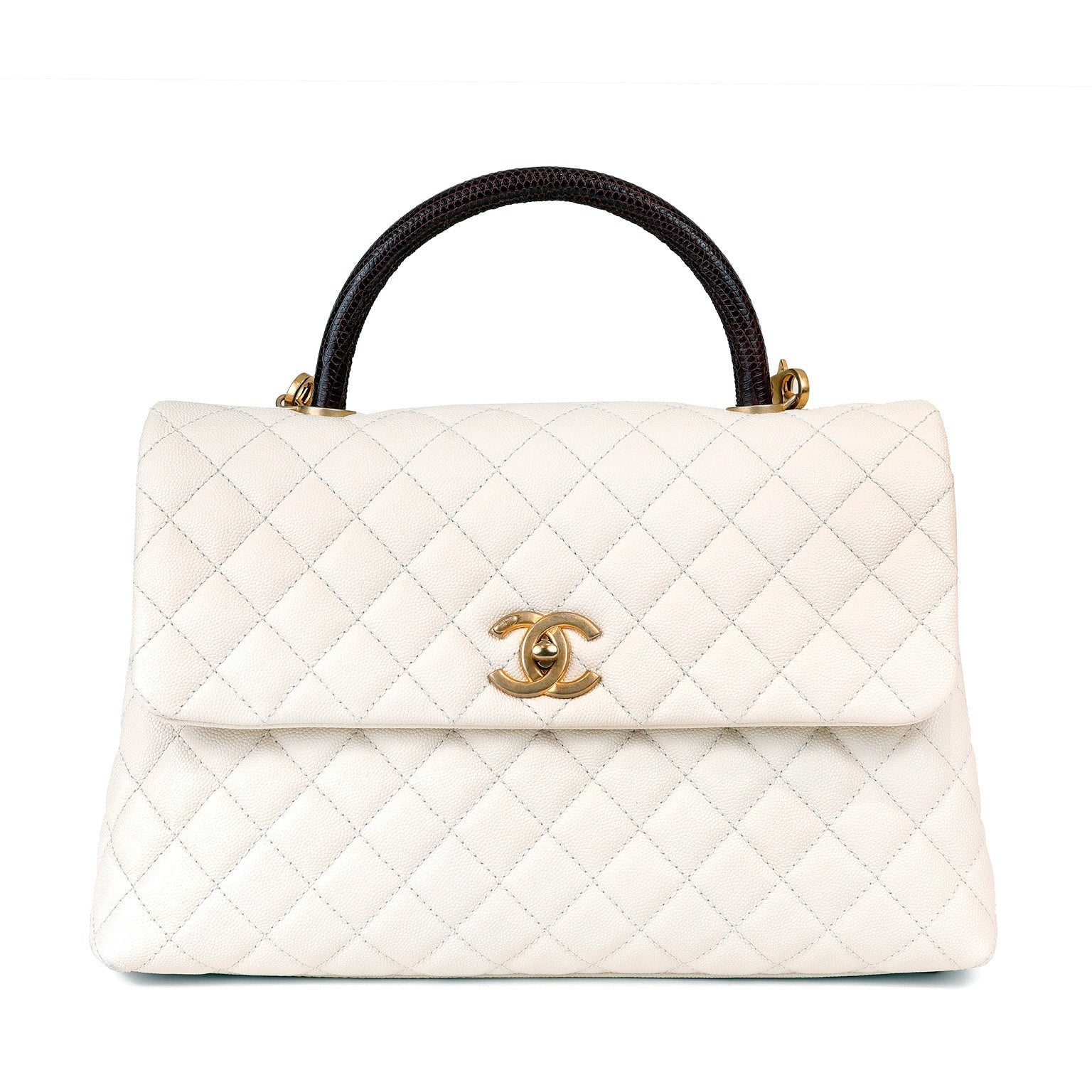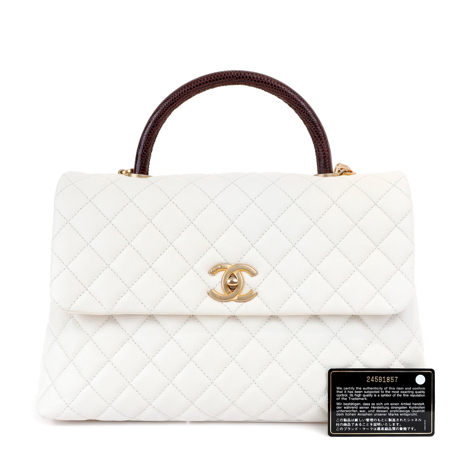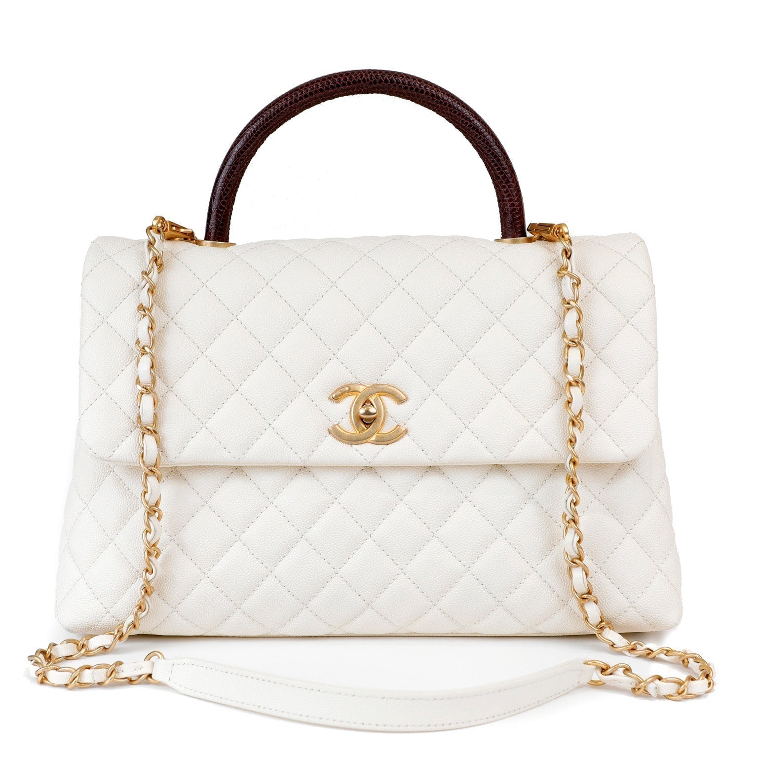 Snowy white caviar leather is textured and durable.Quilted in signature Chanel diamond pattern with aged gold interlocking CC twist lock closure. Carried by the contrasting lizard skin top handle or the detachable leather and chain entwined shoulder strap.Leather interior and protective footed bottom.Dust bag included.