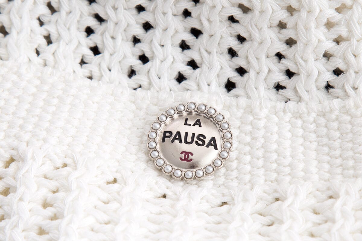 Chanel White Knit Cardigan Sweater with "La Pausa" Buttons. This item is in very New condition.