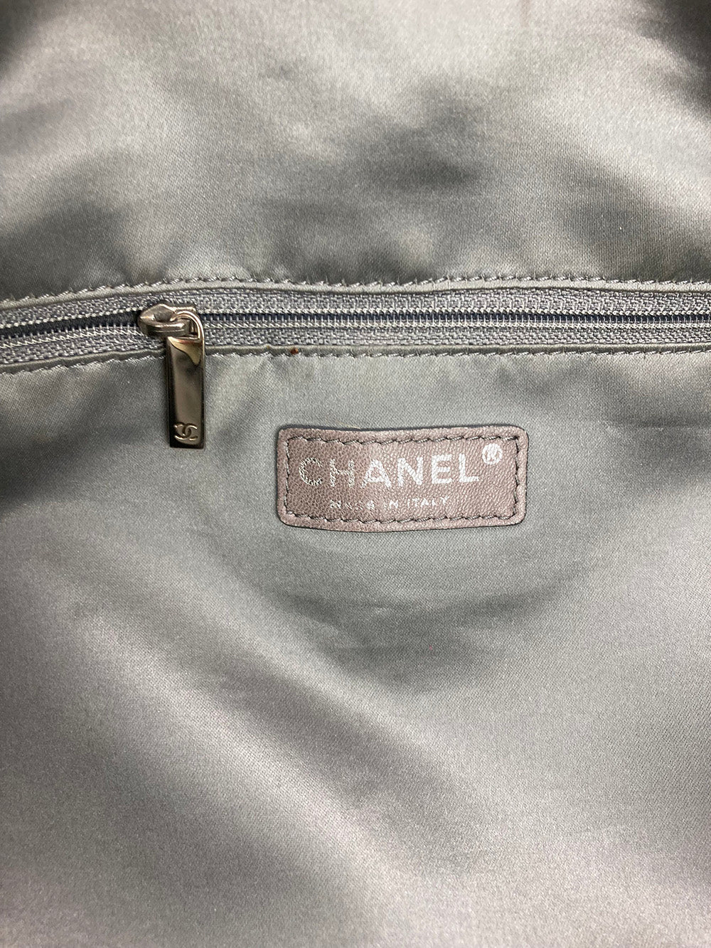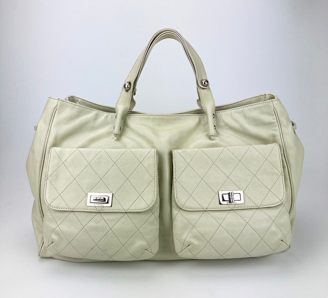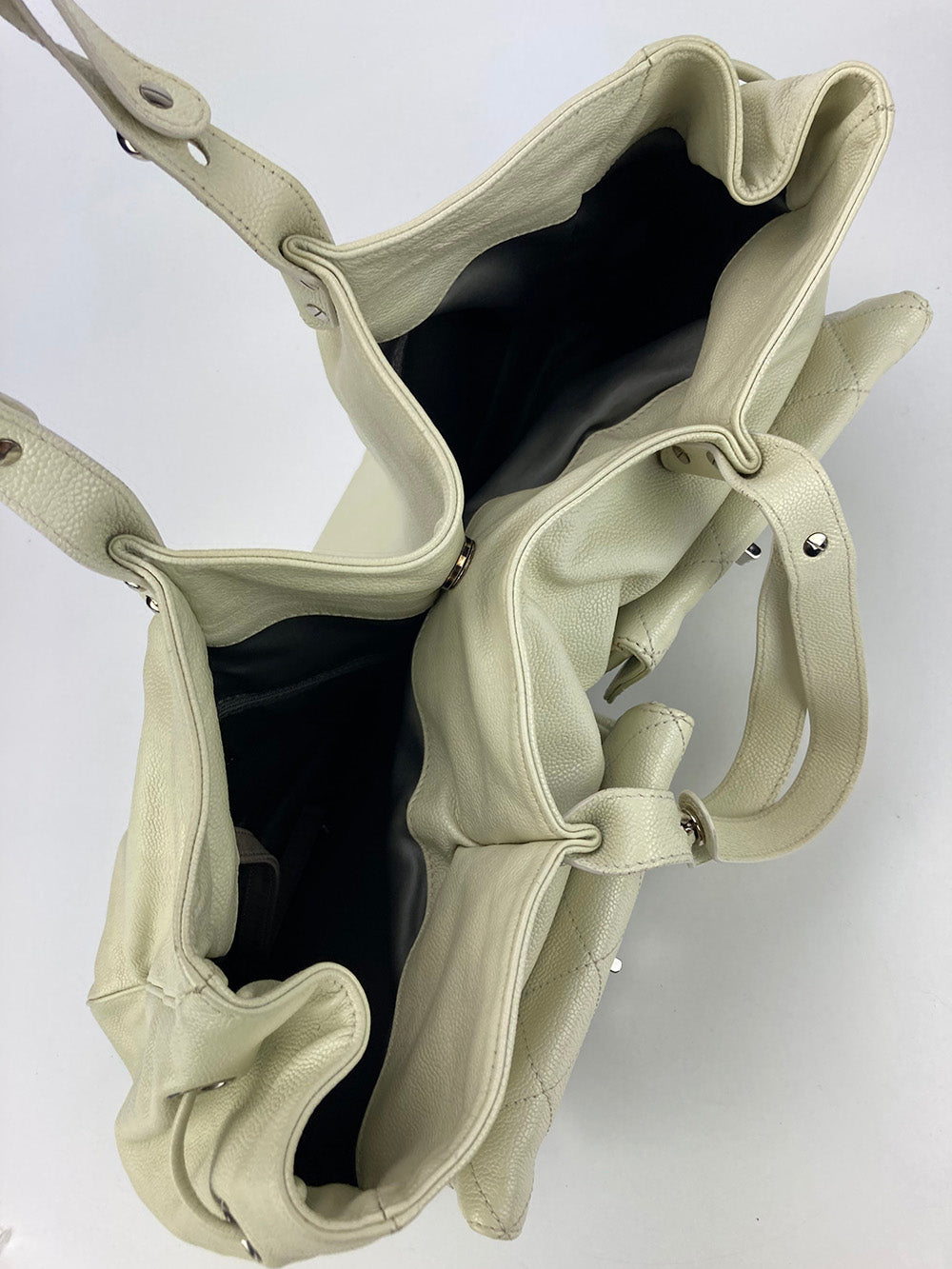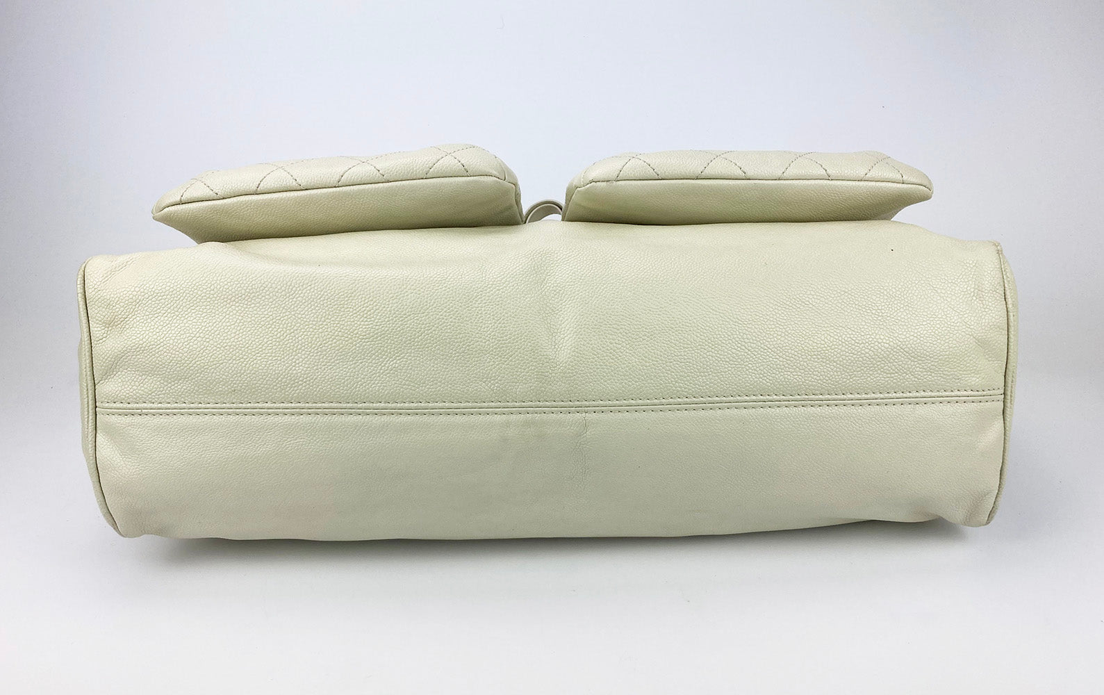Chanel White Caviar Pocket in the City Large Tote in very New condition. Cream white glazed caviar exterior trimmed with silver hardware and two front flap pockets with mademoiselle twist locks. Top snap closure opens to a gray satin lined interior with ample storage space, one zipped side pocket and a leather key strap. Overall very New condition. Clean corners and edges. A few make up marks and scuffs throughout interior. see photos. Top handles can turn into shoulder straps. Purchase includes a dust cover. measurements: 18x12x6" 7-12" strap drop