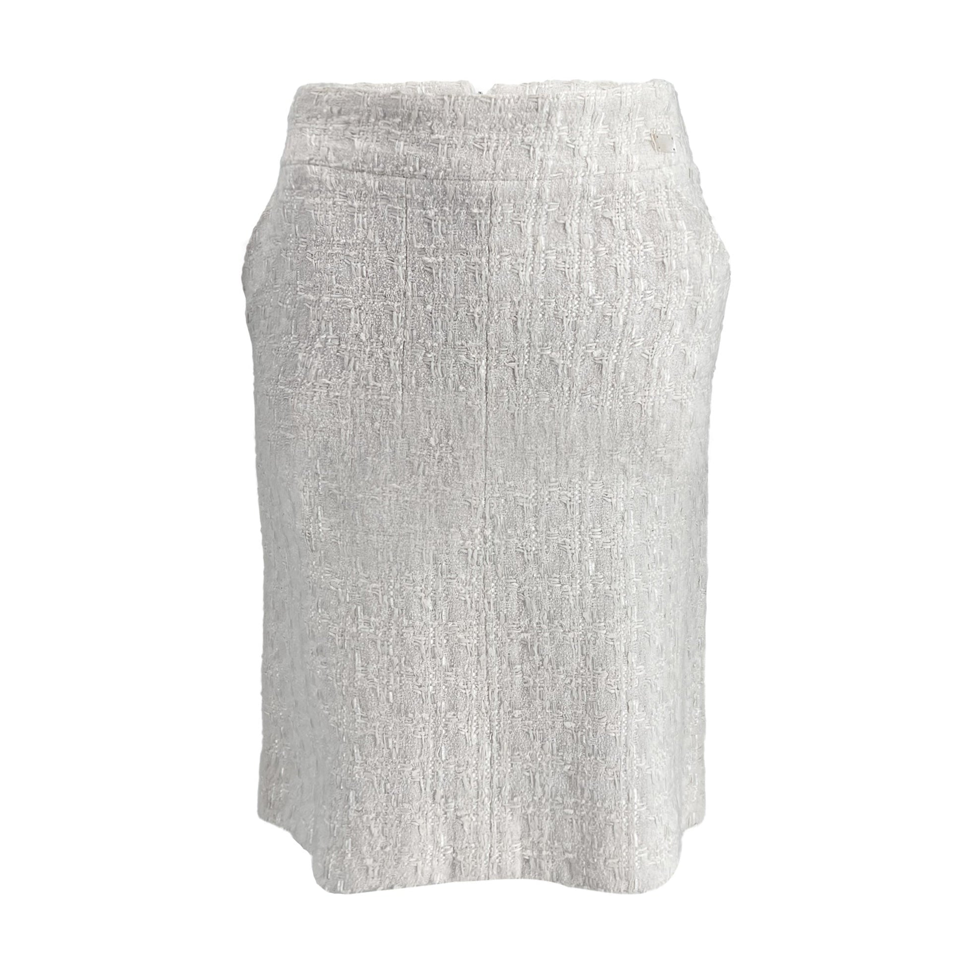 White tweed Chanel skirt featuring distressed hem design, hidden rear zip closure & iconic CHANEL pearl -like hardware on front left of the skirt.