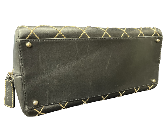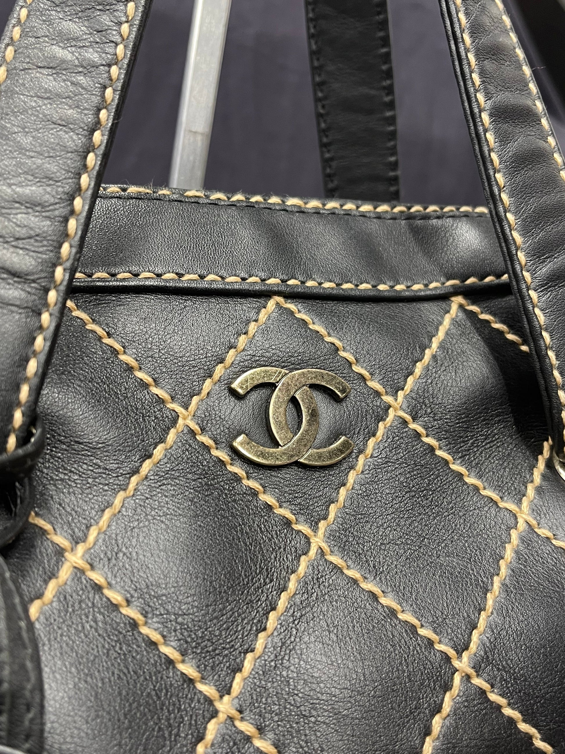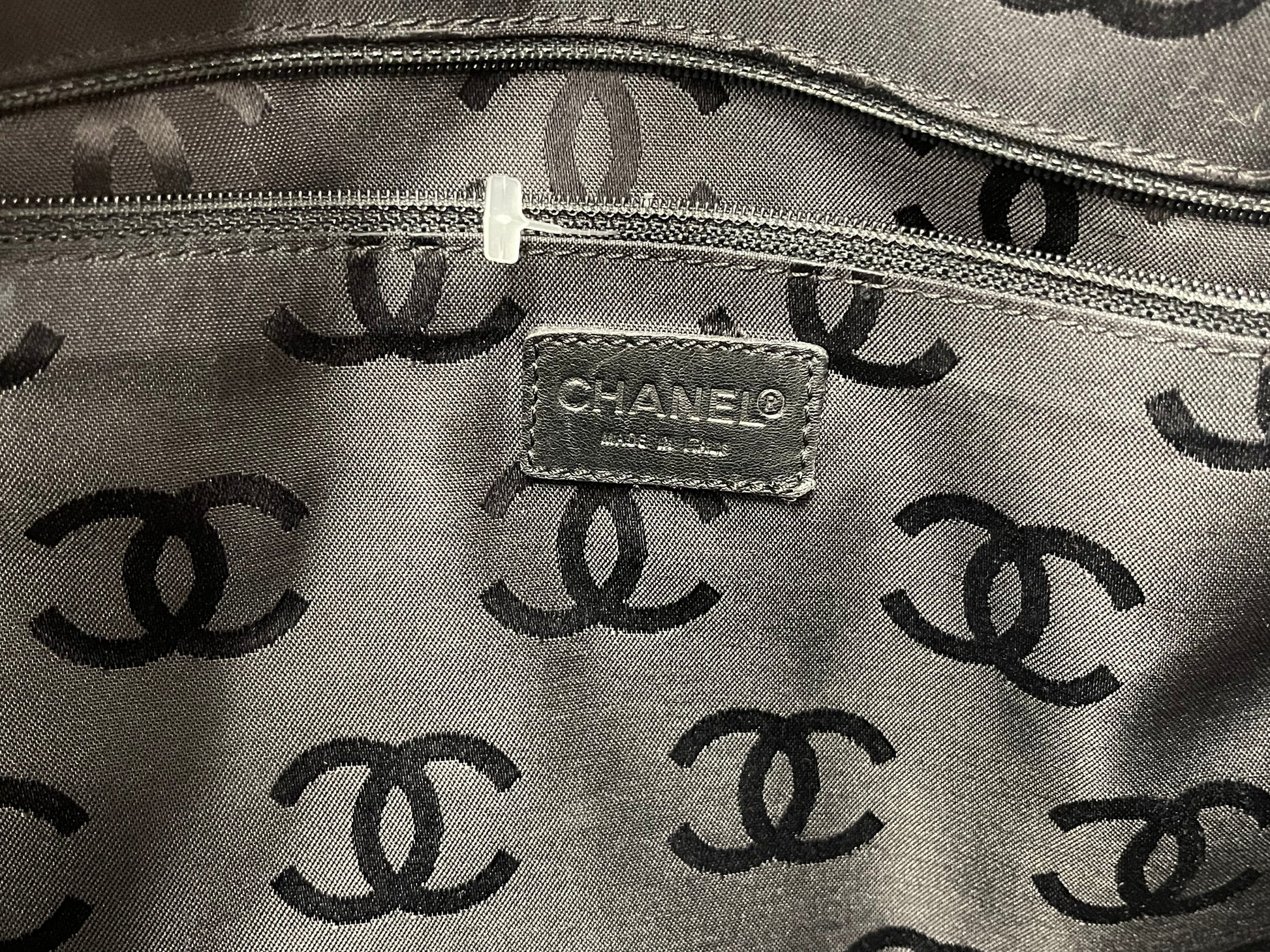 Stunning black leather quilted tote accented with a signature interlocking CC logo and lined with logo along interior for a classic unforgettable look. Multiple zipper compartments including along back and internally. Internal logo patch photographed. Finishedwith silver-toned hardware.